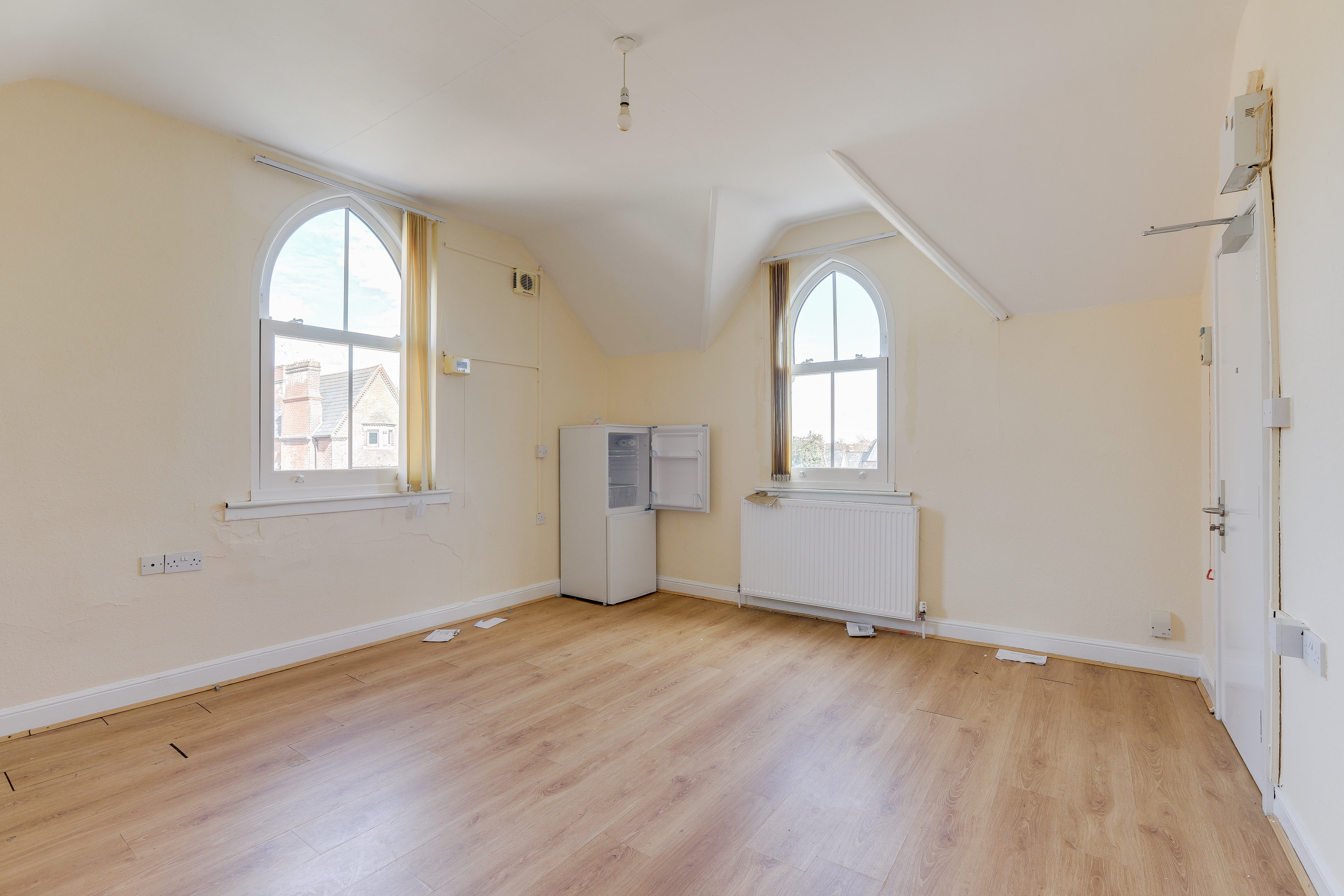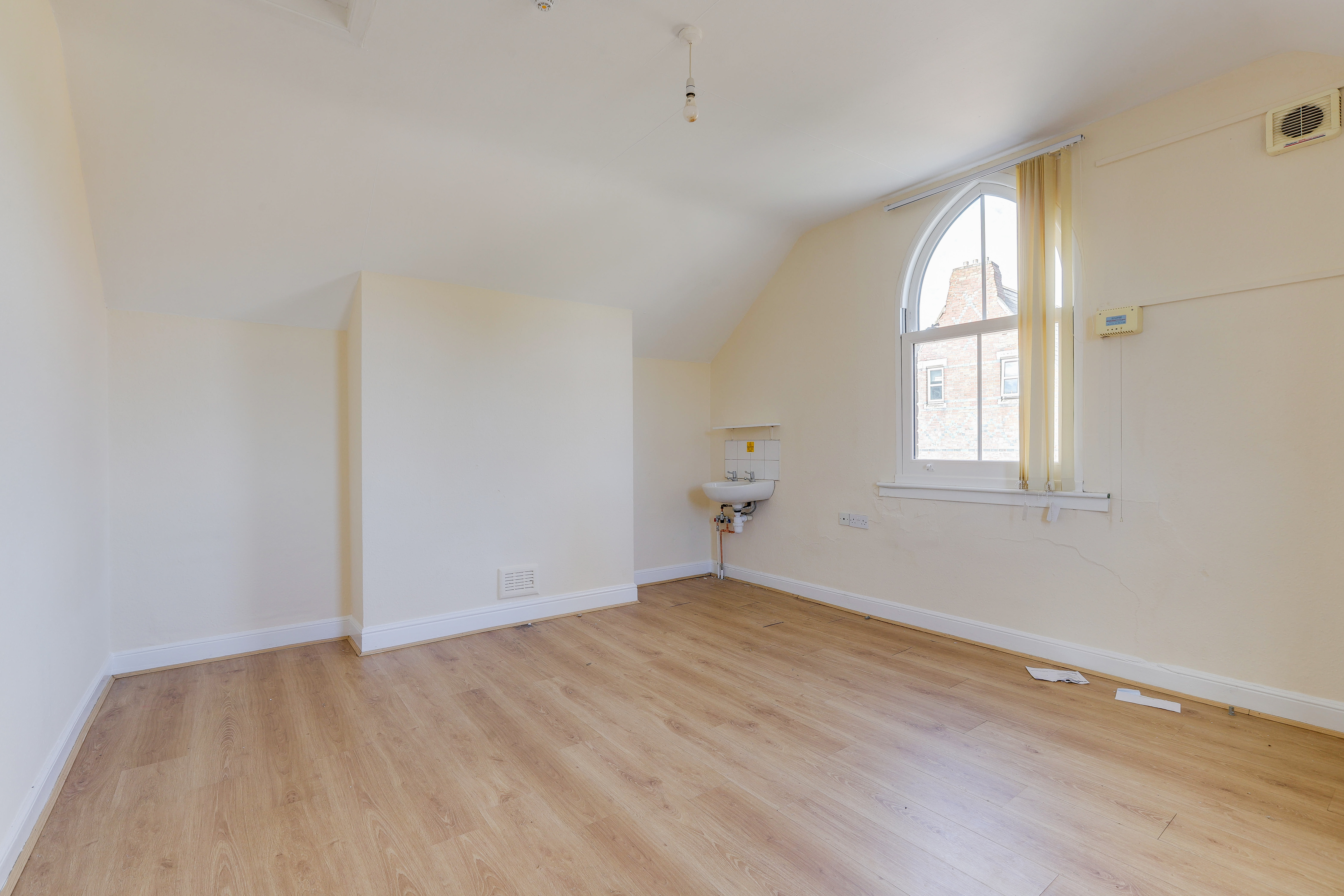 The third bedroom has two arched double-glazed sliding sash windows to the front and side elevation, wood-effect flooring, a wall-hung wash basin with tiled splashback, a radiator, and a loft hatch.