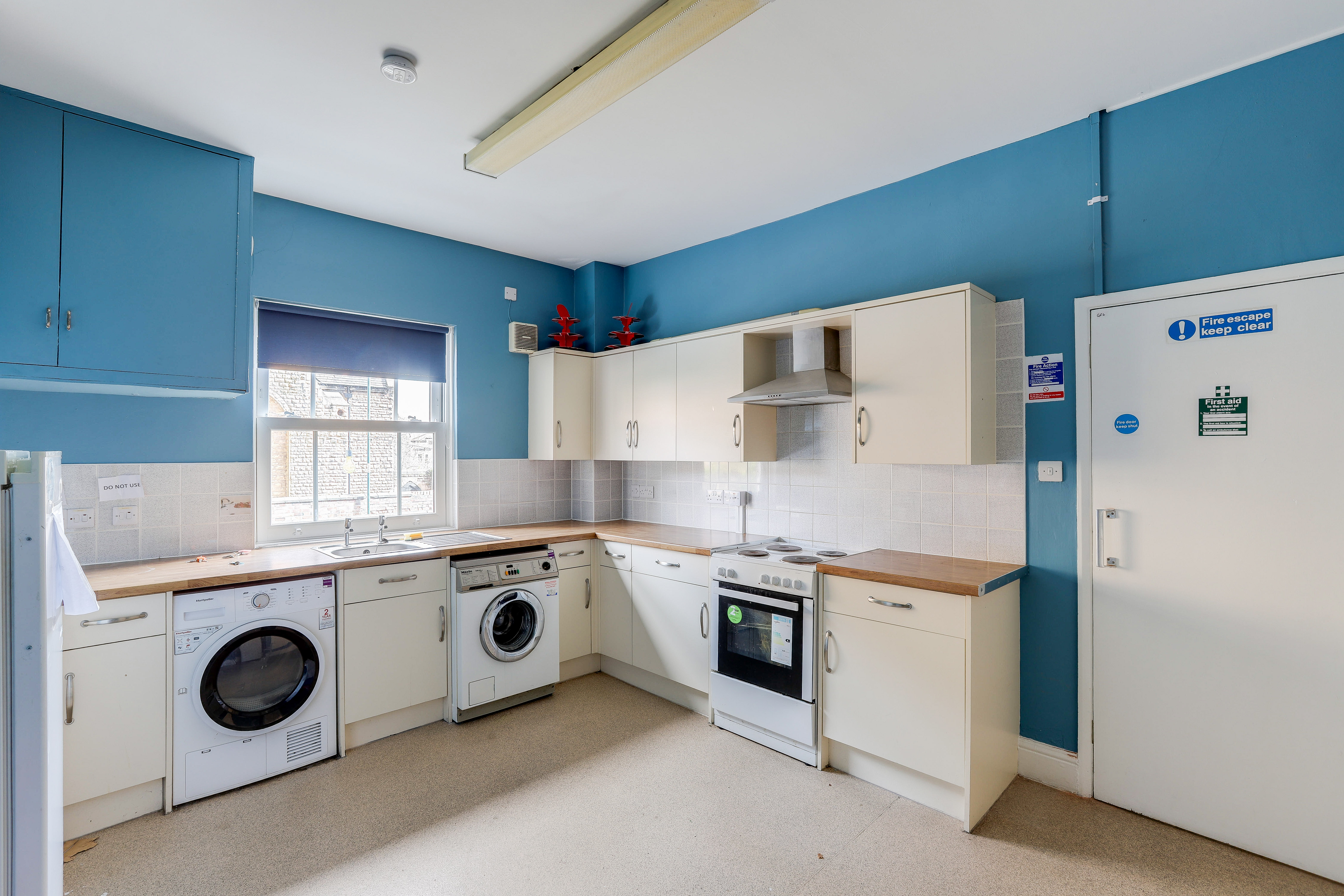 The kitchen has a range of fitted base and wall units with rolled-edge worktops, a stainless steel sink with taps and drainer, space for a freestanding oven with an extractor hood, space for a freestanding fridge freezer, washing machine and tumble-dryer, tiled splashback, vinyl flooring, a radiator, and a double-glazed sliding sash window to the side elevation.