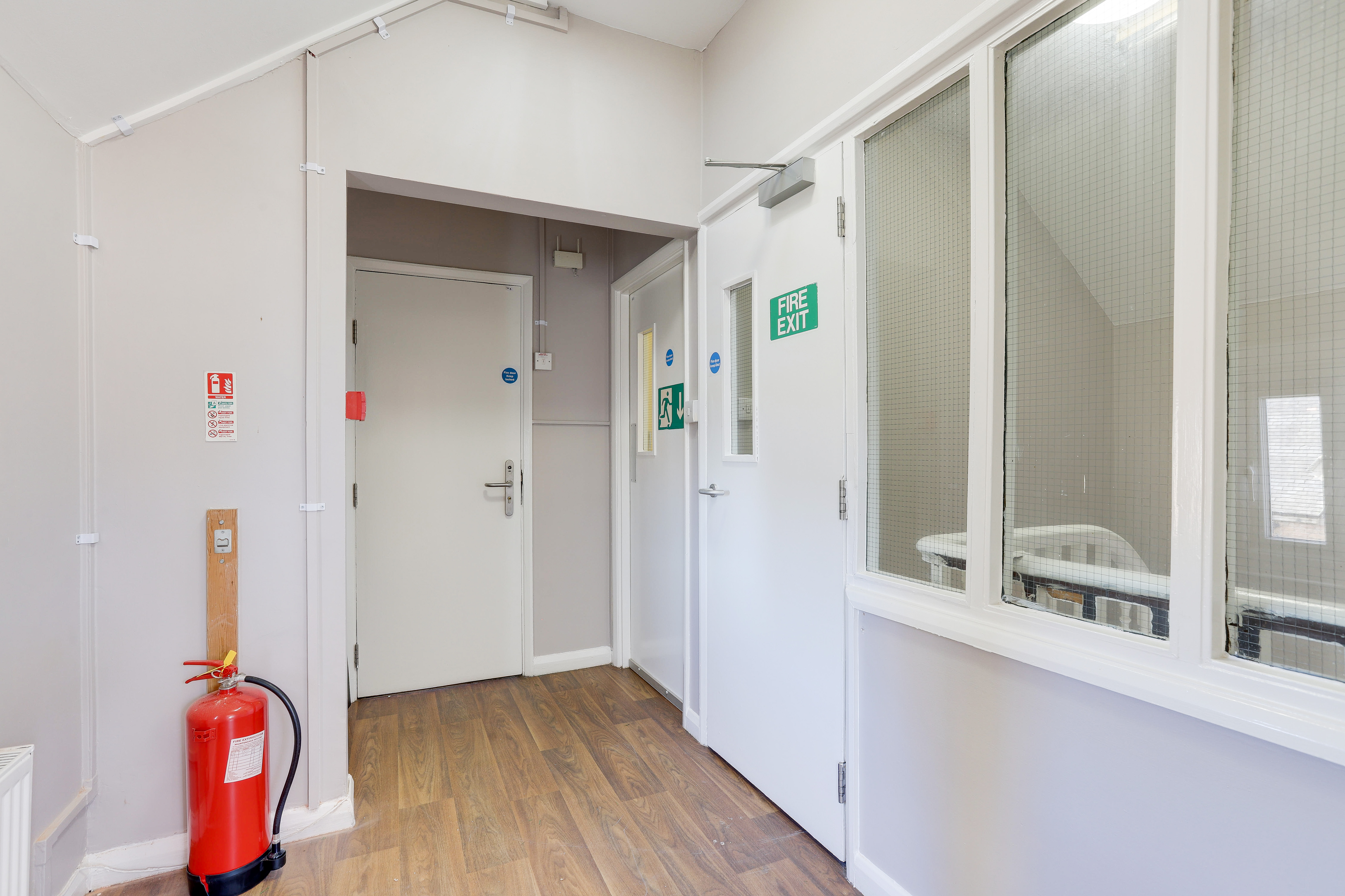 The rear corridor has a radiator, wood-effect flooring, a UPVC double-glazed window to the side elevation, and a single fire door with a bar providing access outdoors.