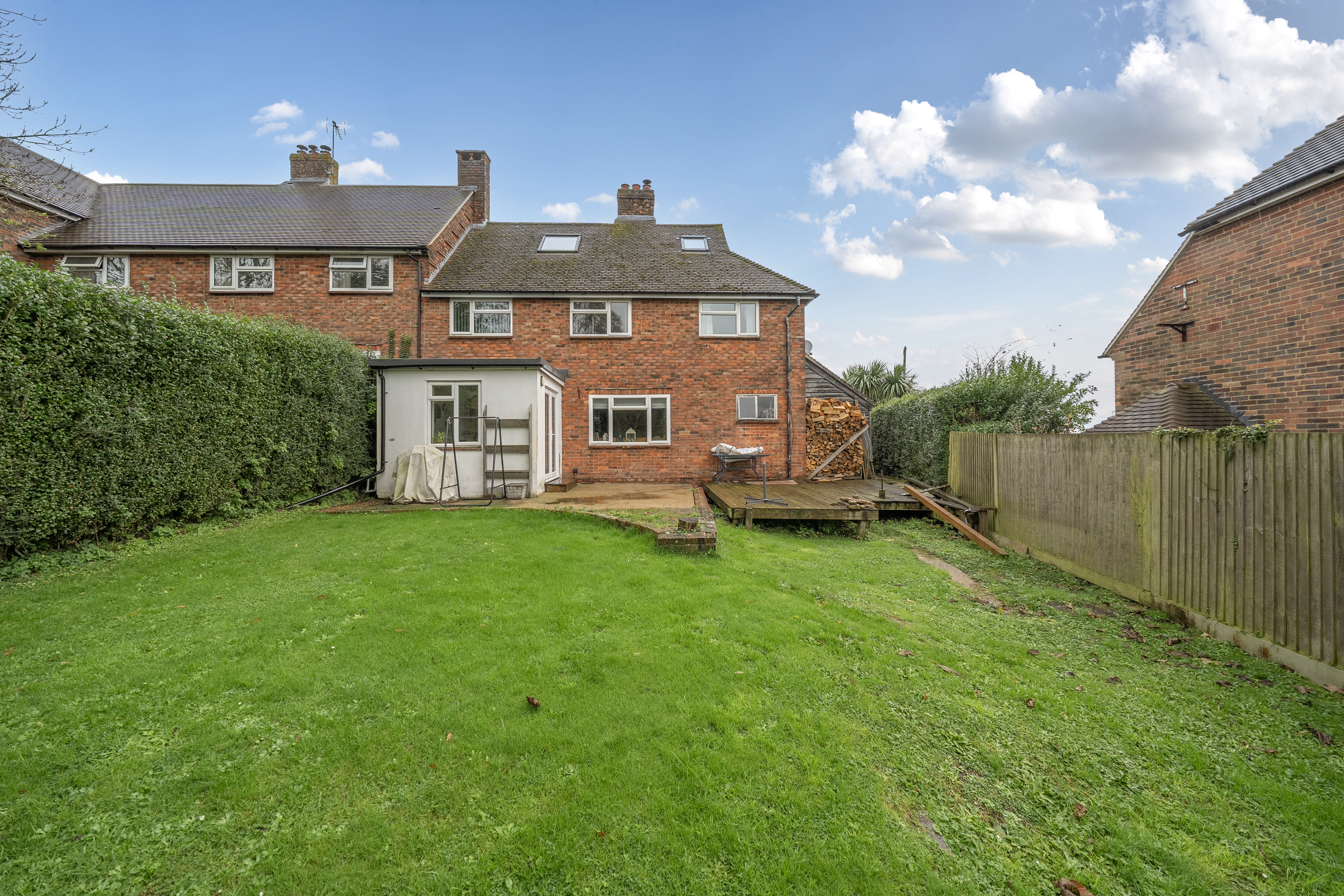 A large rear garden with a decked area to the immediate rear, leading to a large square area of lawn.