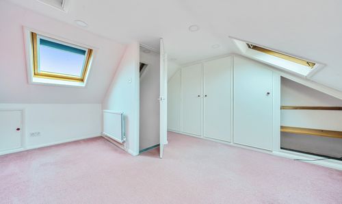 Accessed via stairs from first floor. Wooden flooring, two double glazed Velux windows with one to front and one to rear, both offering views over fields and into the Brede Valley, an array of storage cupboards into the eaves with hanging rail and shelving, radiator. Access to: