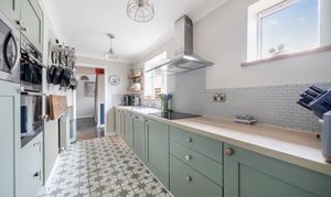 Tiled flooring, two double glazed window to front, a range of matching base units, recessed integral AEG double oven, recessed integral microwave, integrated dishwasher, induction hob with cooker hood over, sink with side drainer, radiator. Door to: