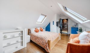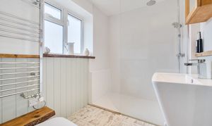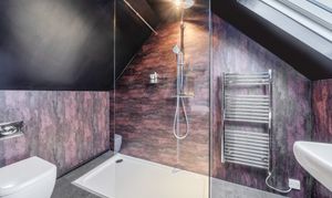 Laminate flooring, double glazed Velux window to rear, large walk-in shower, WC with concealed cistern, wash hand basin, heated towel rail.