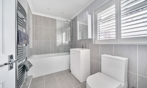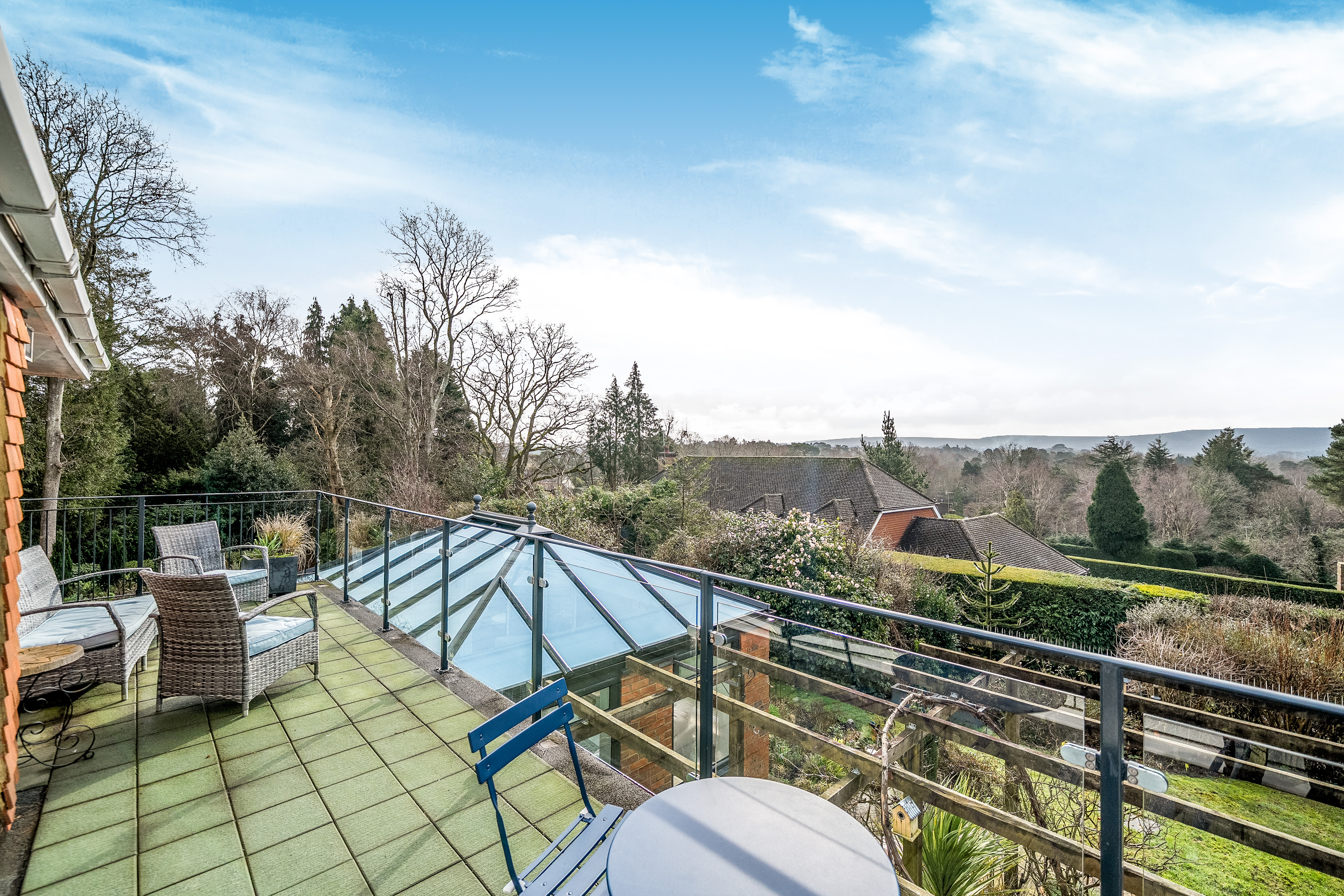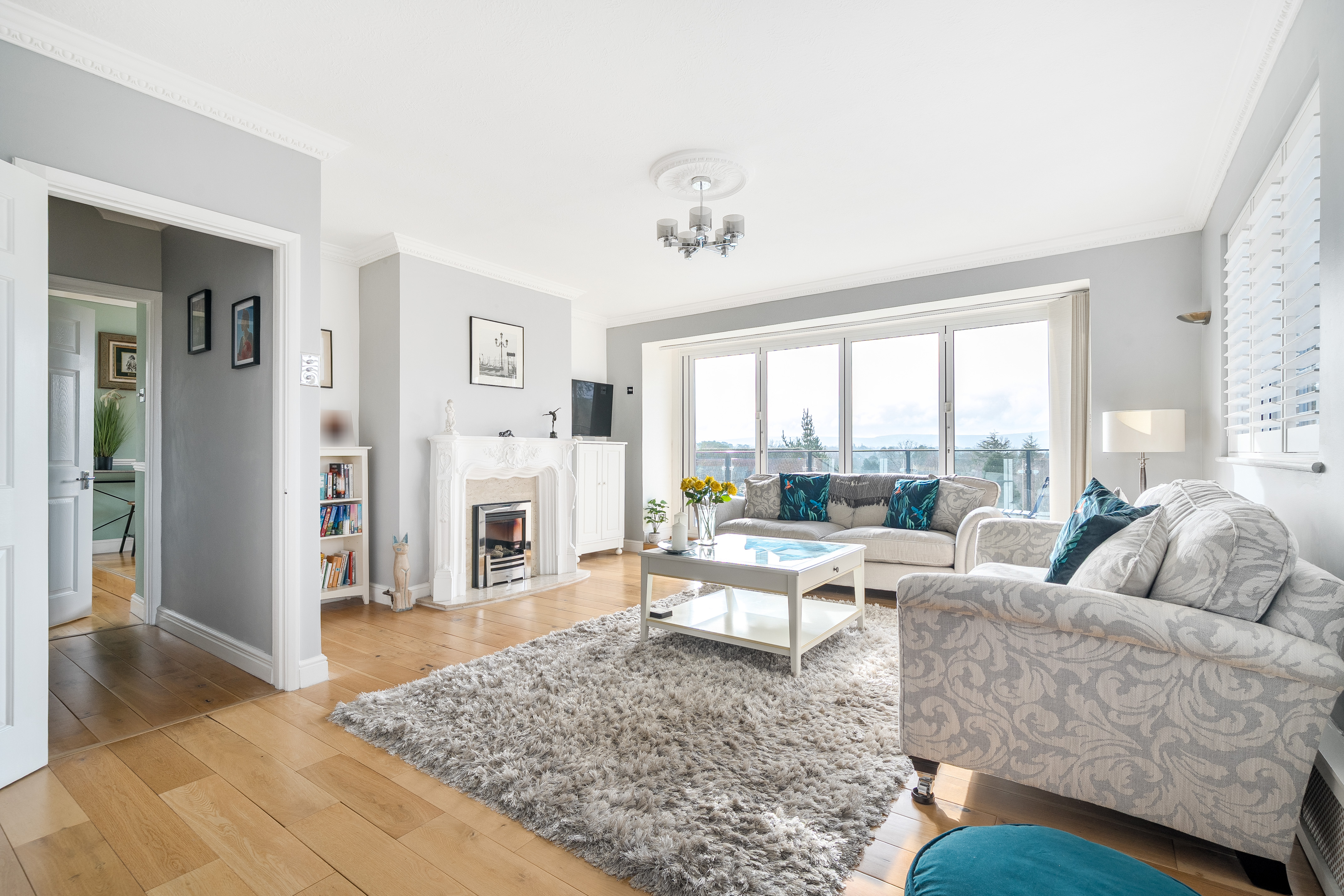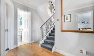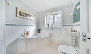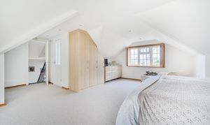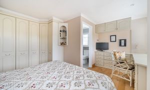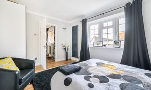 The principal bedroom boasts a Juliet balcony and an en-suite shower room, providing a peaceful retreat with lovely views. There are three additional double bedrooms two of which have en-suite bathrooms. A fifth double bedroom is being used as a study. The property is finished to a high standard throughout, combining modern comforts with a sense of light and space.