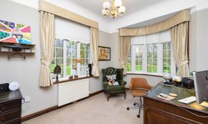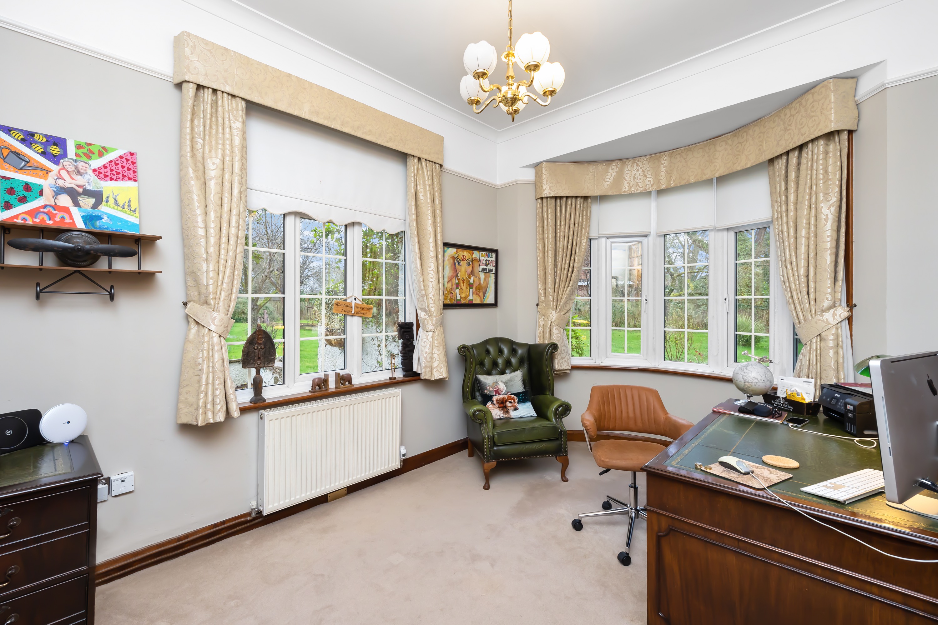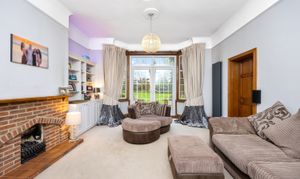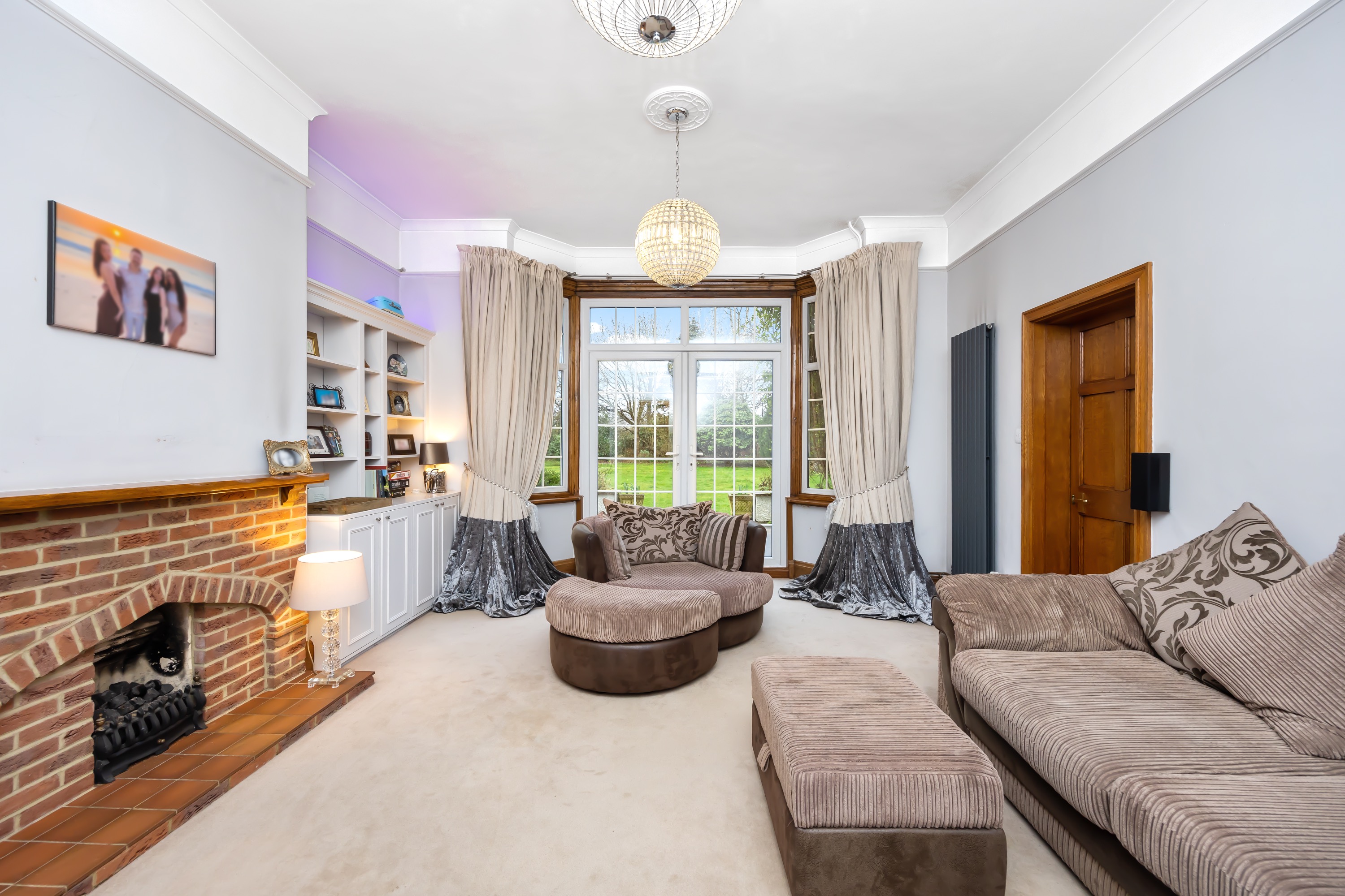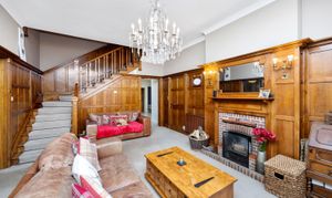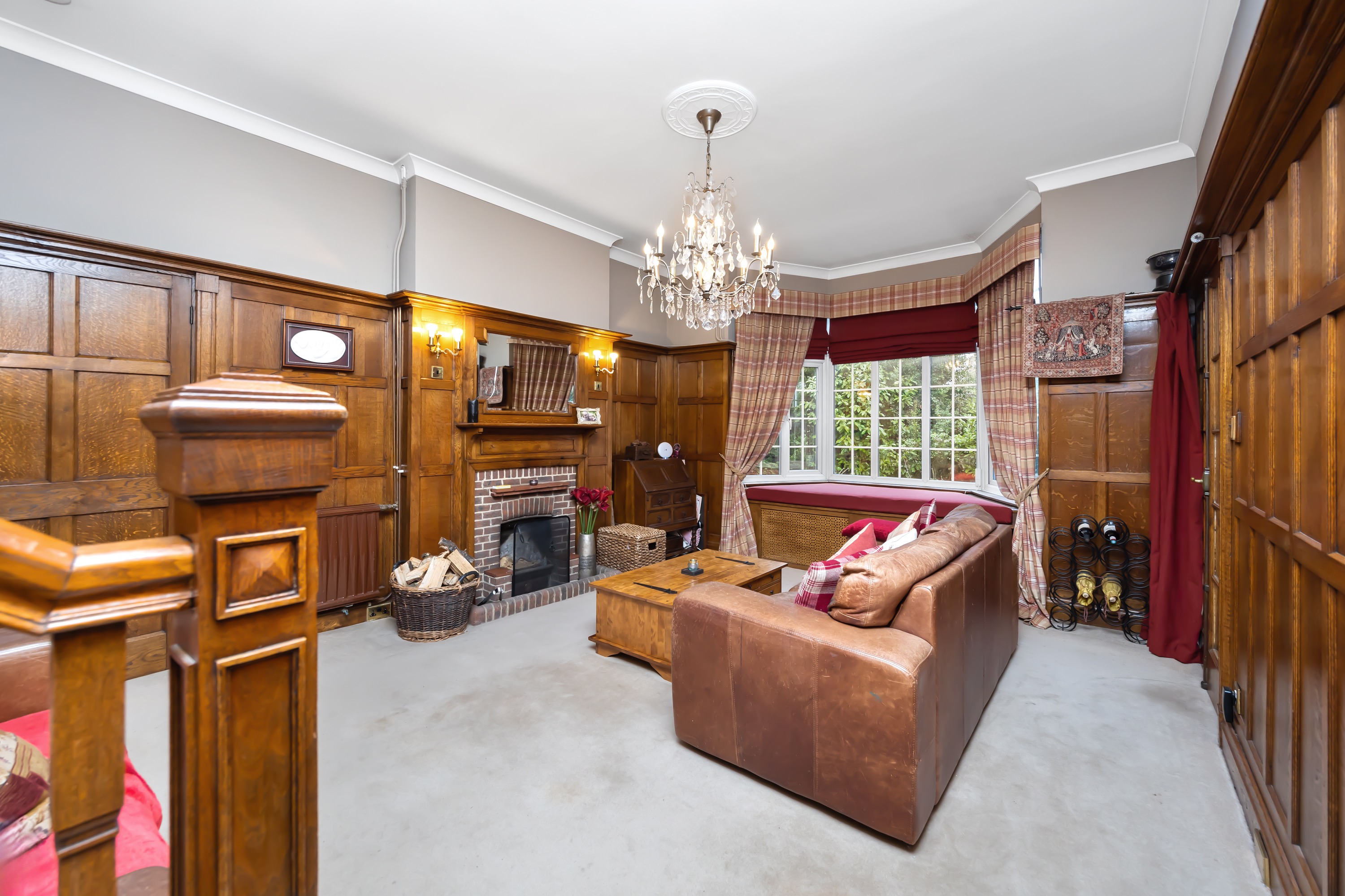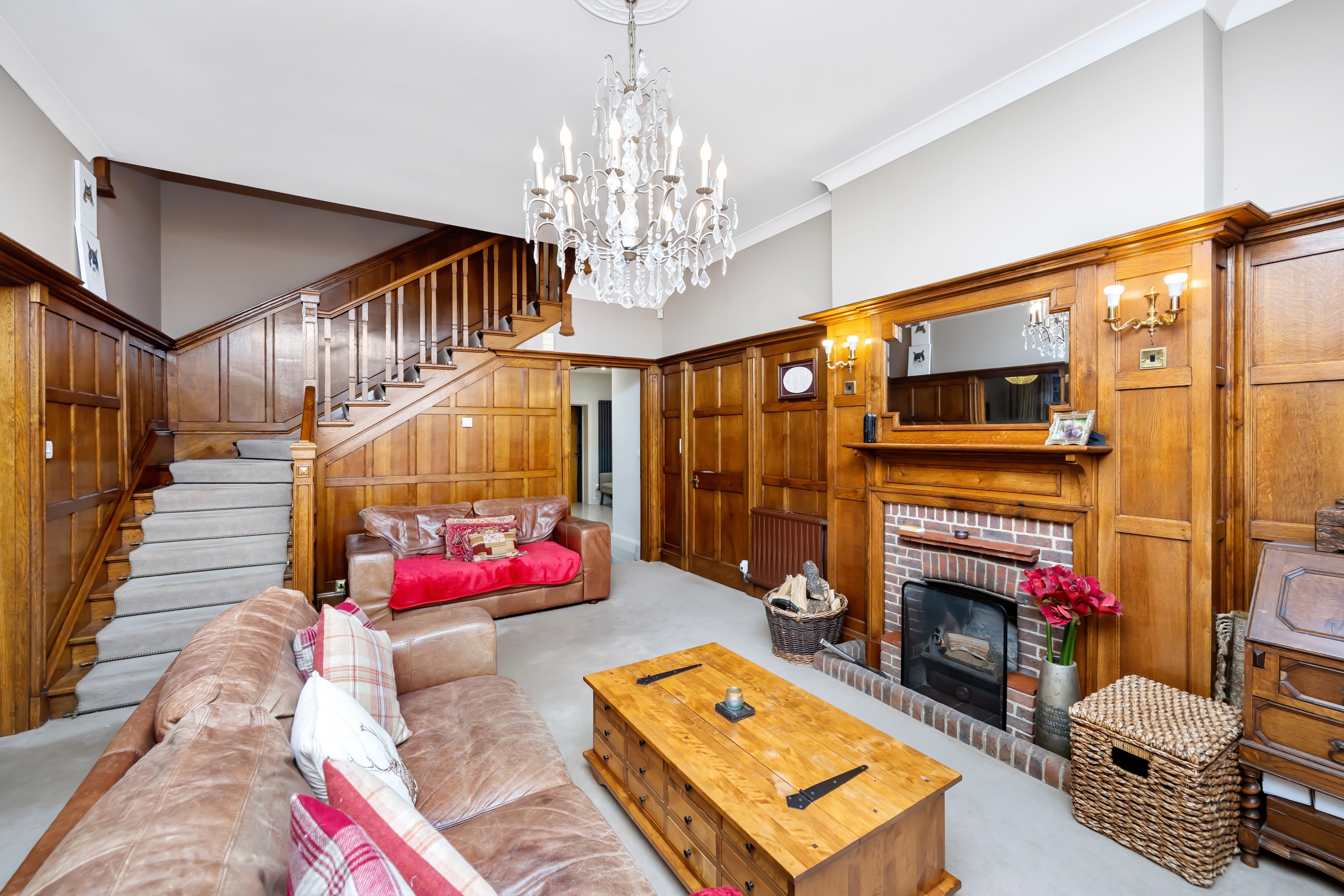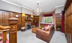 - A stunning drawing room with wood panelling, open fireplace, high ceiling and a large bay window