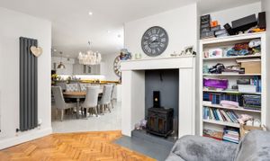 Venture further into the expansive kitchen, a culinary haven featuring a striking large island, underfloor heating, and bifold doors that seamlessly merge the interior with the verdant outdoors. Adjacent to the Dining area, a snug and a tranquil study overlook the rear garden, providing perfect sanctuaries for relaxation and productivity.