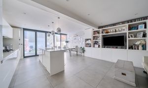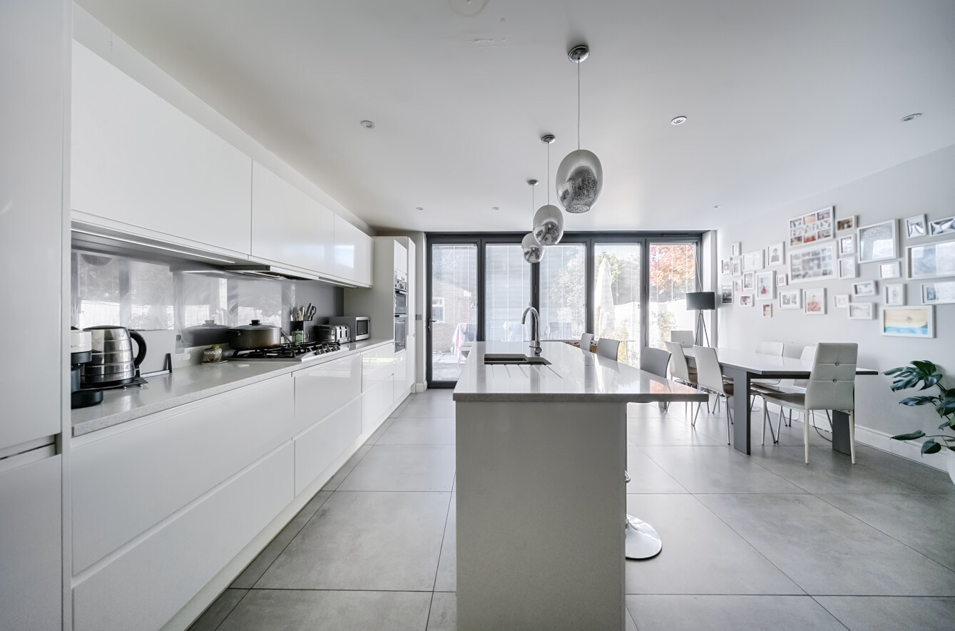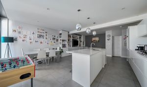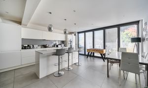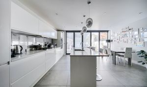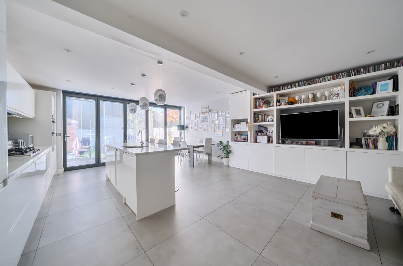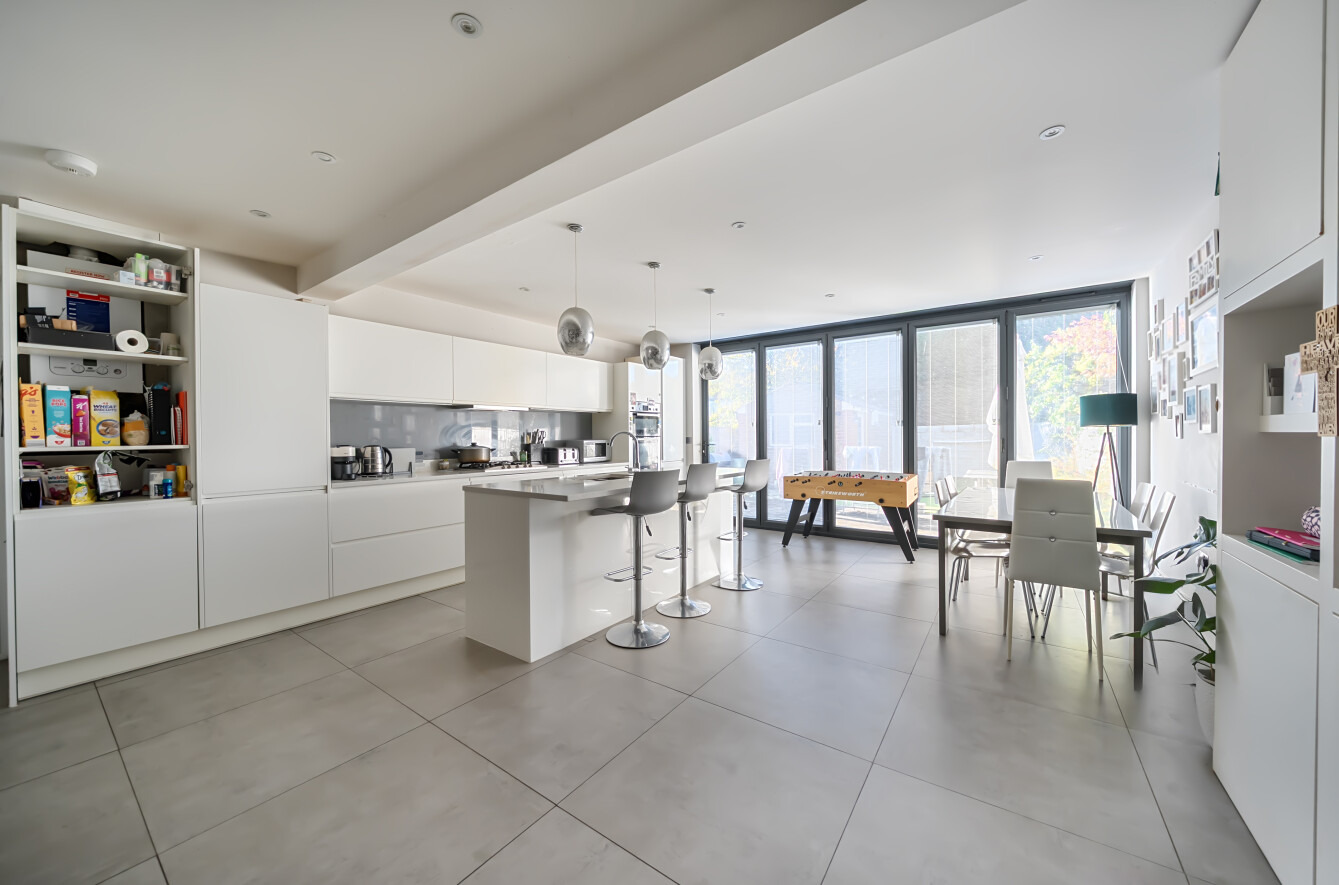 - Super kitchen/diner/family room with generous fitted units, island, inset 5 burner Smeg hob, inbuilt Bosch double ovens, tiled floor and folding double glazed doors out to deck and garden.