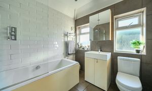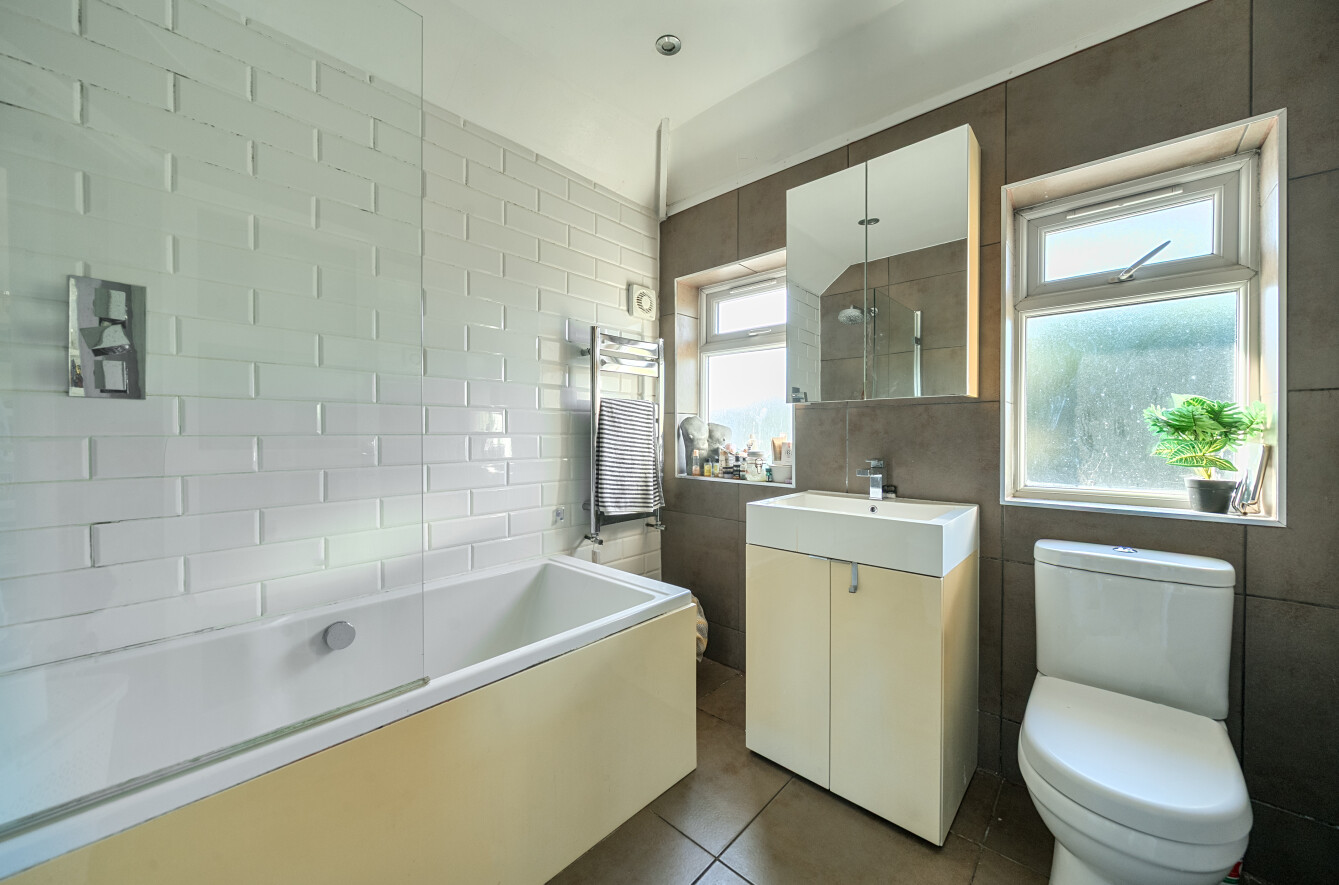 Tiled floor, two double glazed frosted windows, WC, was hand basin with cabinet under, panel enclosed bath with screen and shower over.