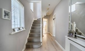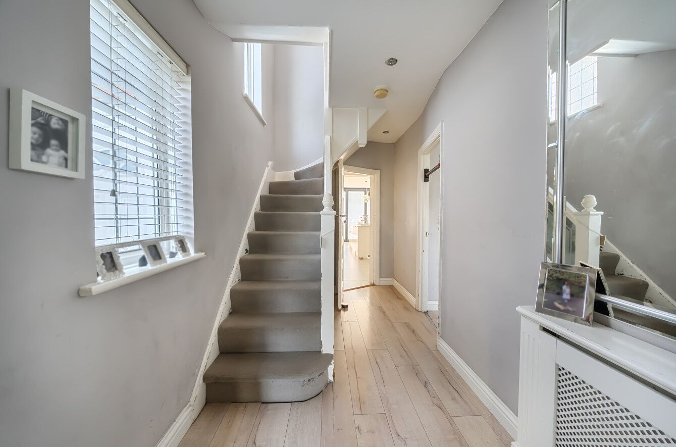Wood laminate flooring, radiator in decorative cabinet, spotlights, door to understair store cupboard, leaded style double glazed side window.