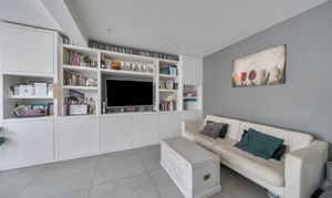 Tiled flooring, rear room width folding double glazed doors out to deck and garden, fitted kitchen units at eye and base level with wide drawers, floor to ceiling cupboard, worktops and splashbacks, inset Smeg 5 burner gas hob, inbuilt Bosch double ovens, island unit with inset one and a half bowl sink unit with monobloc tap, underbuilt integral freezer, cabinets and recycling drawer, informal dining surface to one side with with space for stools under. Family area with fitted cabinets, shelving and TV plinth. spotlights, door to side utility/cloakroom.
