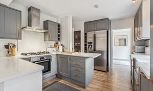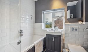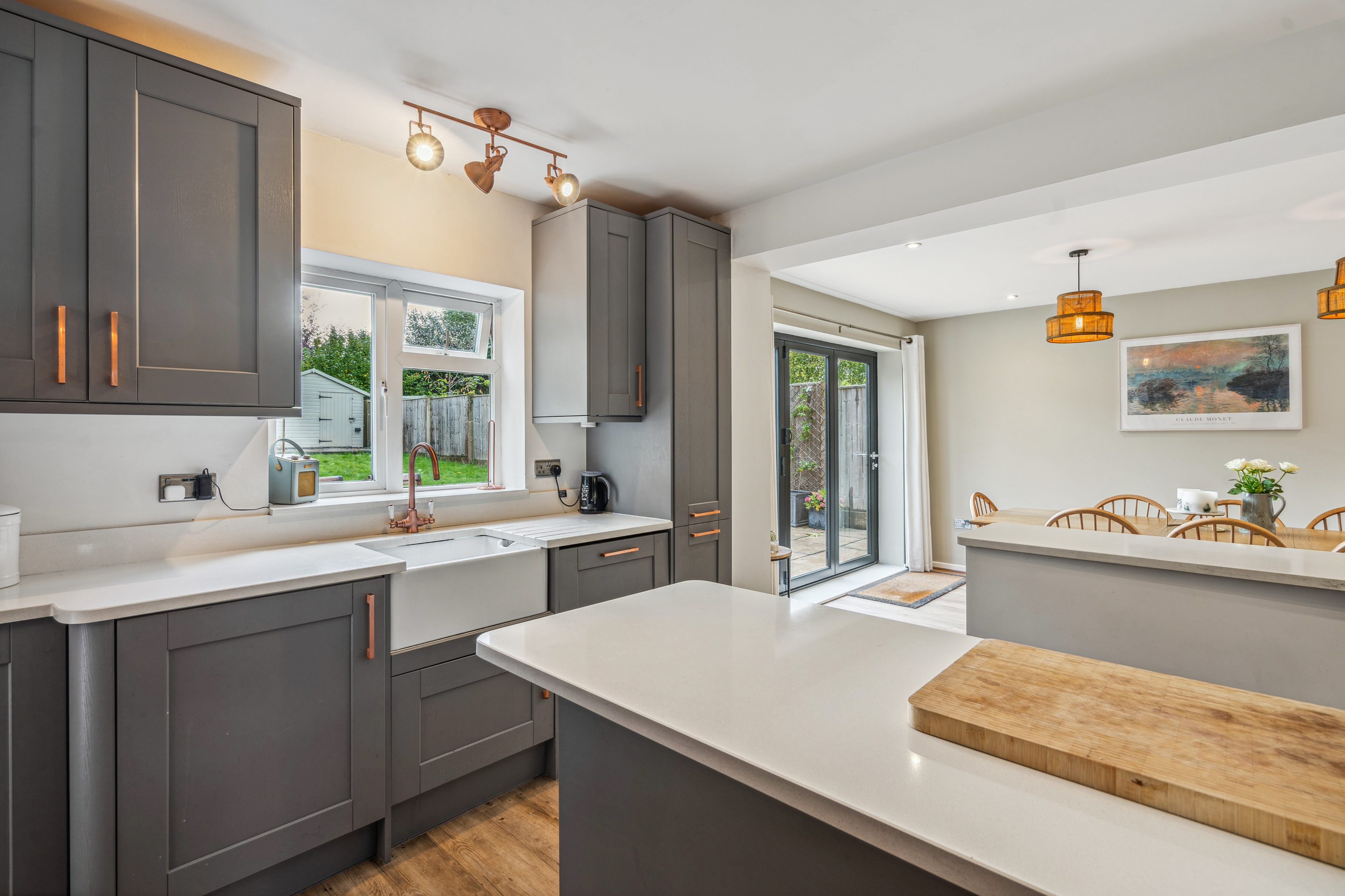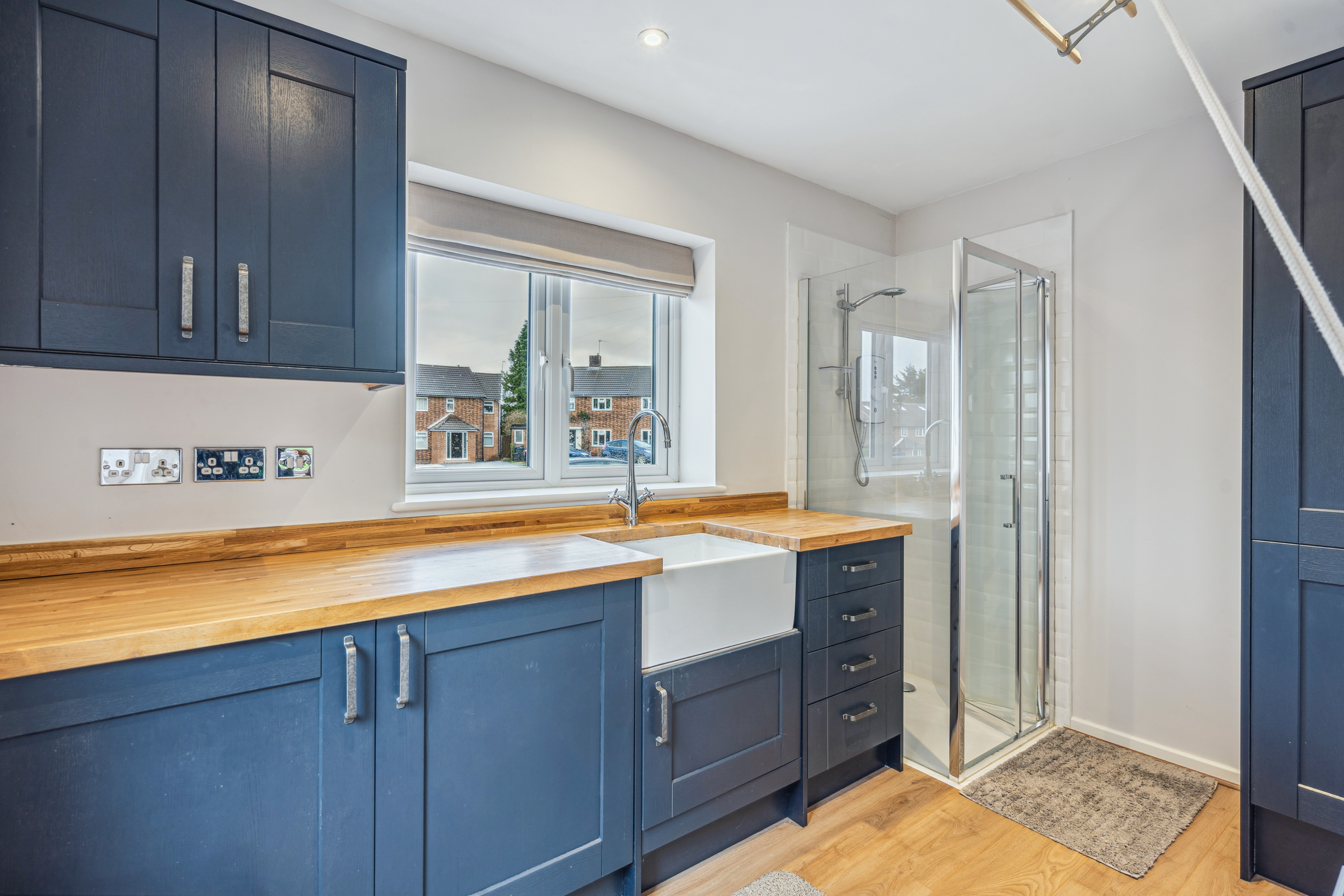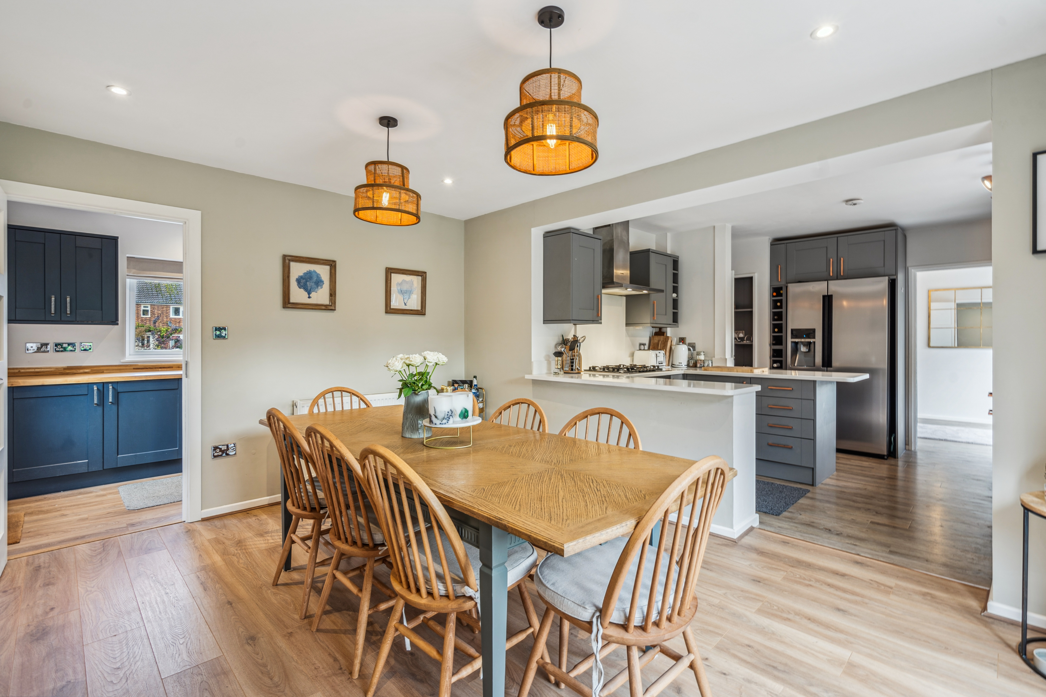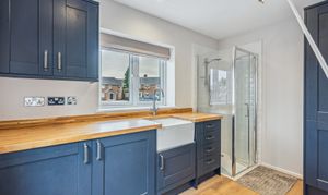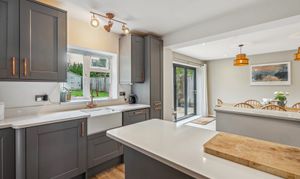 The modern kitchen features a comprehensive range of base and wall units with a sleek quartz worktop and an inset Belfast sink. High-quality Bosch appliances, include an oven, a five-ring gas hob, a stainless steel extractor, and a dishwasher. A practical breakfast bar and peninsula separate the kitchen from the spacious dining area, offering ample room for a large dining table and chairs. Additional bi-folding doors effortlessly connect this space to the garden. For added convenience, there's a spacious utility room which incorporates a shower, sink, storage and plumbing for washing machine.