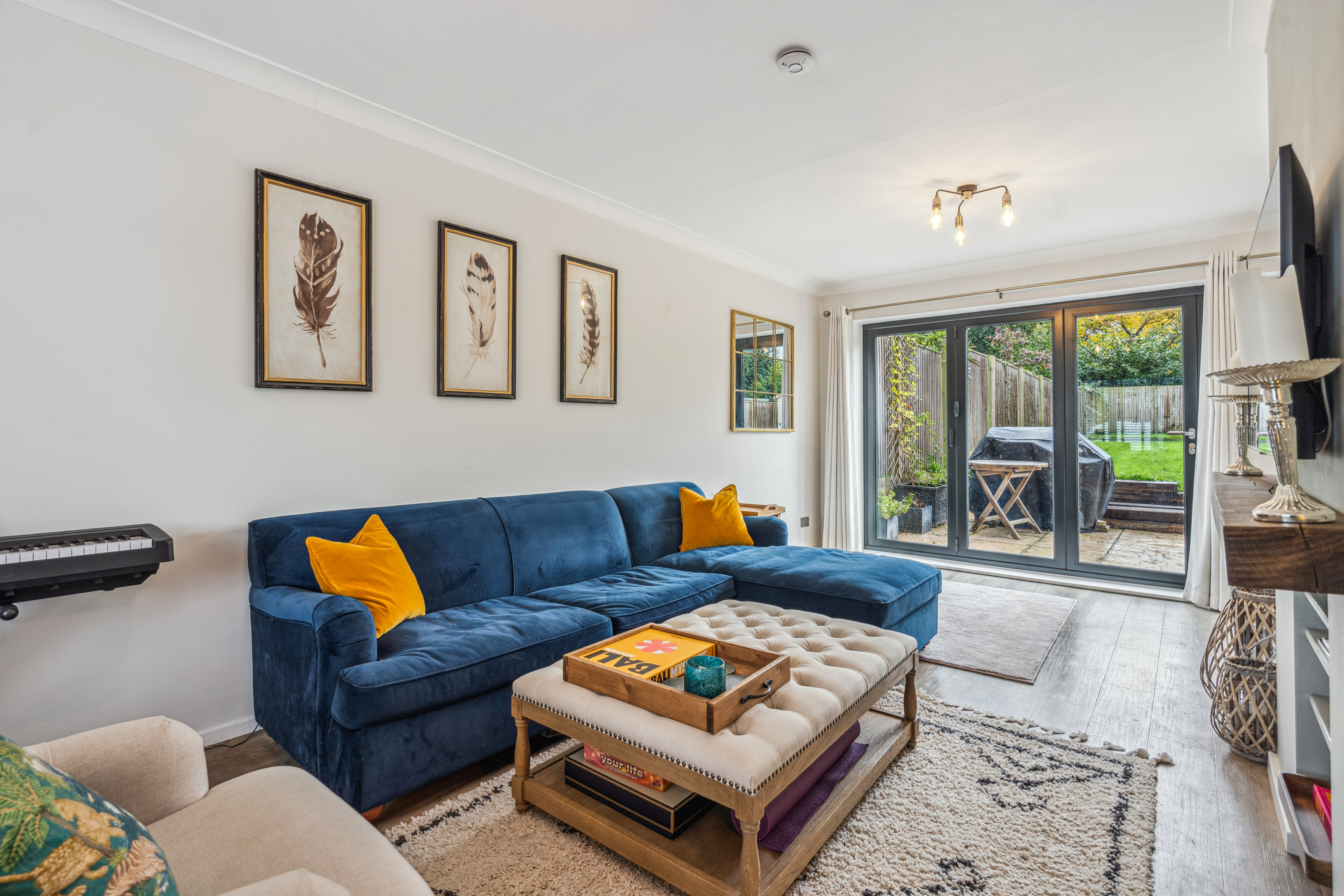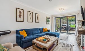 The serene, dual-aspect living room is flooded with natural light and enhanced by bi-folding doors that open onto a patio. Doors lead to both the hallway and kitchen.