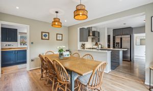 As you approach the property you'll be greeted by a gravel driveway with ample space for two vehicles, and an electrical supply should an EV charging point be required. Stepping through the front door you'll find yourself in a light and inviting entrance hall with Karndean French Oak flooring that flows seamlessly throughout. There is a well-appointed downstairs cloakroom and a deep under stairs cupboard providing practical storage.