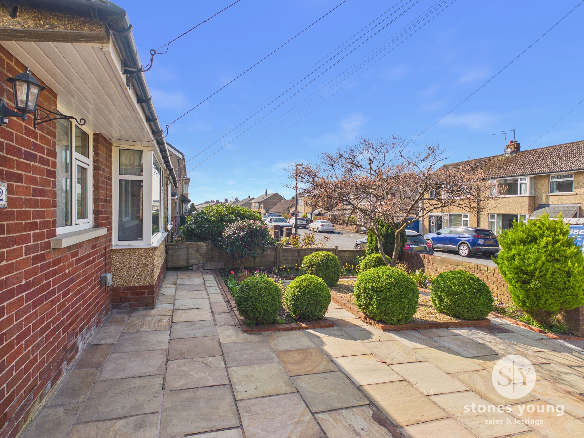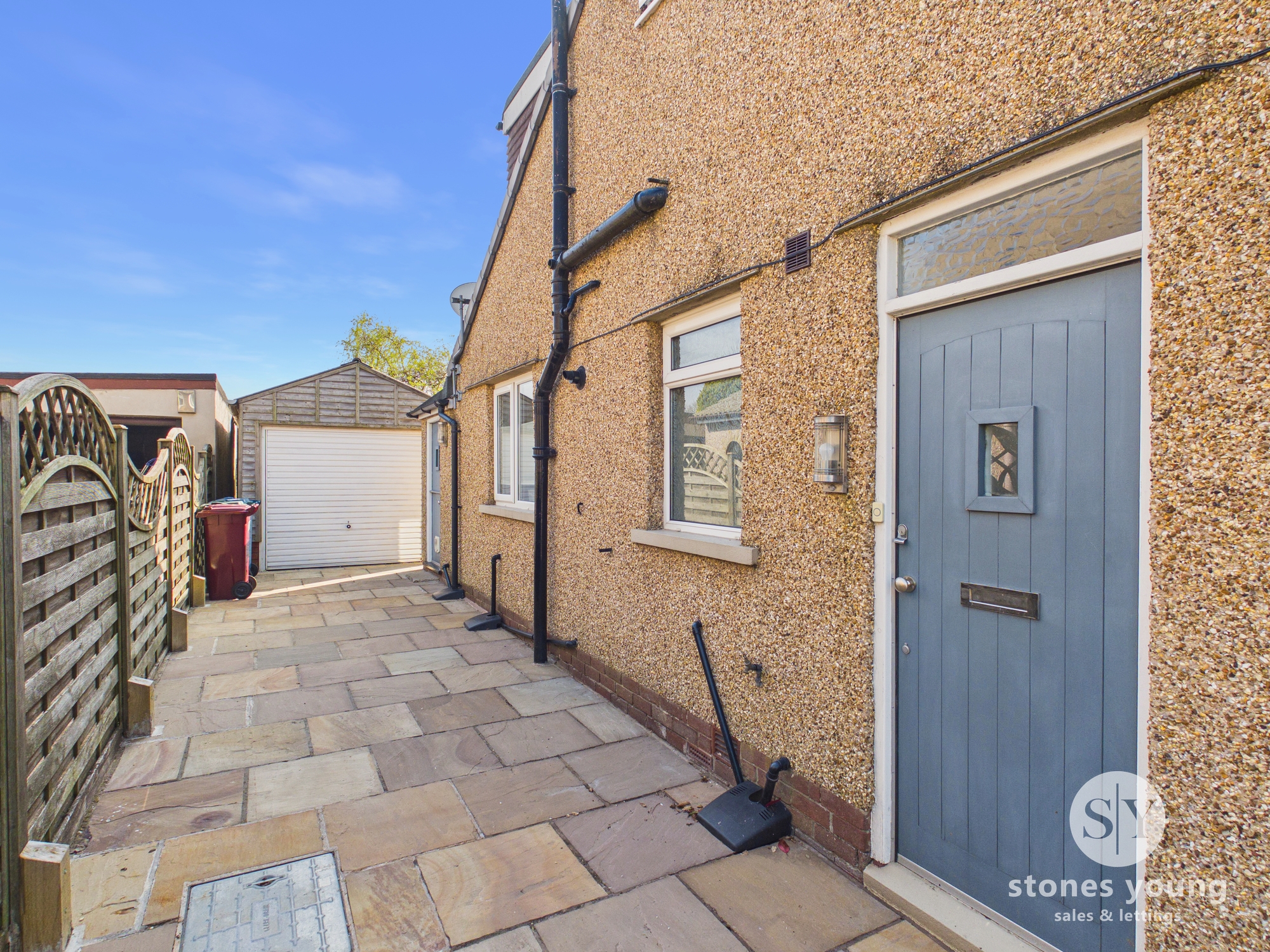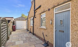 Landscaped front garden with boundary wall, with planting borders, central gravelled area with mature tree and timber fencing. Indian stone paved driveway providing ample private parking leading to single detached garage with up-and-over door, timber framed window, power and lighting and personal door to side. Rear garden with paved pathway, central lawn with raised planted garden borders, mature tree, rear decked patio and timber storage shed, timber fencing surround.