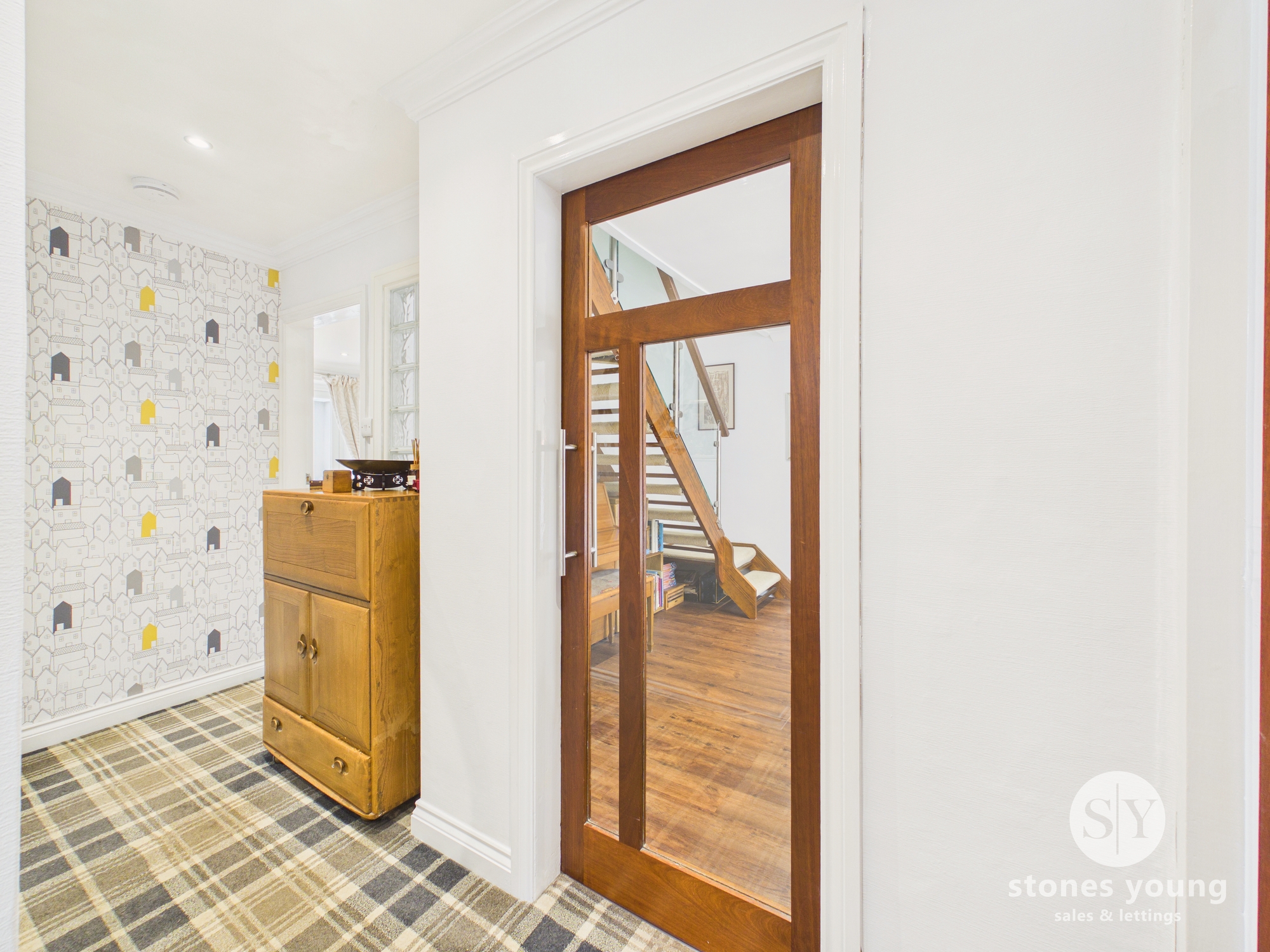 Internal wood glazed doors to ground floor rooms, feature block glass internal window, panel radiator, recessed spotlighting.