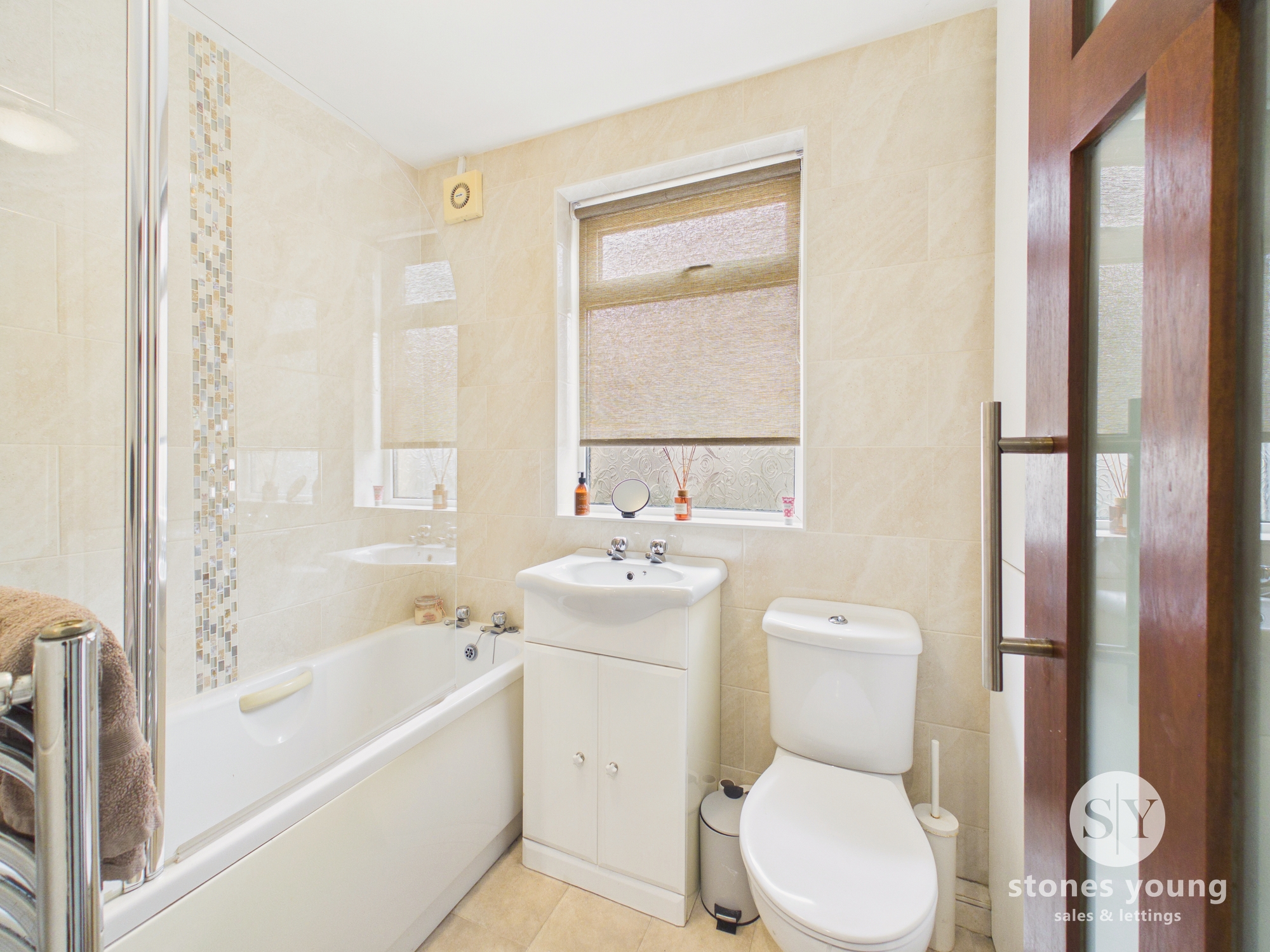 Modern white 3-pce suite with panelled bath with electric shower over, vanity basin with cupboard under, low level w.c., chrome ladder style radiator, tiled effect flooring, fully tiled walls, uPVC double glazed frosted window, excellent storage with built in cupboards also housing Baxi combination gas central heating boiler, extractor fan.