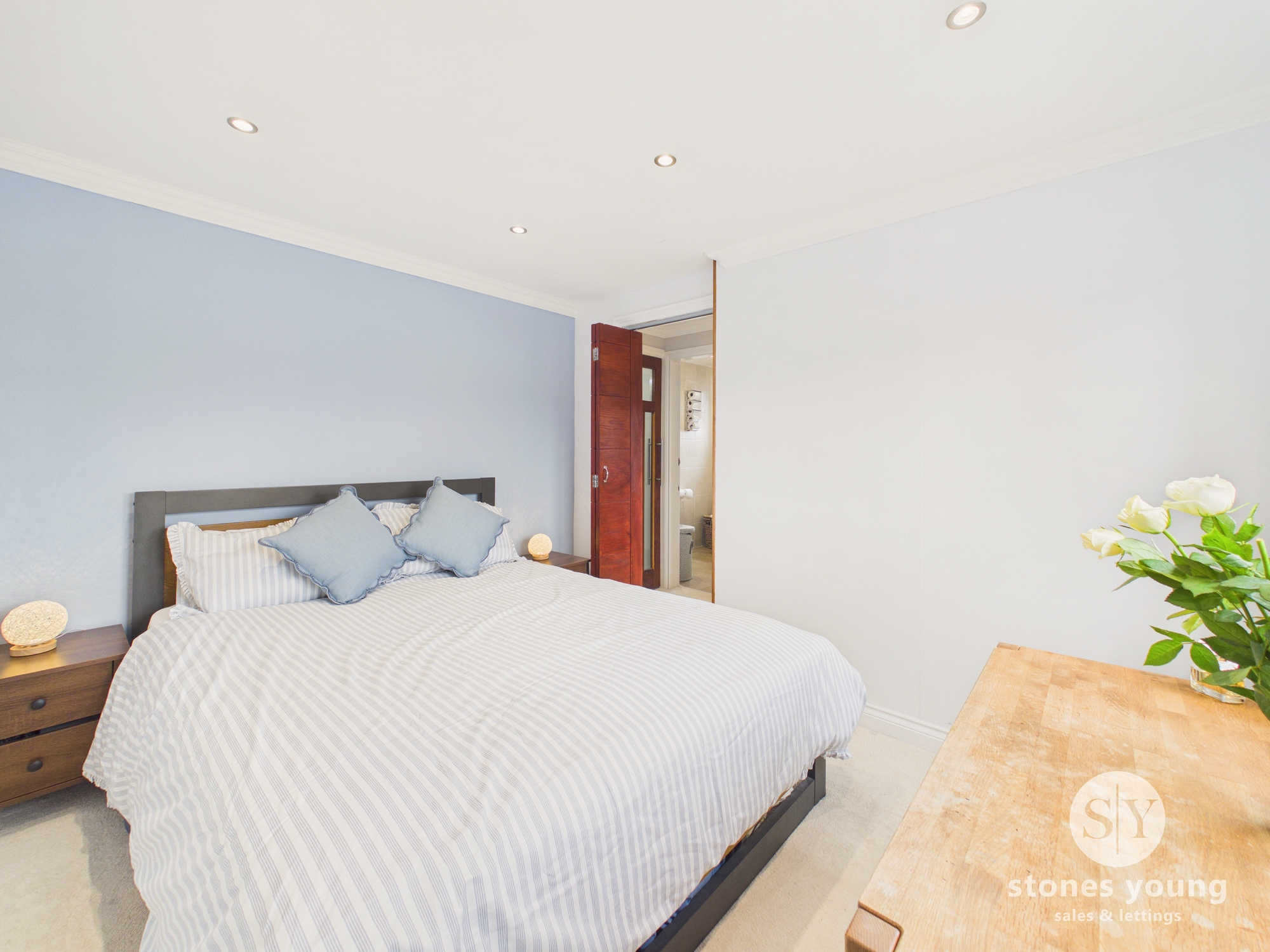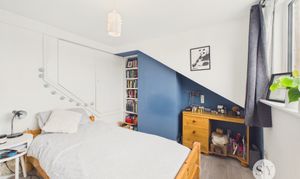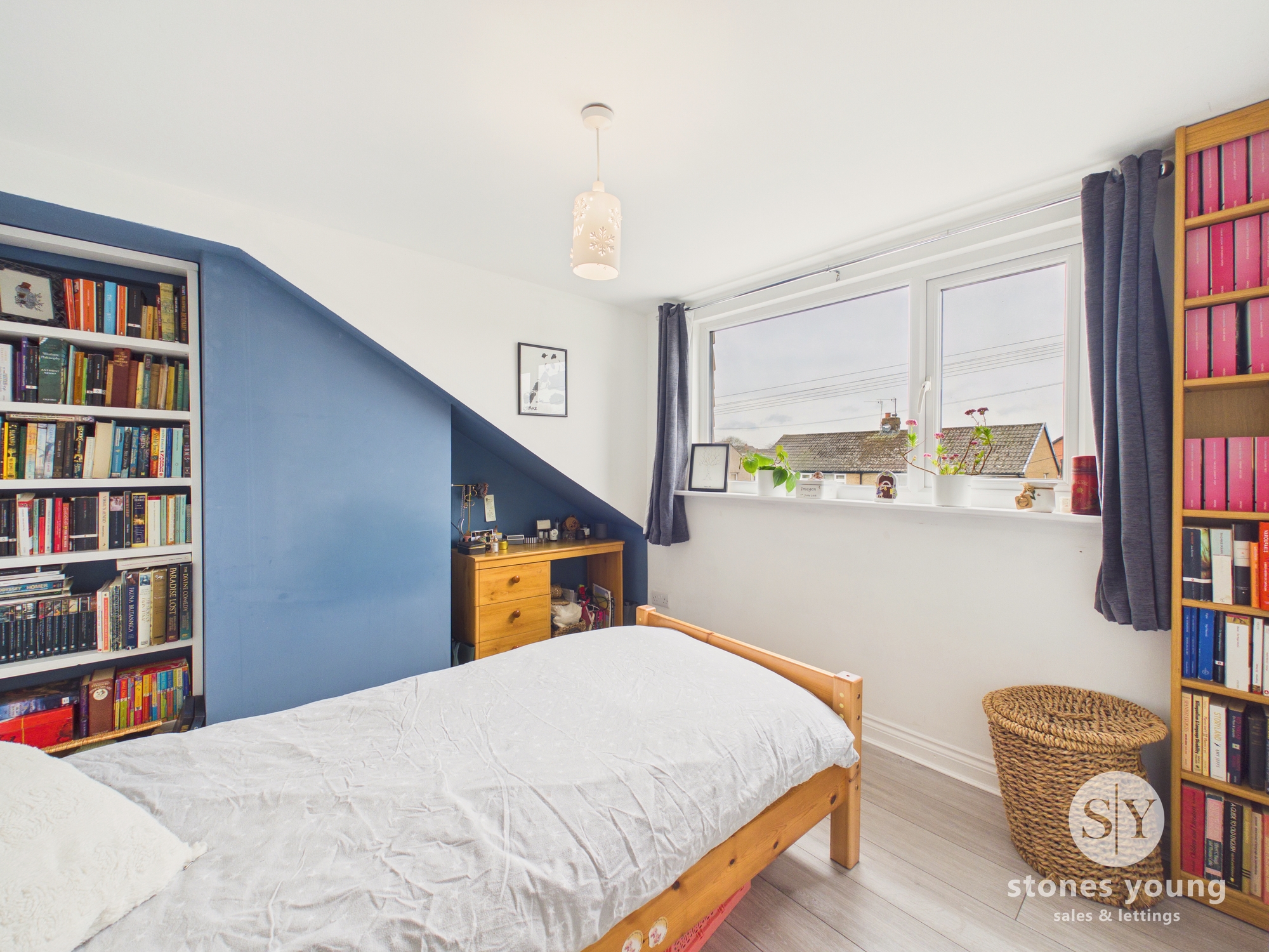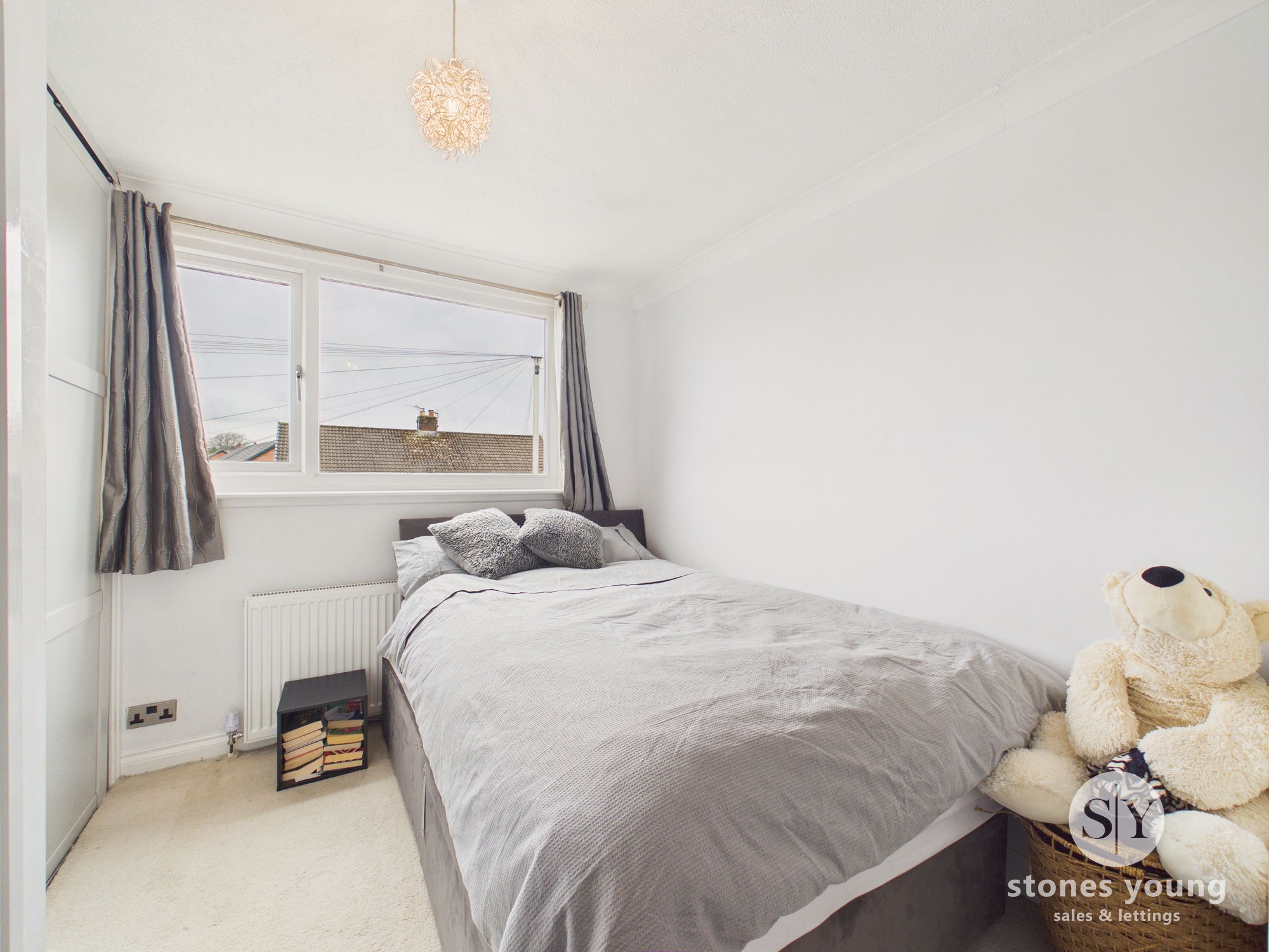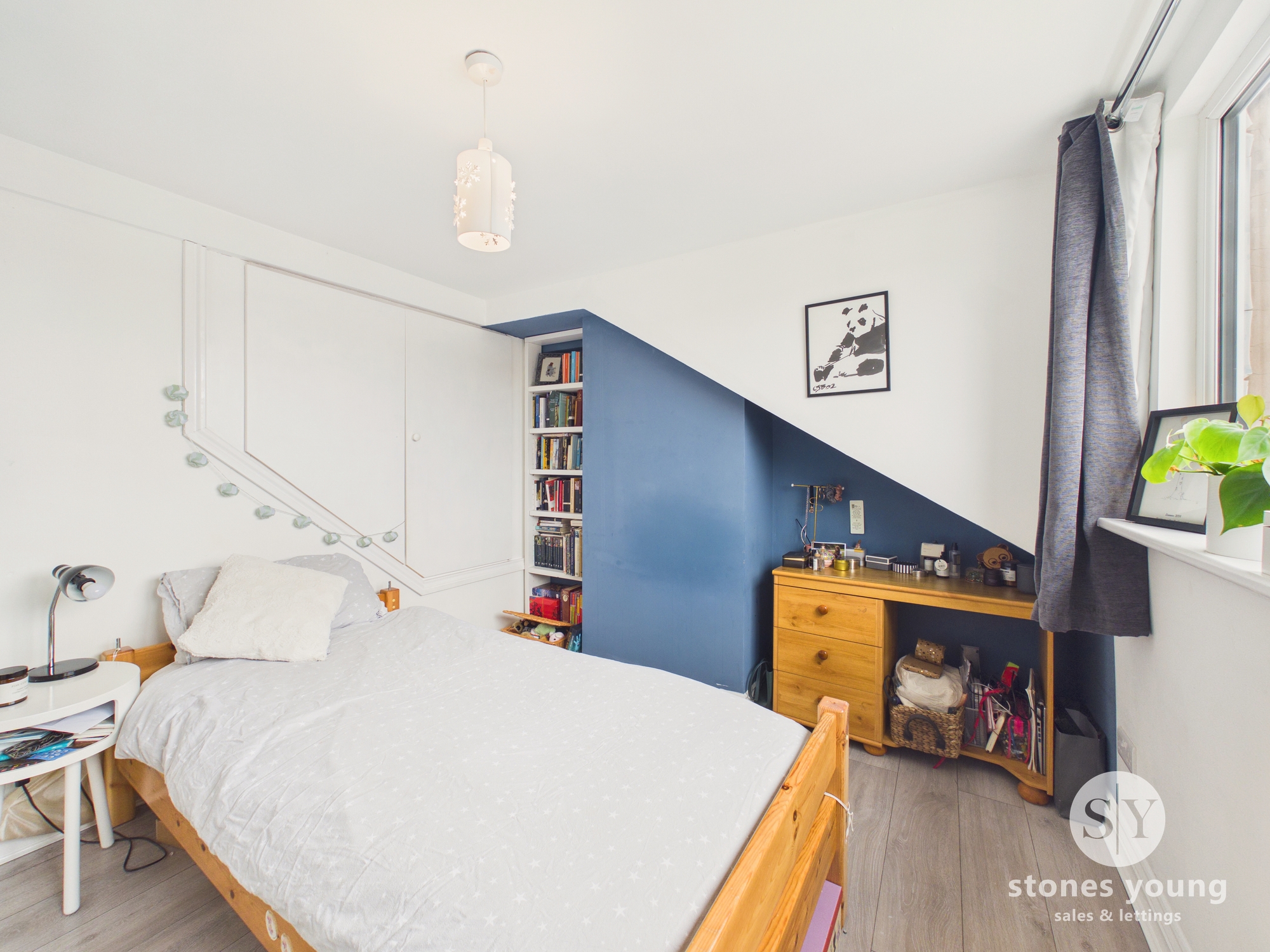 Double bedroom with laminate wood style flooring, uPVC double glazed window, panel radiator, built in storage cupboard over stairs.