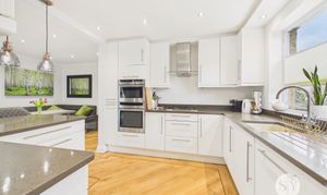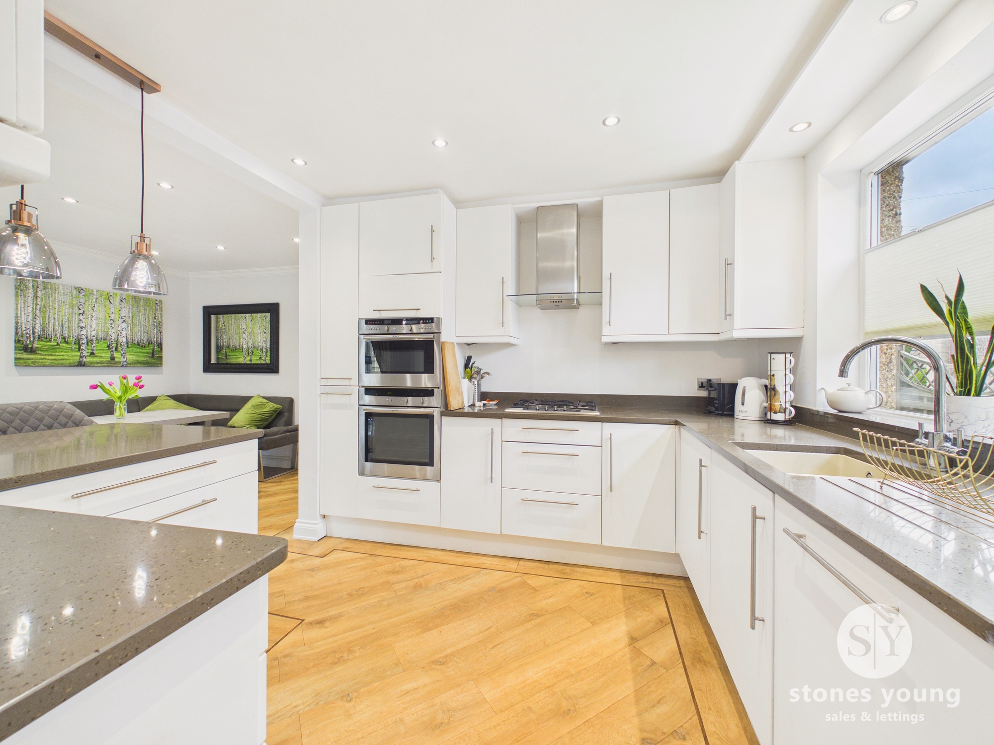 Modern white fitted wall, base and drawer units with contrasting granite worktops, upstands and windowsill, sink unit with integral granite drainer and mixer tap, Neff 4-ring gas hob with extractor filter canopy over, eye level electric double double oven and grill, integrated dishwasher, fridge freezer, carousel corner unit, karndean wood style flooring, granite breakfast bar, full length larder unit, recessed spotlighting, vertical panelled radiator, uPVC double glazed window, open plan to dining room.