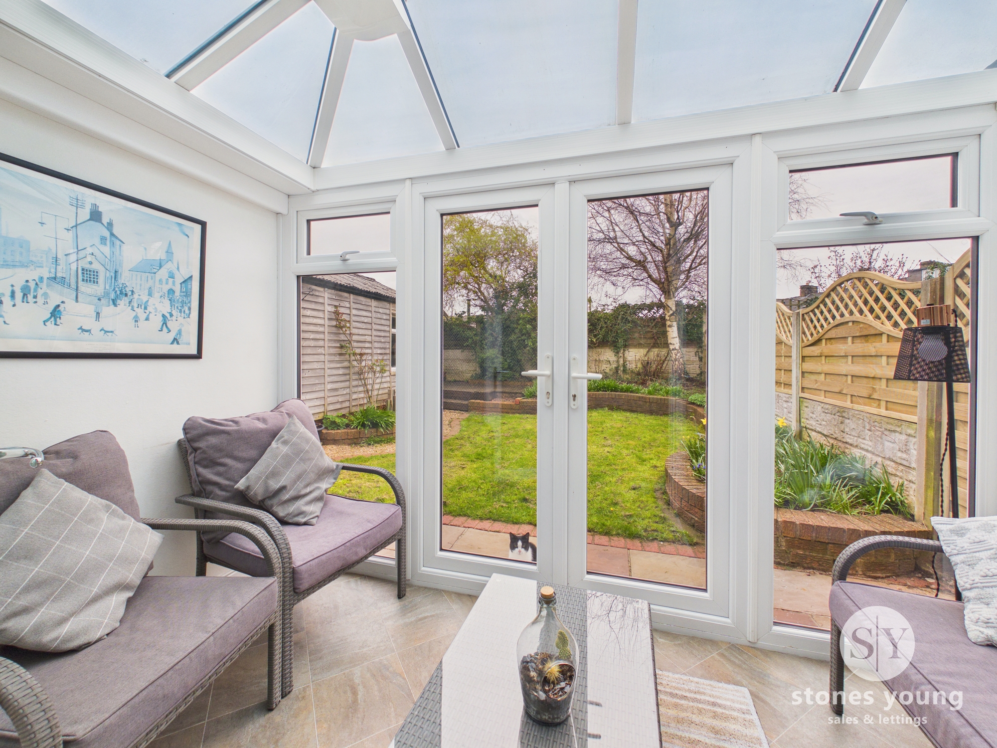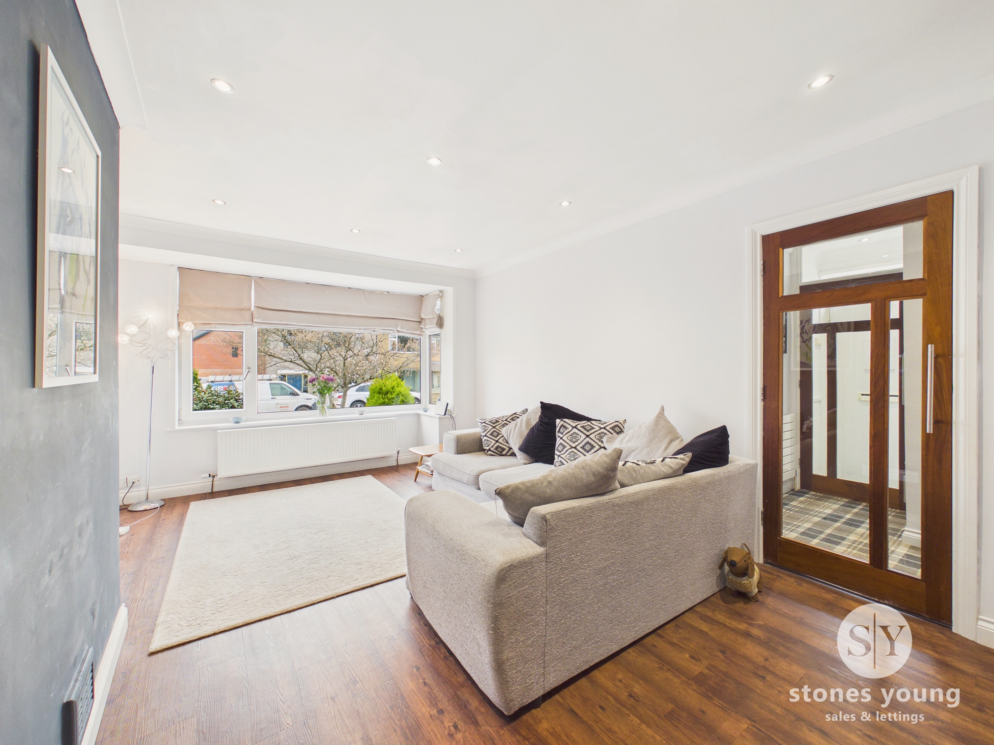Karndean wood style flooring, coved cornicing, recessed spotlighting, TV point. open to breakfast kitchen, uPVC french doors to conservatory.