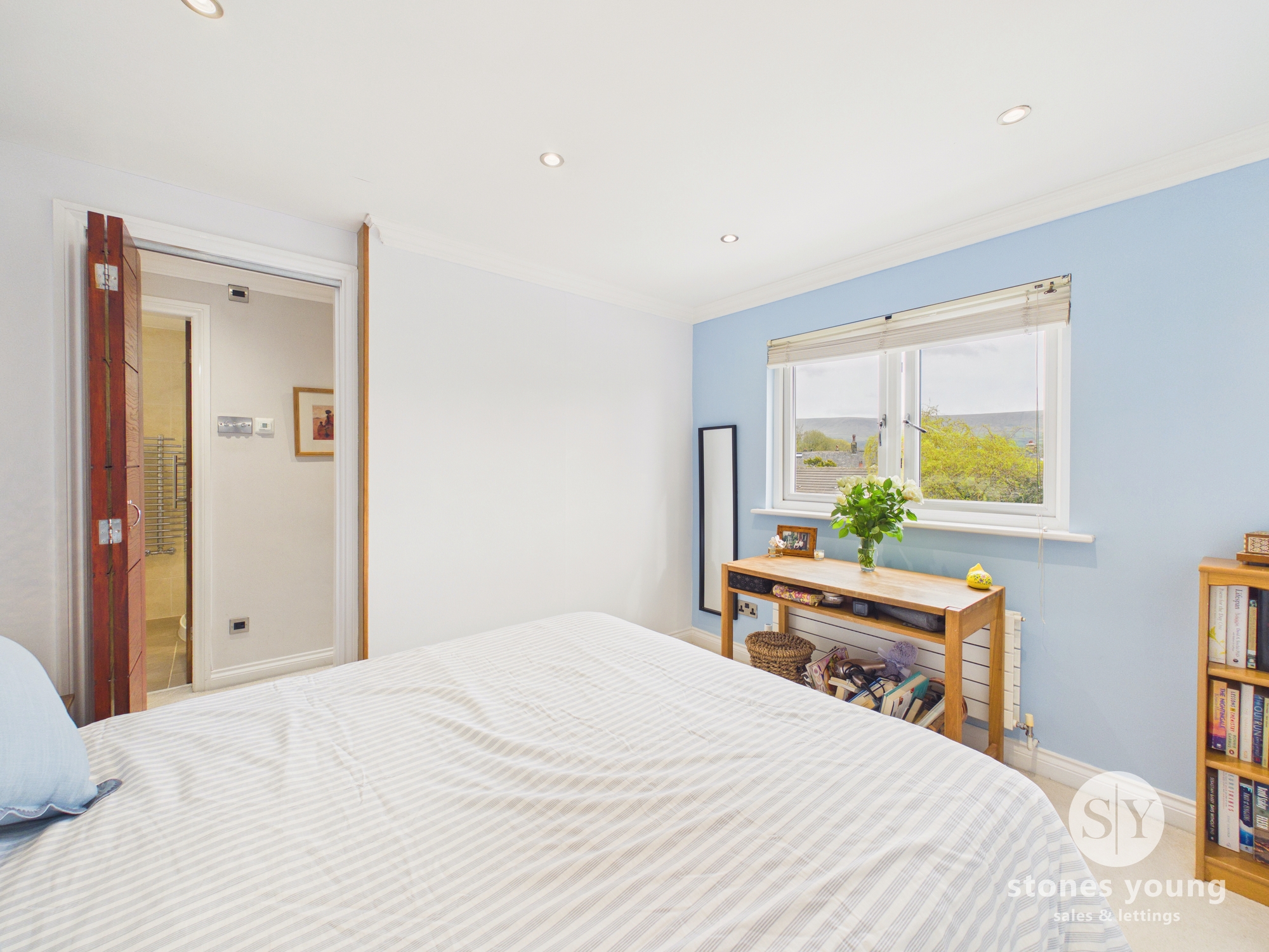 Double bedroom with carpet flooring, uPVC double glazed window with attractive aspects across towards Pendle Hill, recessed spotlighting, coved cornicing.