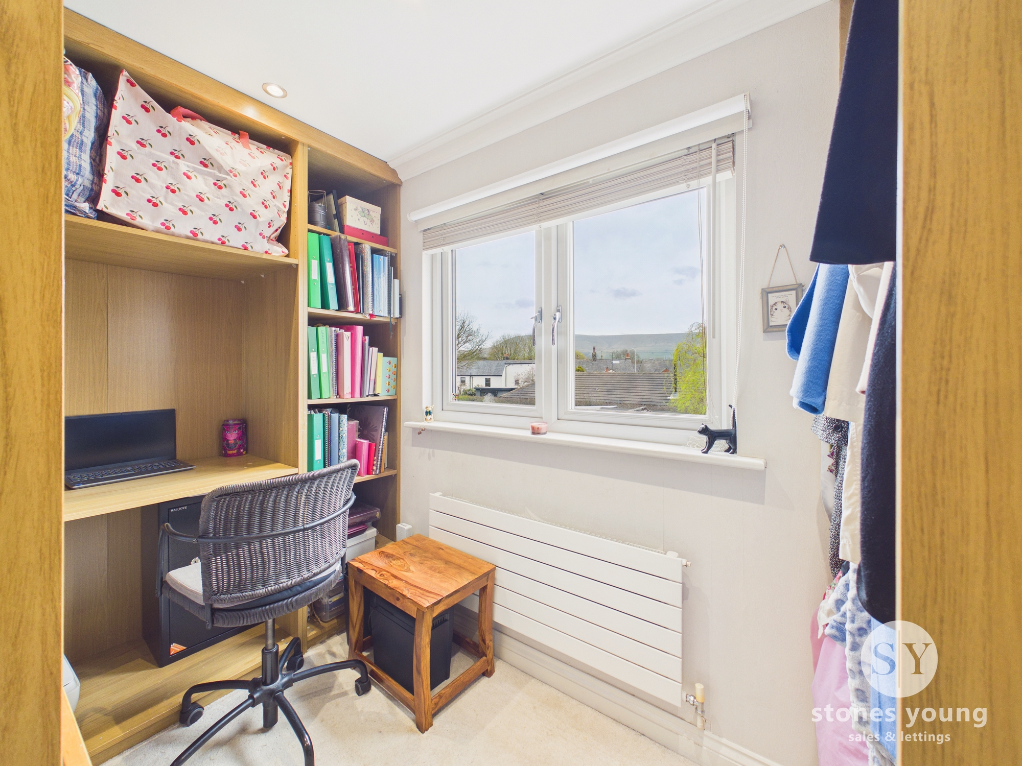 Flexible useful room with fitted shelving, drawer units and hanging space, office desk area, recessed spotlighting, carpet flooring, panel radiator, uPVC double glazed window, superb view across towards Pendle Hill.