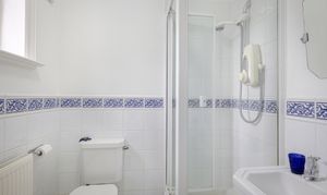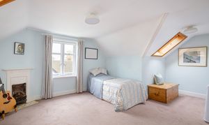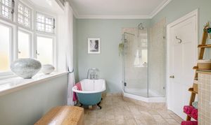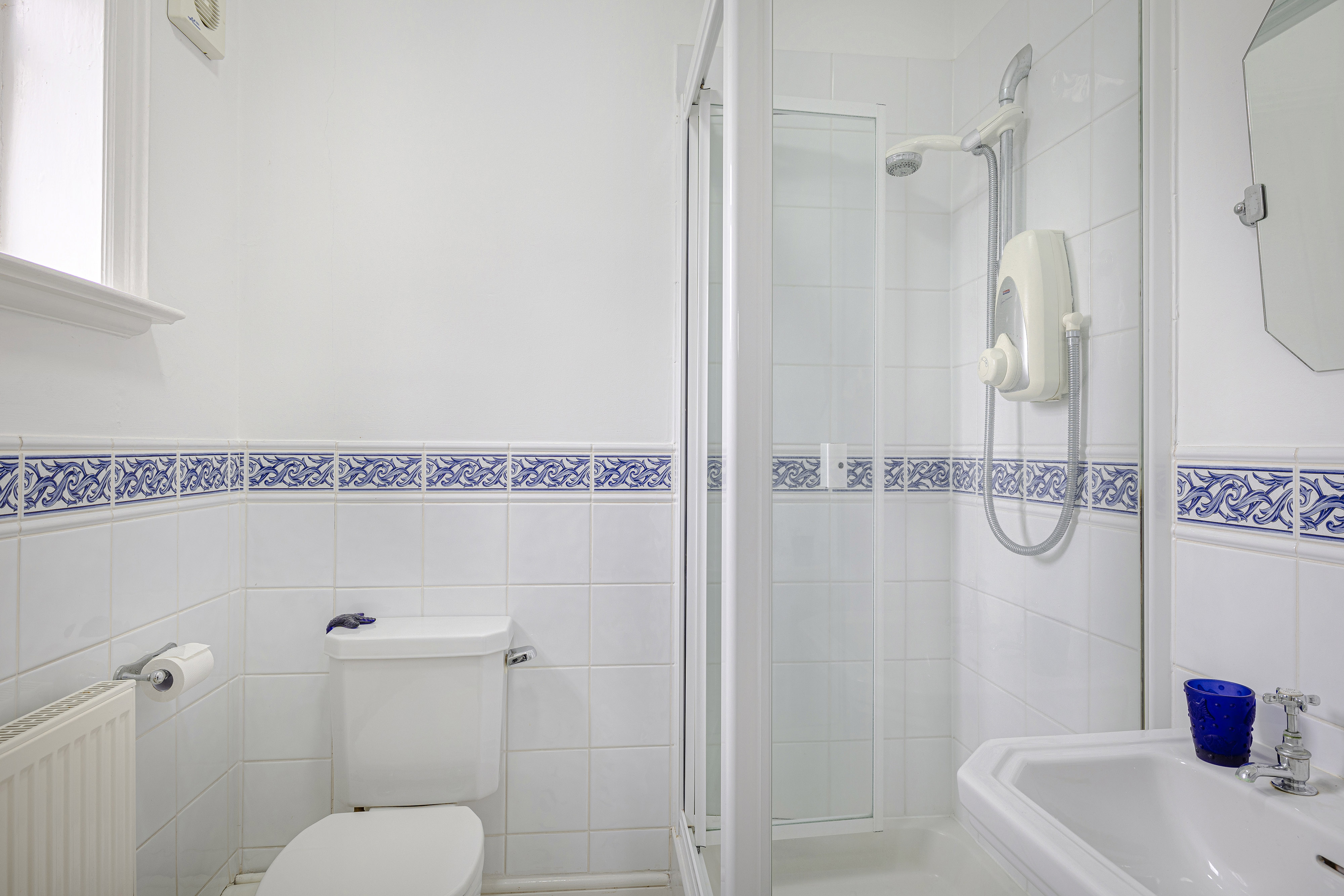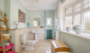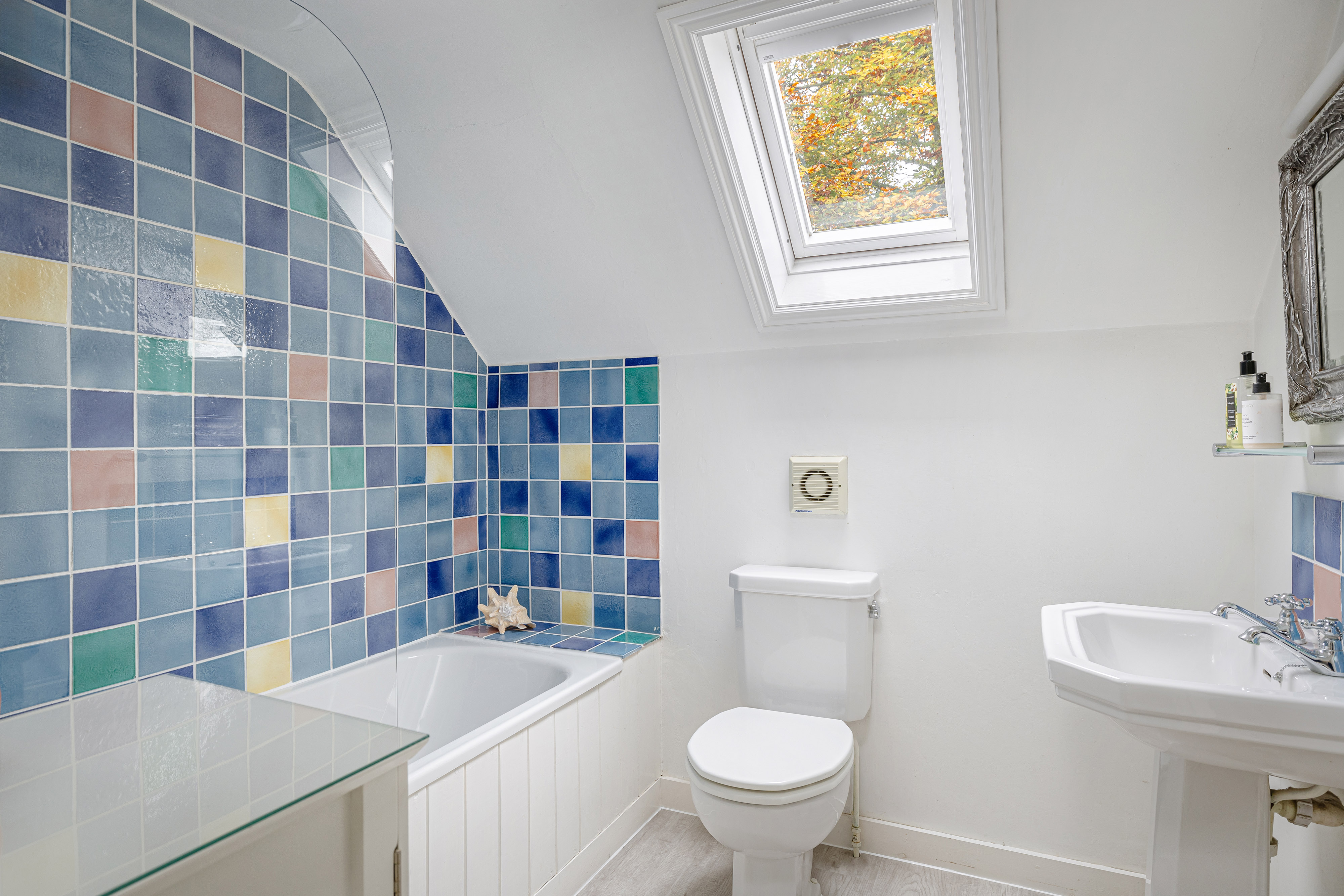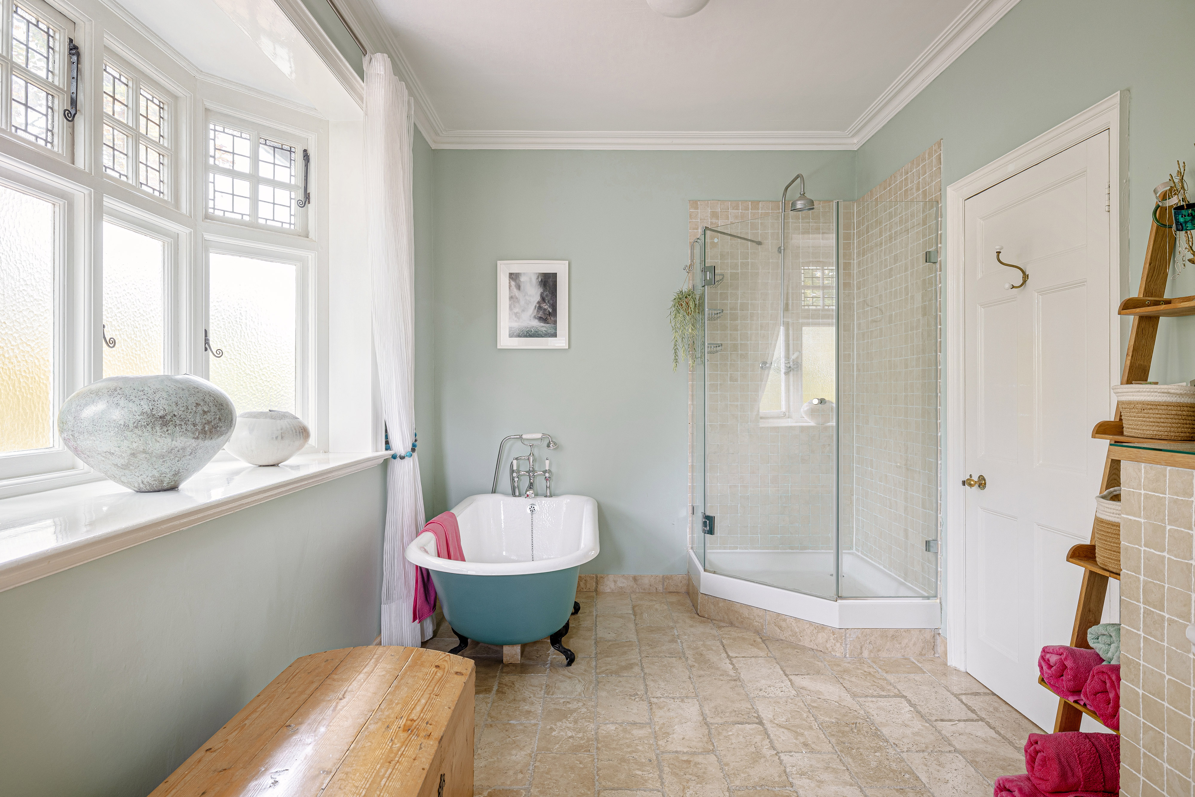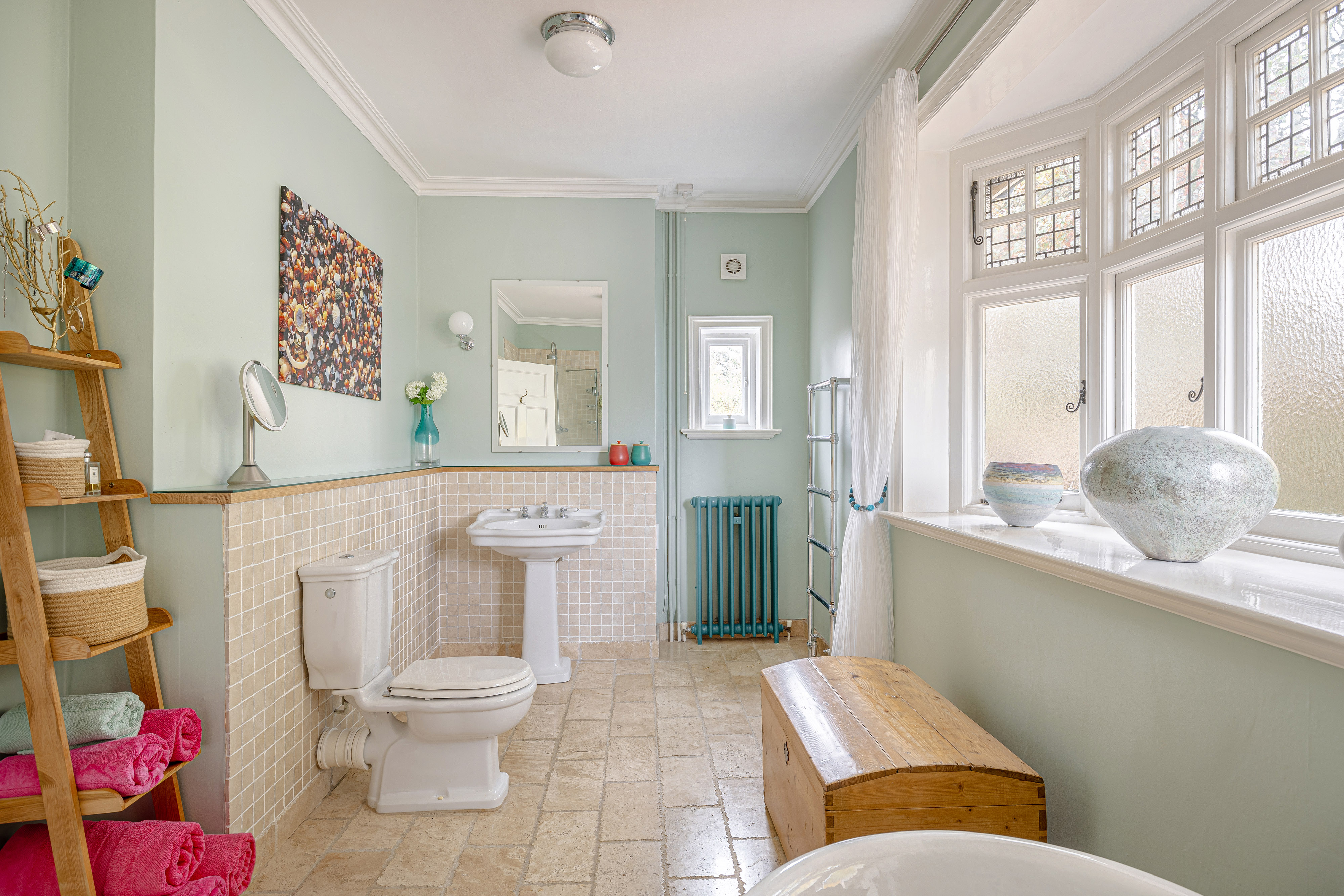 Two of the three bedrooms on the first floor share a well-appointed family bathroom, which features a luxurious roll-top bath—a nod to the Edwardian era—alongside a spacious shower cubicle, a wash hand basin, and a WC. The third bedroom, designated as a guest room, includes an en-suite shower room equipped with a shower cubicle, a wash hand basin, and a WC.