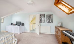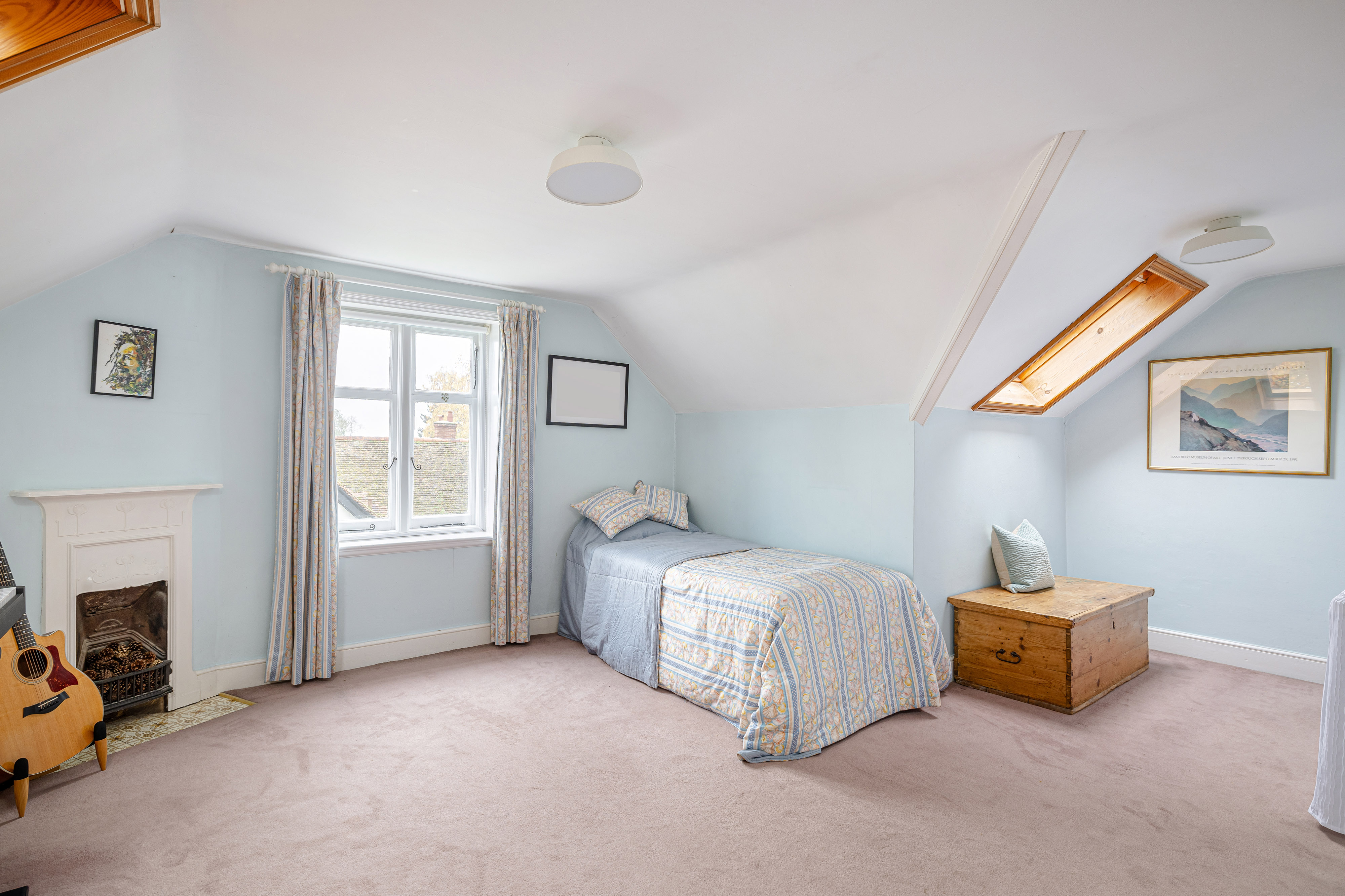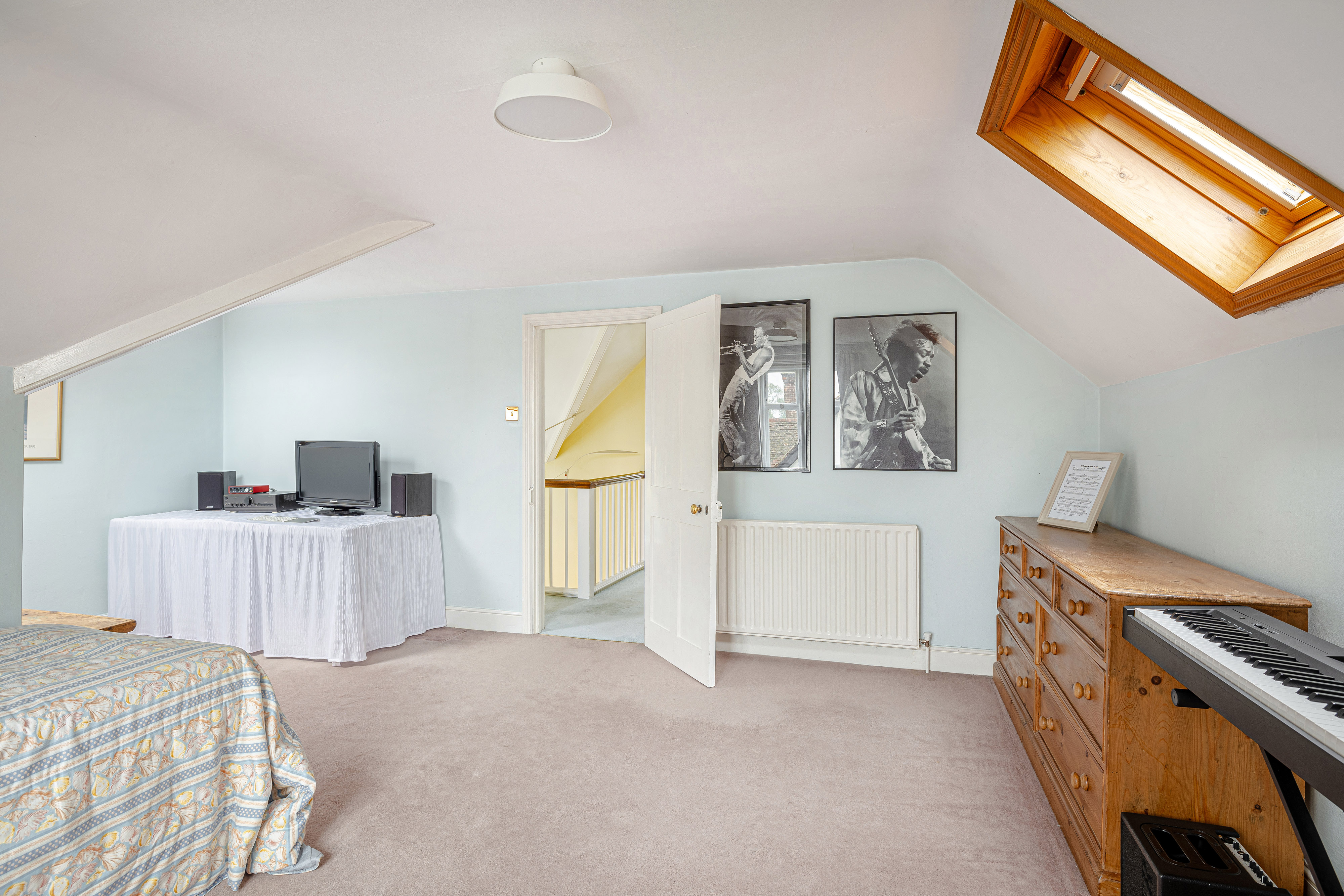 The top floor features two additional bedrooms and a bathroom. One of the bedrooms could easily be converted into a home office or hobby room, benefiting from the peacefulness of its elevated position. Both bedrooms also offer storage space in the under-eaves cupboards.