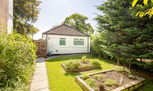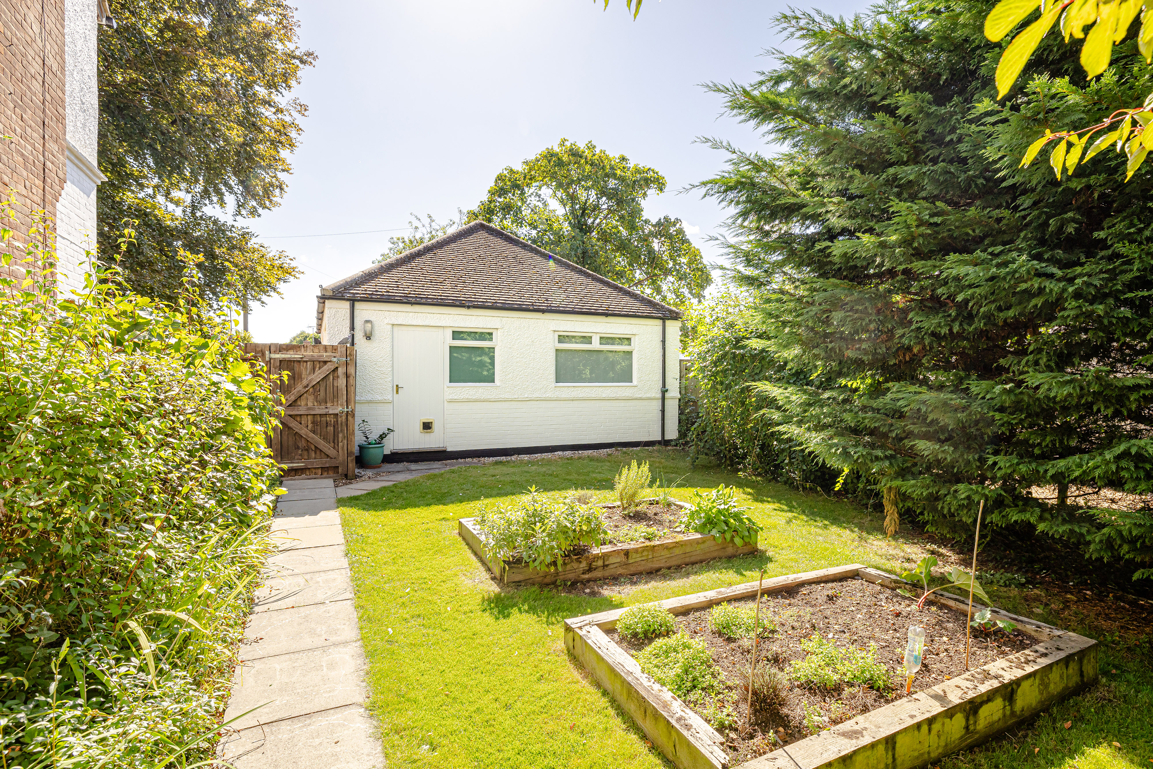 The meticulously maintained grounds boast a lush lawn and a variety of mature trees, creating a serene retreat that belies its closeness to local conveniences, further enhanced by a brick and timber-built outbuilding that adds versatility to the property.
