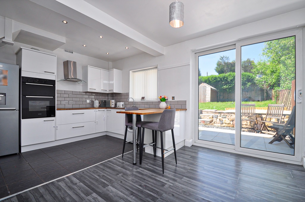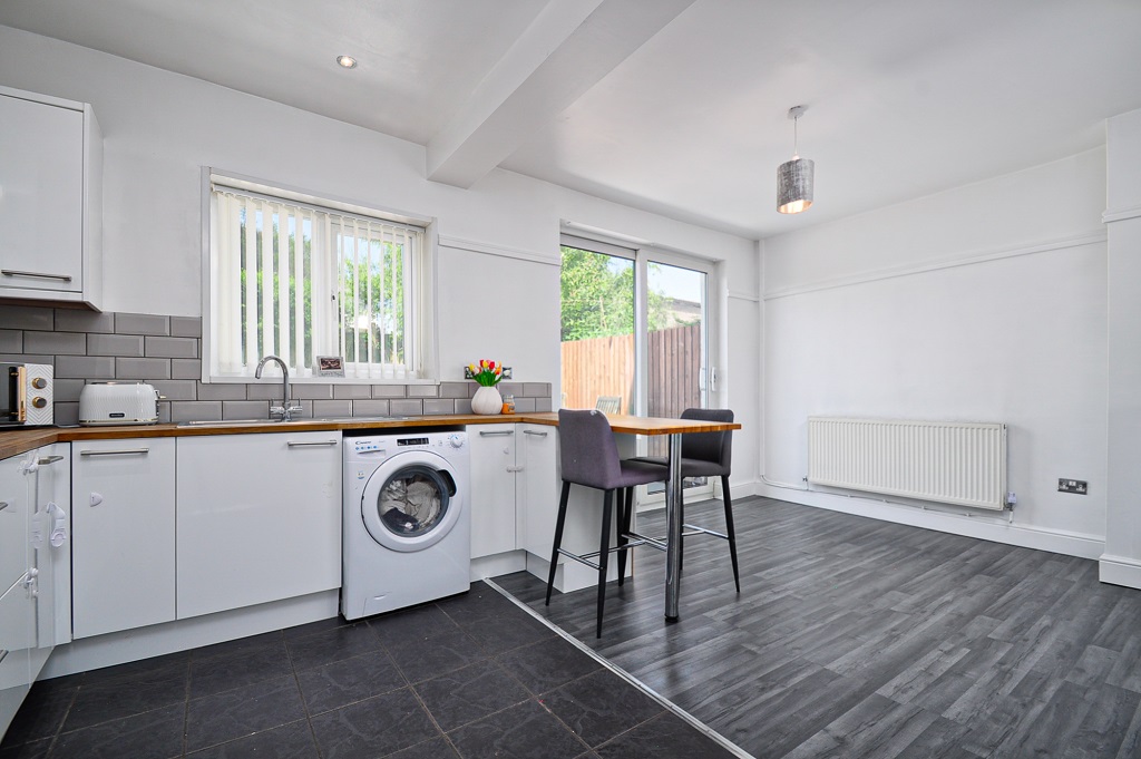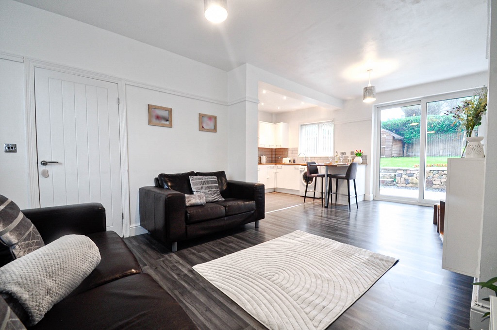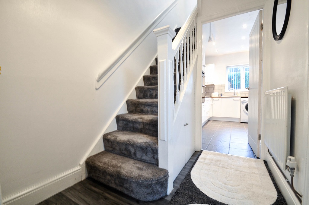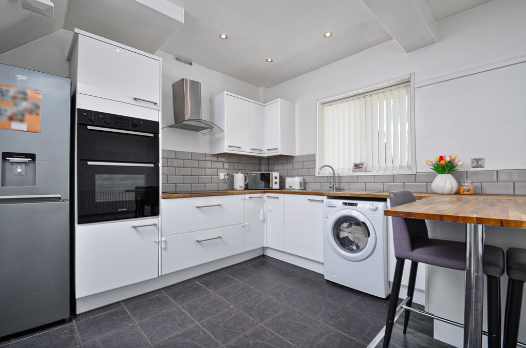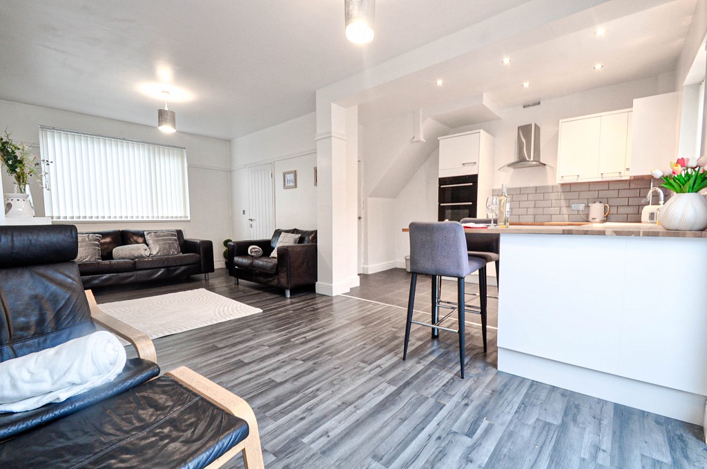 As you approach the front of house you are greeted with the potential for spacious off-road parking with enough room for two vehicles. The bright and airy hallway boasts new grey laminate flooring and provides access to the open plan living and kitchen area. The downstairs of the home has been newly renovated with white plastered walls and ceiling and new laminate flooring. The open plan kitchen offers plenty of work surface space upon the wooden work tops perfect for entertaining the whole family especially with the use of the breakfast bar with warming ambient lighting from the spotlights above. The kitchen offers ample white wall and base units with a grey tiled black splash. The first floor of the home offers two great sized welcoming double bedrooms with freshly fitted carpets and offering plenty of natural light throughout. The third single bedroom offers plenty of space for a single bed or could even be created into a home office. The rear facing family bathroom offers a full suite including 'P' shaped bath with shower and glass screen with beautiful grey tiles from floor to ceiling.