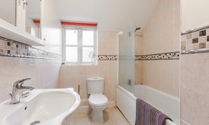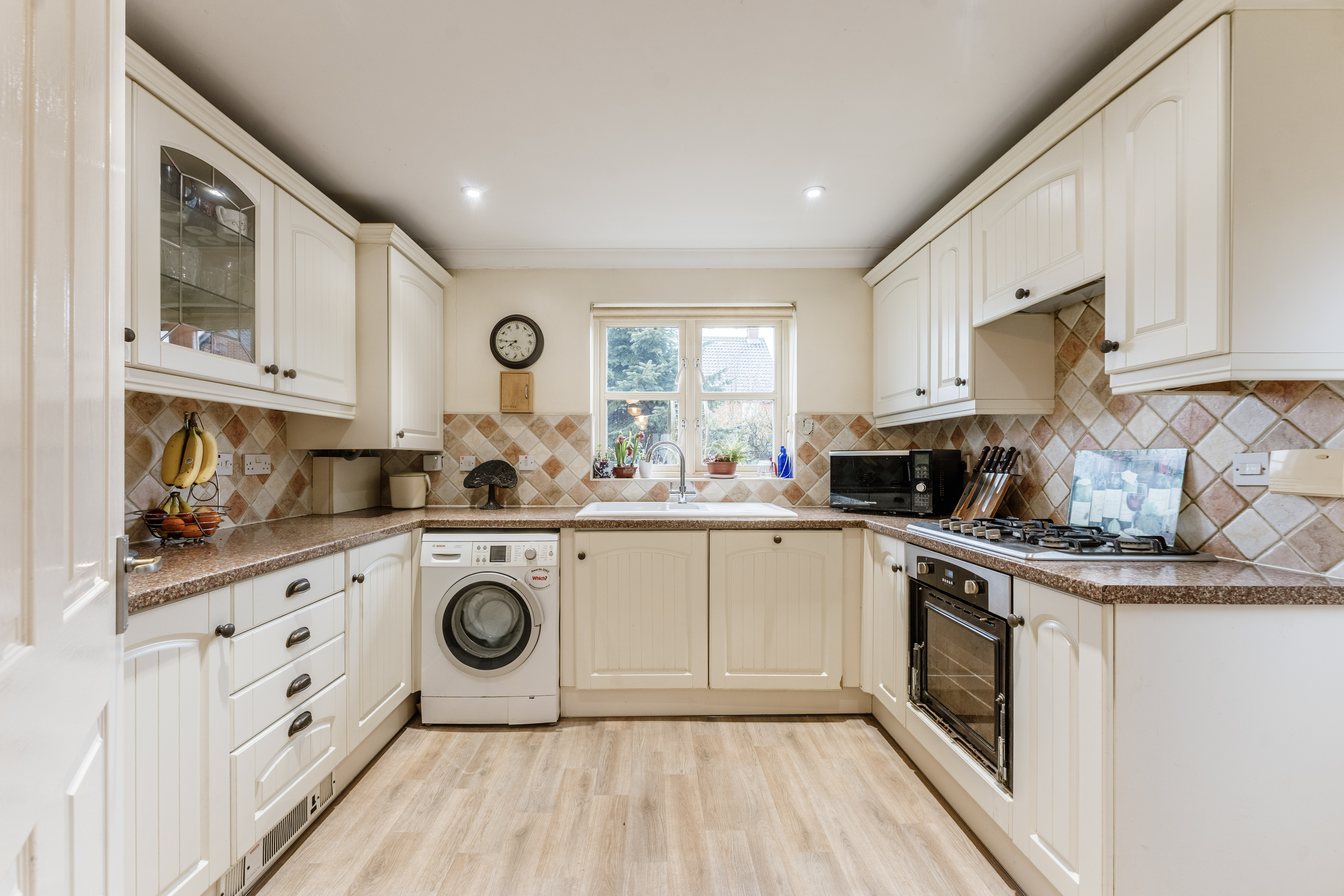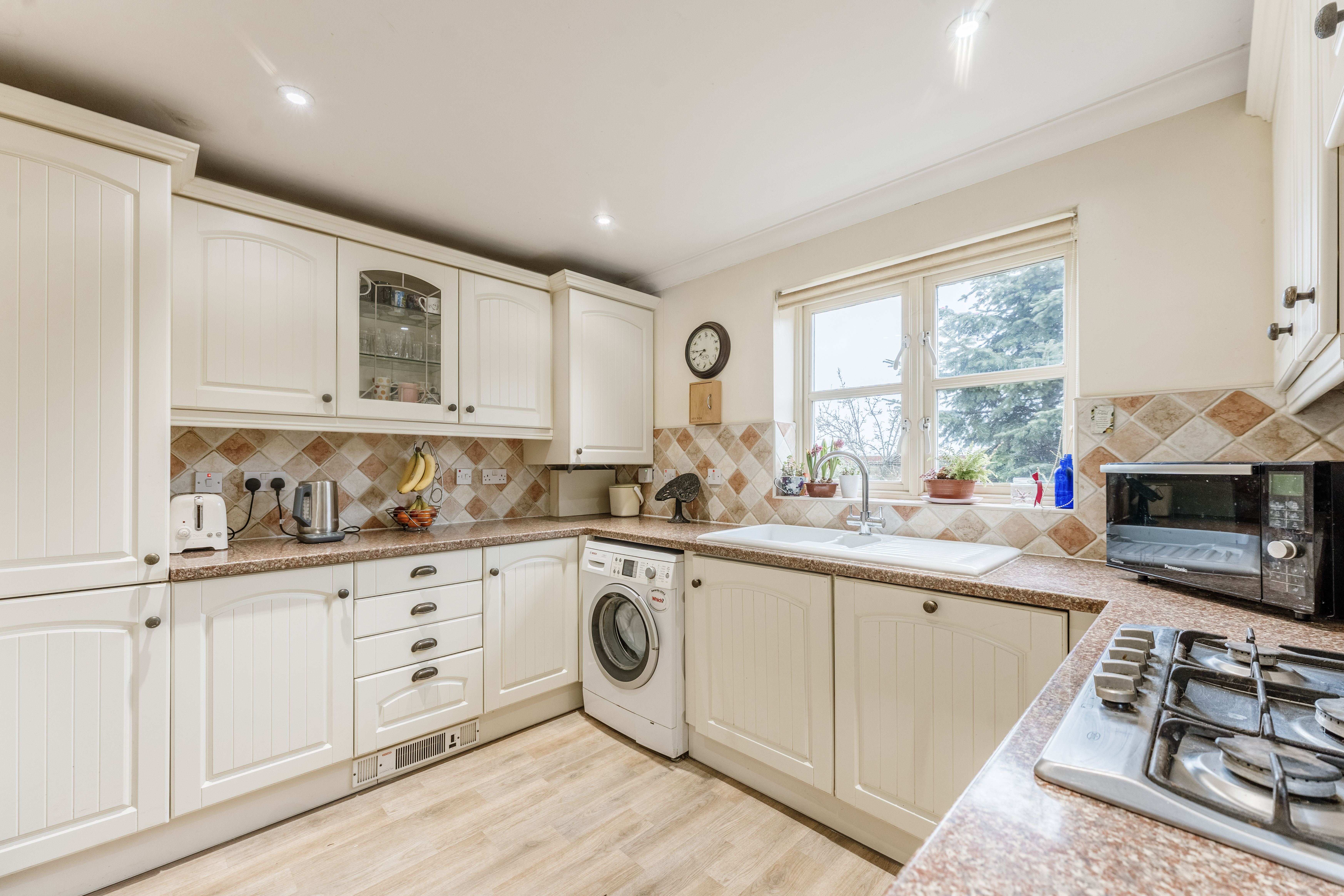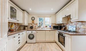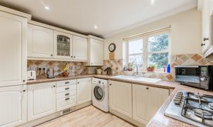 At the heart of the property, the kitchen/breakfast room is fitted with cabinetry and integrated appliances including an oven, dishwasher and fridge/freezer, alongside plumbing for a washing machine. There is ample space for informal dining, creating a natural hub for morning coffee, homework at the table or supper with friends.