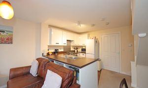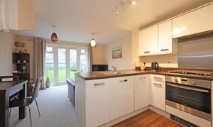Entrance hall with wood effect lino floor covering through to cloakroom WC and separate double cupboard, housing the central heating boiler. A door from the hallway leads to a modern open plan family layout, comprising kitchen area and living space with staircase to first floor and double patio doors opening onto the rear garden. The kitchen area is fitted with white gloss base/wall units and work surfaces extending to breakfast bar peninsula. There is a fitted electric oven and gas hob with splash back and integrated extractor.