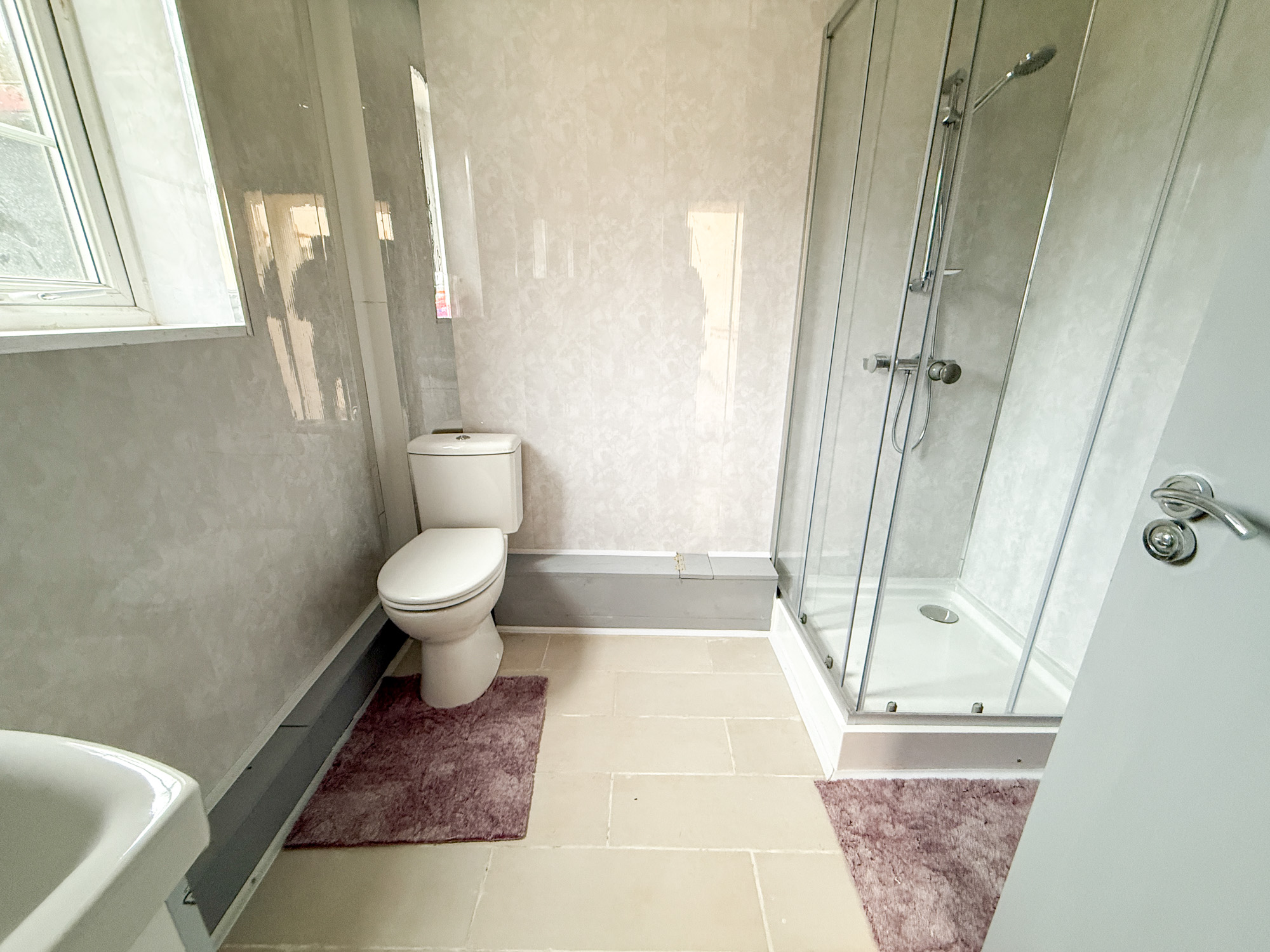 Shower cubicle, low level WC, wash hand basin with pedestal, UPVC double glazed window to side elevation