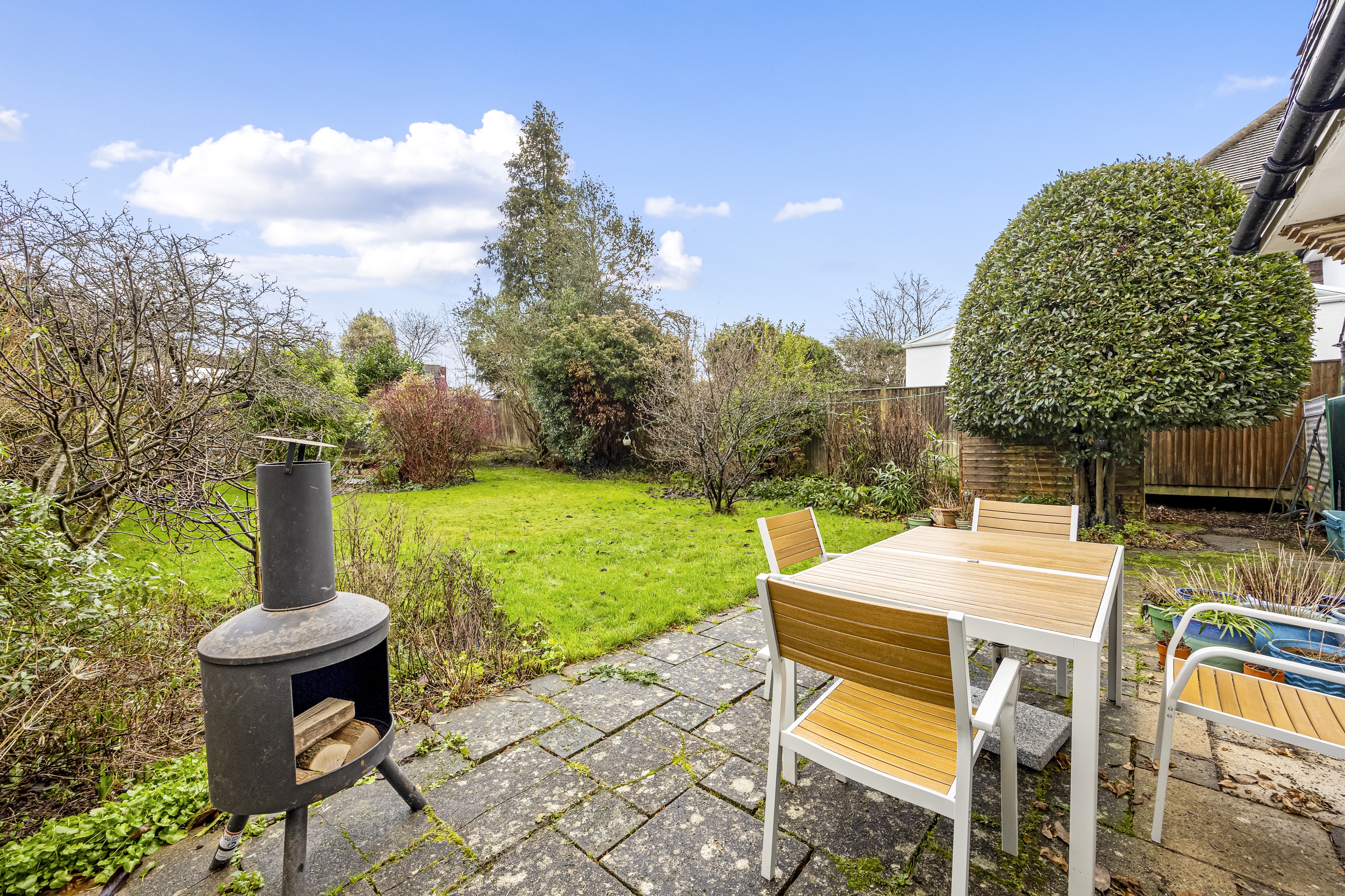 Externally, the home offers a driveway providing parking for multiple vehicles, along with a garage. The manageable rear garden is well established, featuring mature fruit trees and a patio area, perfect for outdoor dining and relaxation.
