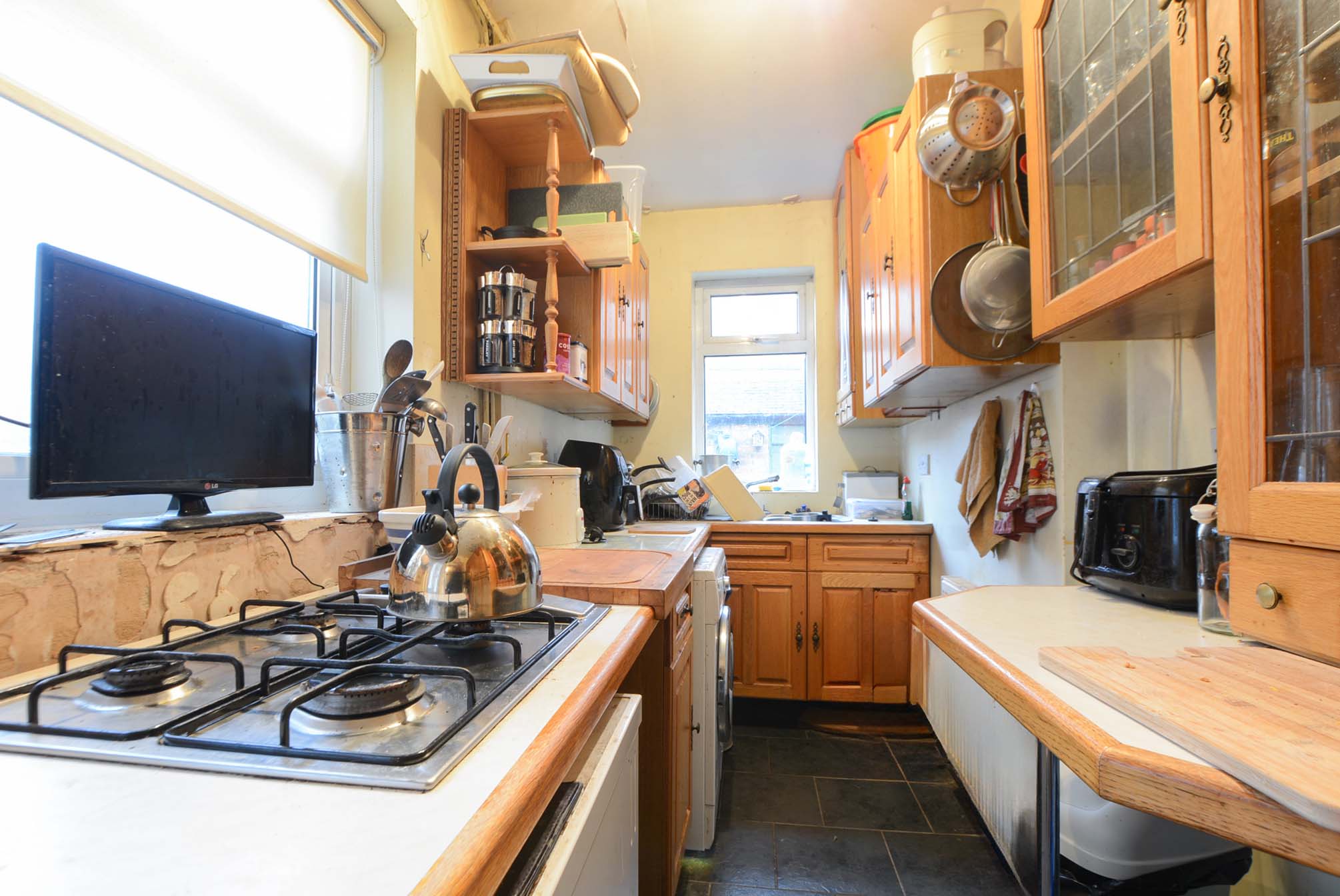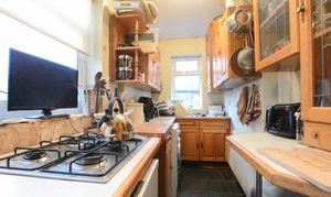 Features natural light from double-glazed windows to the side and rear elevations and a double-glazed door to the rear yard. Includes base and wall units with roll-edged work surfaces, a sink & drainer with mixer tap, a four-ring gas hob, plumbing for a washing machine, and a radiator.