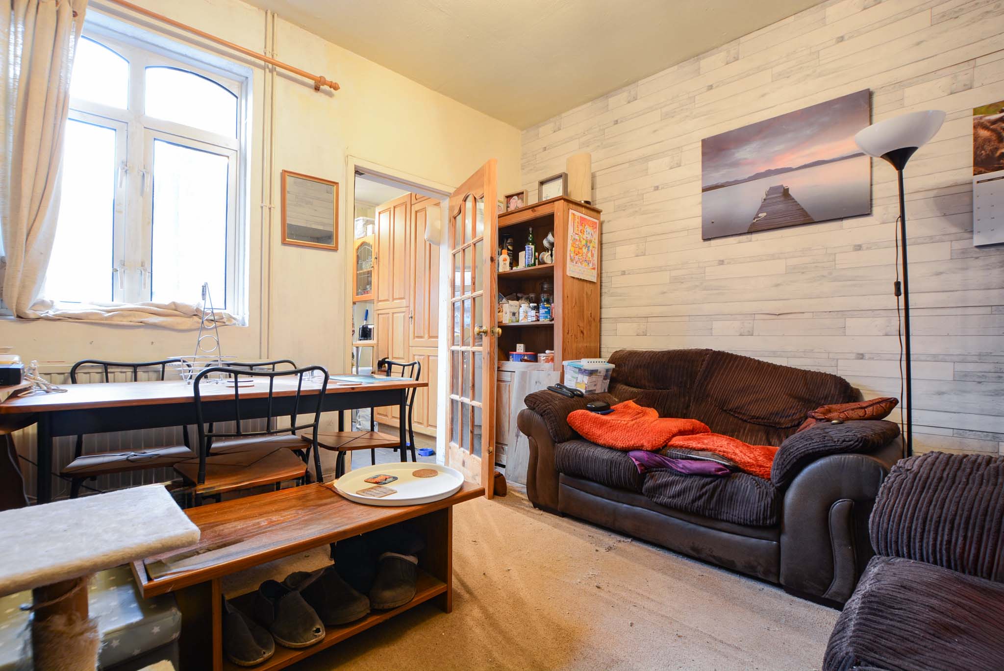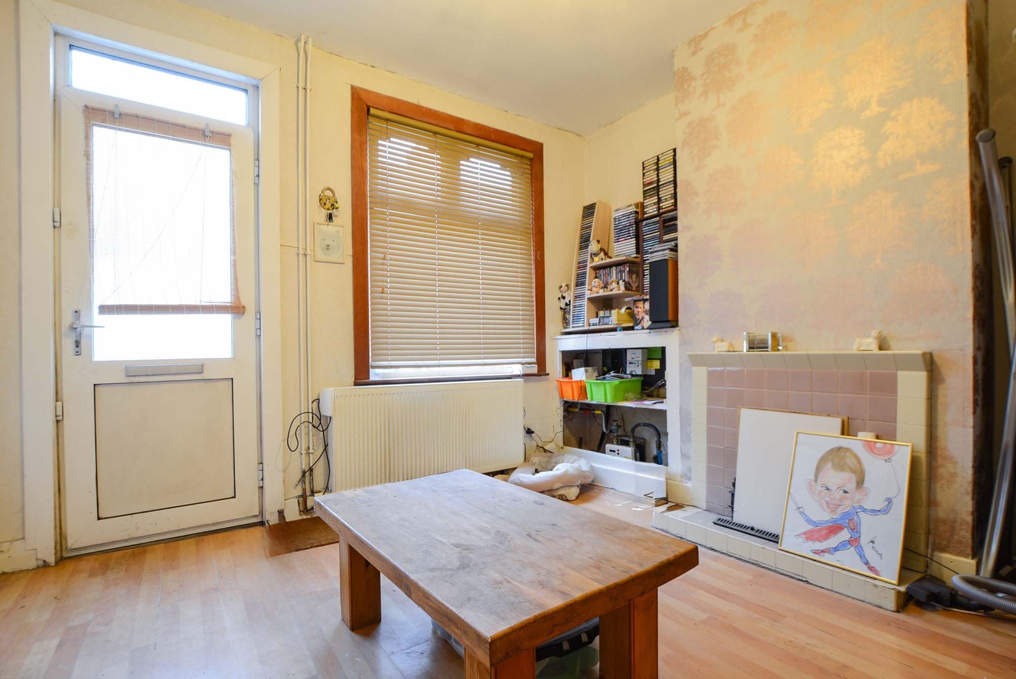 Features natural light from a double-glazed window to the rear elevation, wood-effect laminate flooring, a chimney breast, a TV point, a radiator, and access to the kitchen.