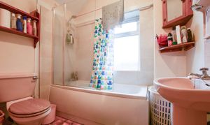 Features a double-glazed window to the rear elevation, a bath with mixer shower tap, a low-level WC, a wash hand basin, a built-in cupboard, and a radiator.