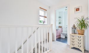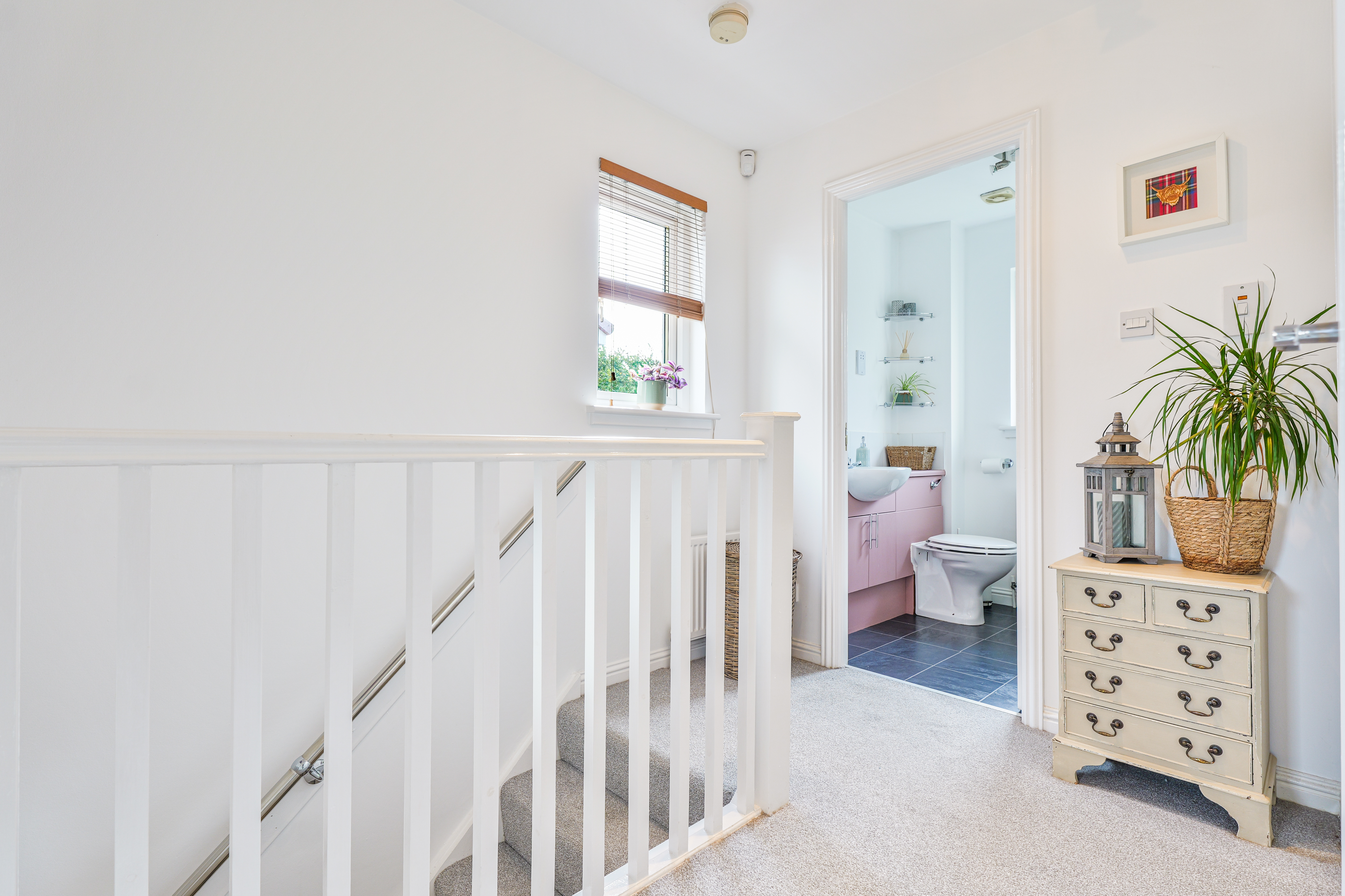 Carpeted staircase leading to upper level. Window located at upper landing providing natural light. Attic hatch with ramsay ladder leading to partially floored attic space. Linen cupboard located within upper hall.