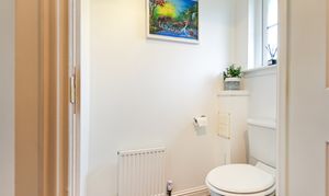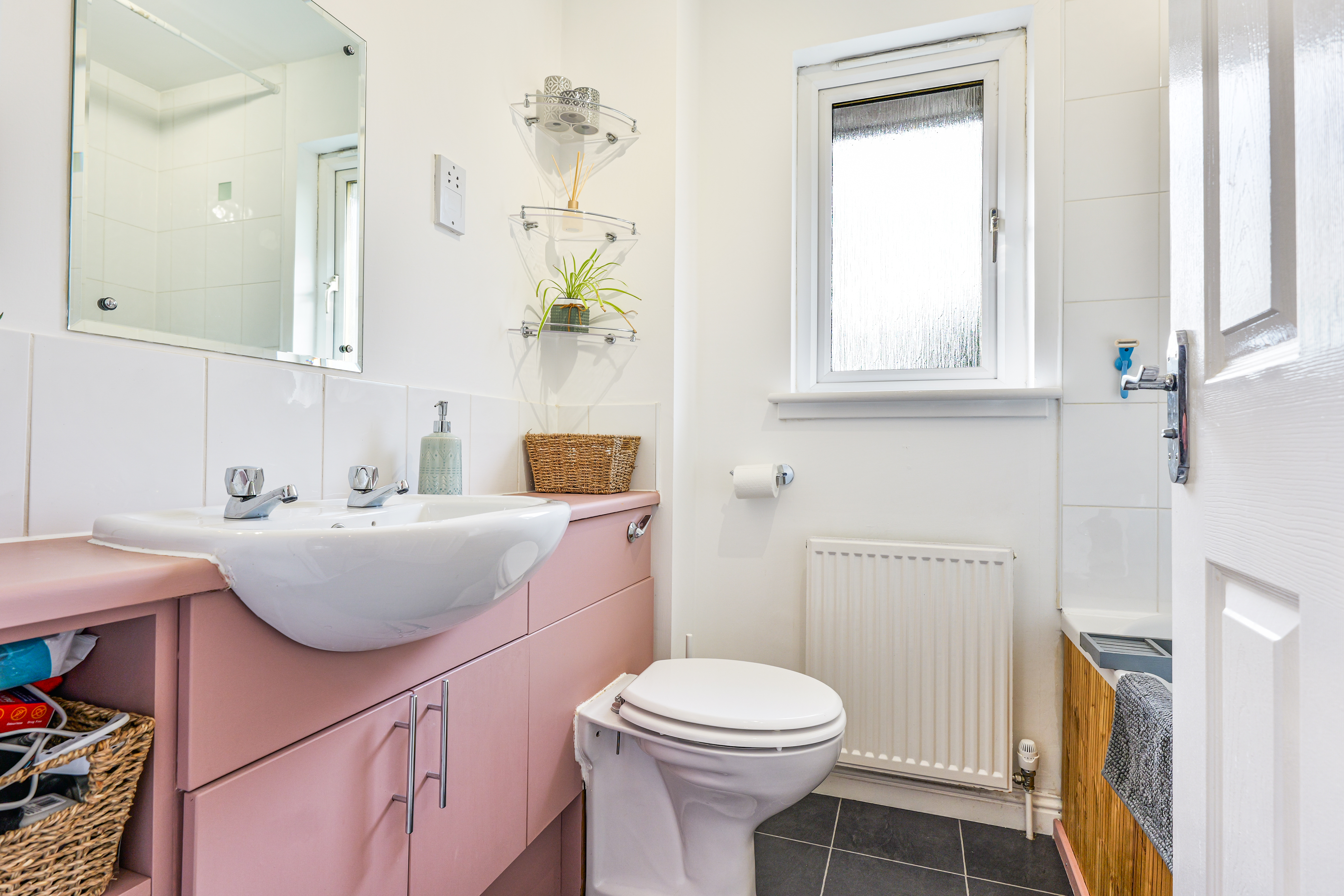 Featuring two piece suite comprising wash-hand basin and Wc. Opaque window. Light neutral decor.