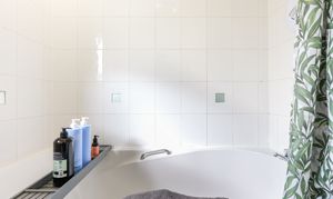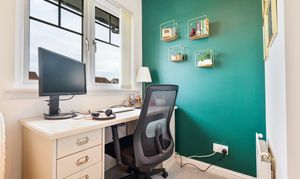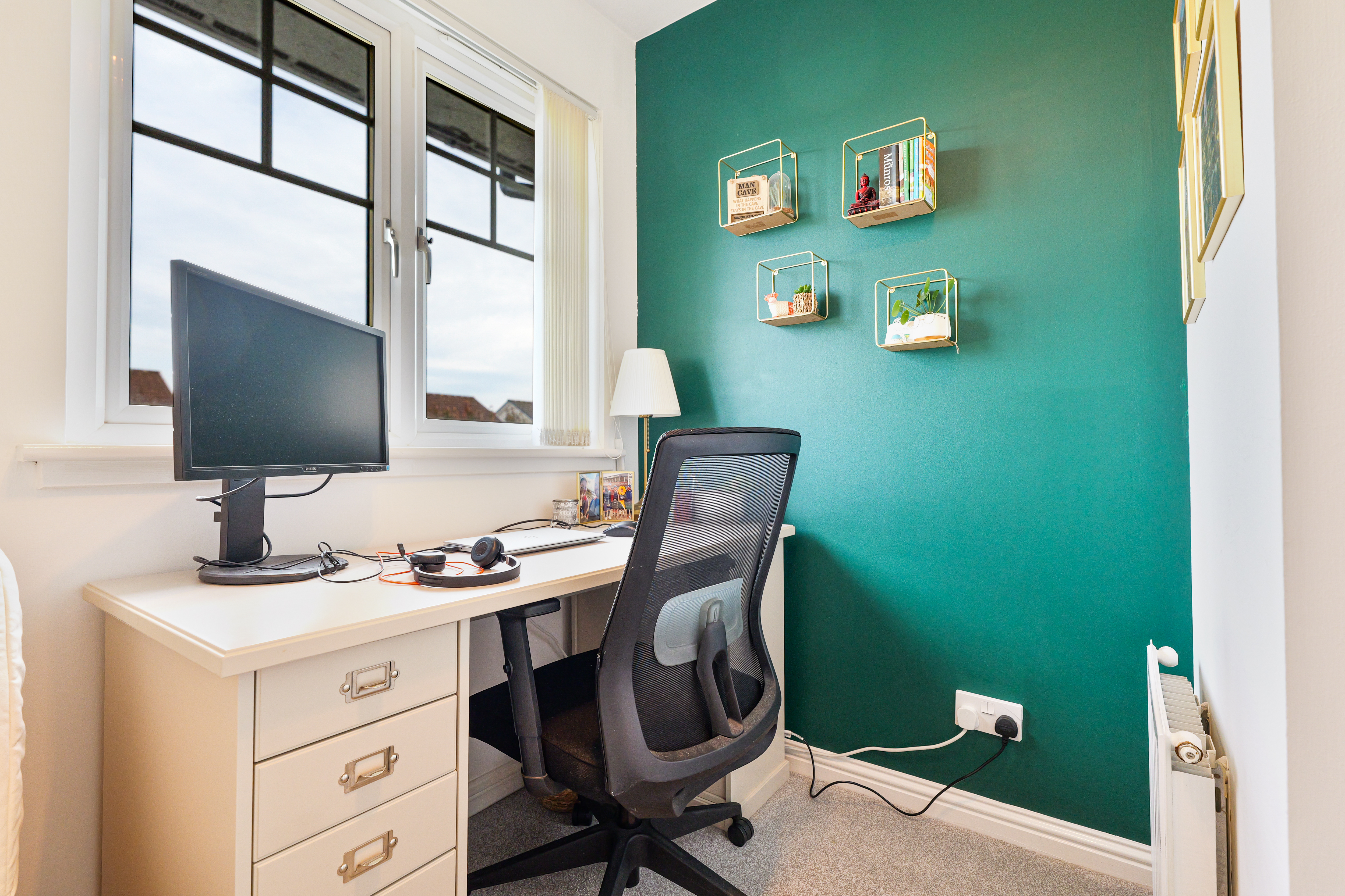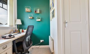 Bedroom Three is currently utilised as a home office. The room offers over-stair spacious storage cupboard and can accommodate single bedroom furniture if desired. Bold feature wall complemented by neutral decor.