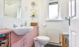 The family Bathroom features three piece suite comprising wash-hand basin and Wc encompassed within vanity storage unit, bath (with electric shower set over). Opaque window providing natural light. Tiling to floor.