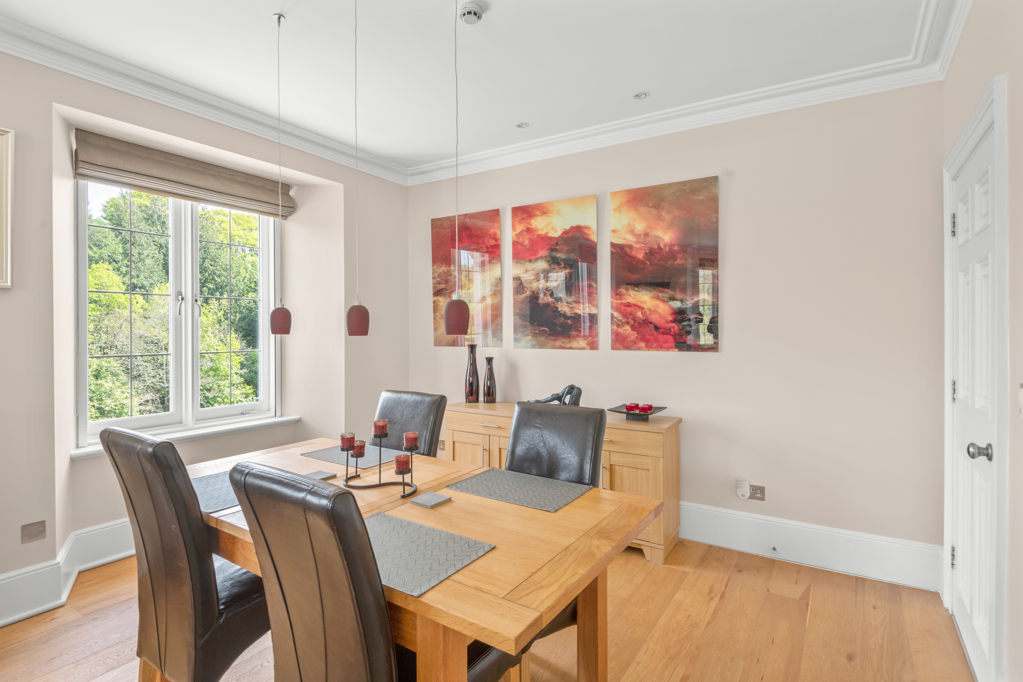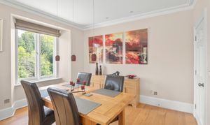 The adjacent living and dining room is the heart of the home — a space designed for both relaxation and entertaining. Flooded with natural light from its double-aspect windows, the room enjoys sweeping views over the estate’s parkland and serene lake. A charming window seat invites you to pause and take it all in — the perfect place for a morning coffee, a good book, or simply watching the seasons unfold across the landscape.