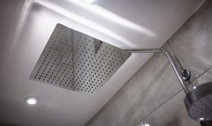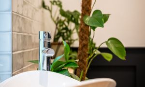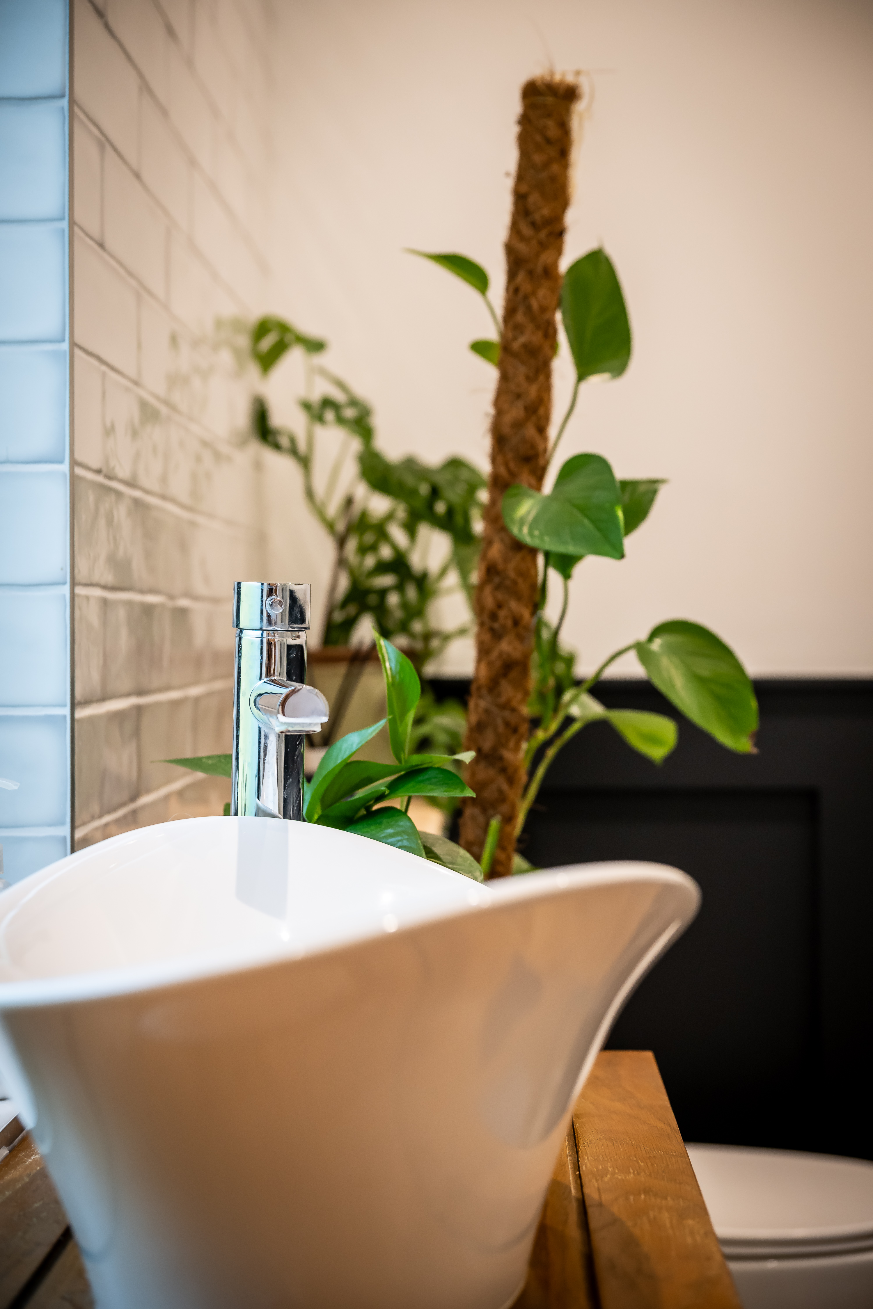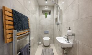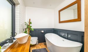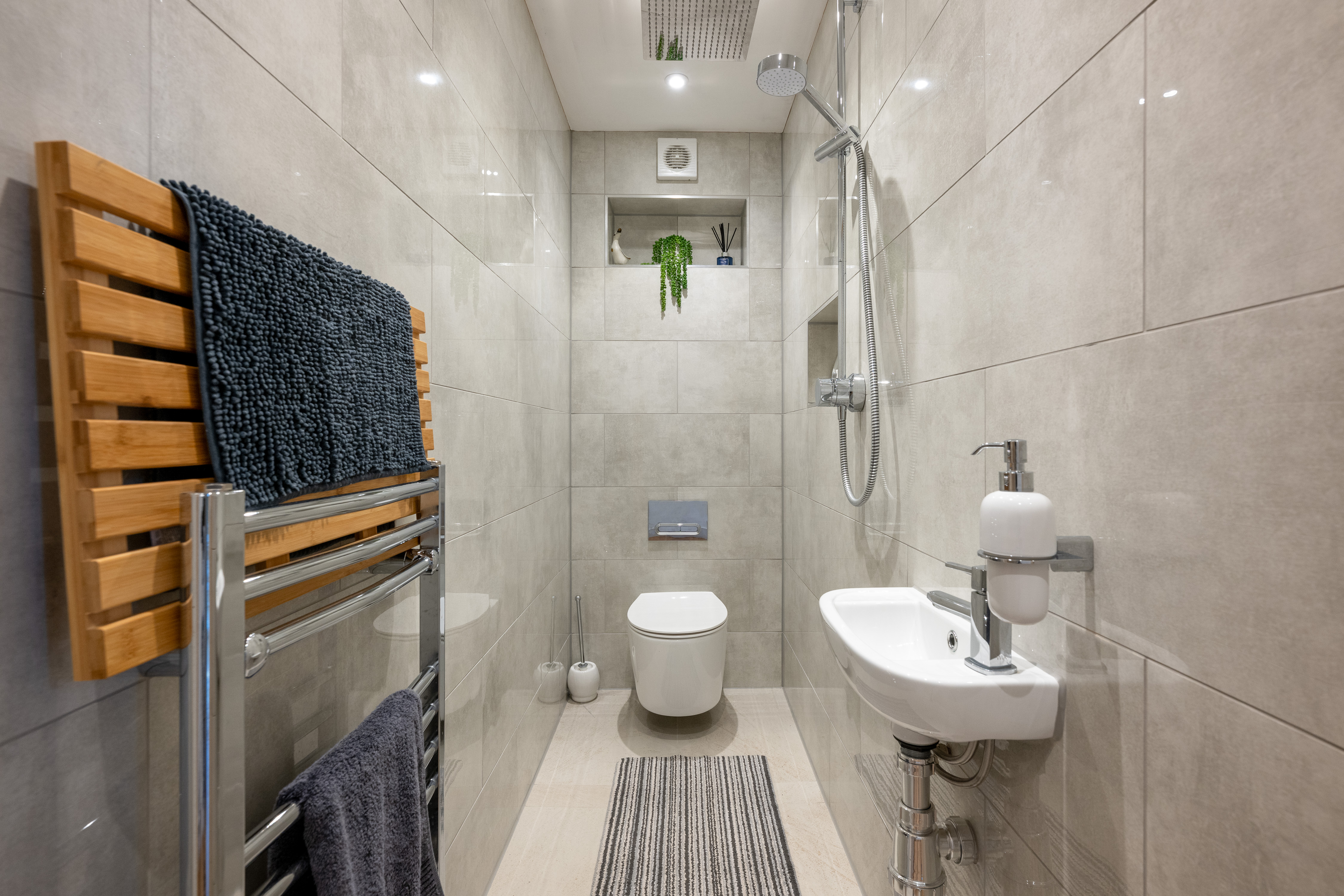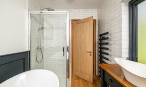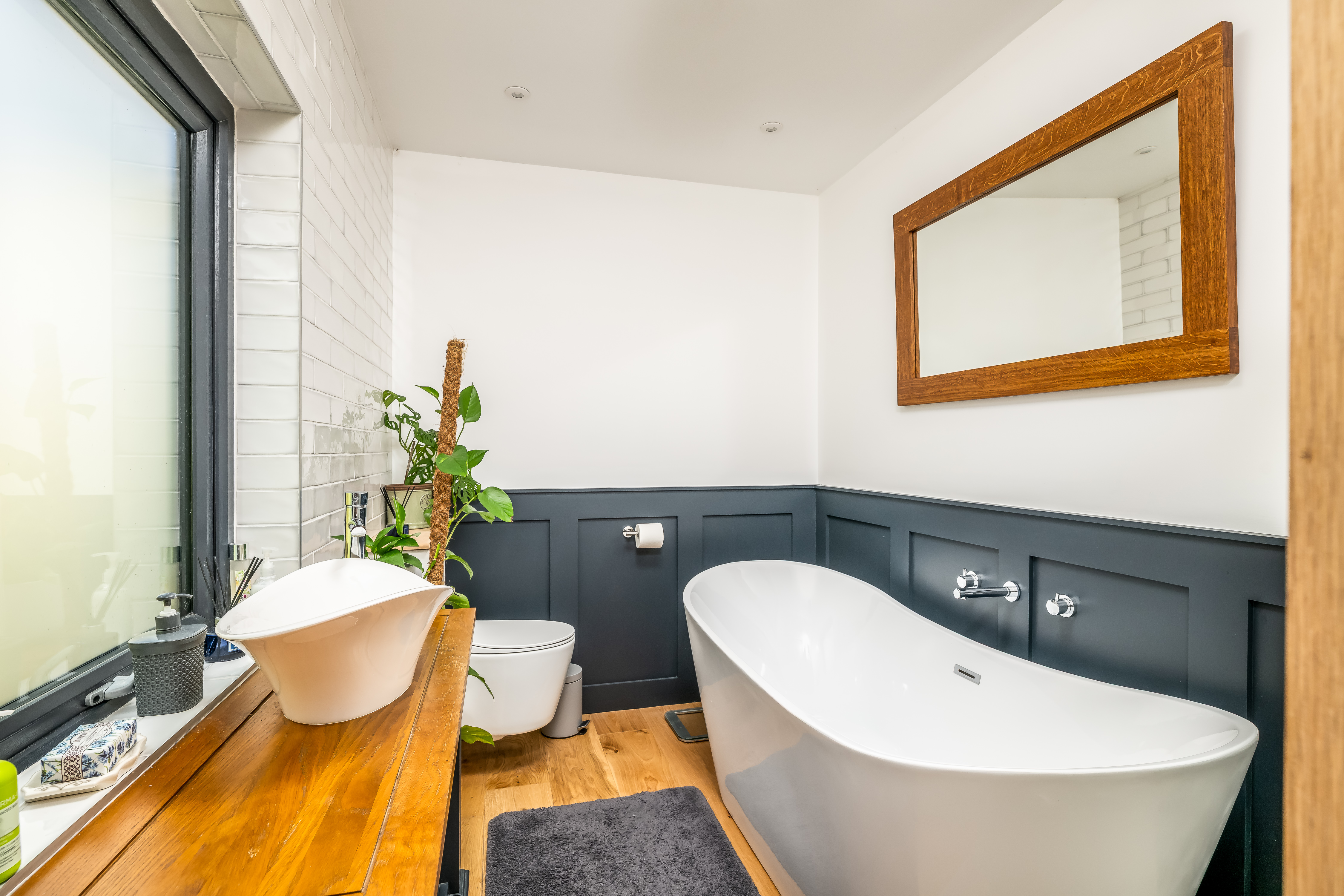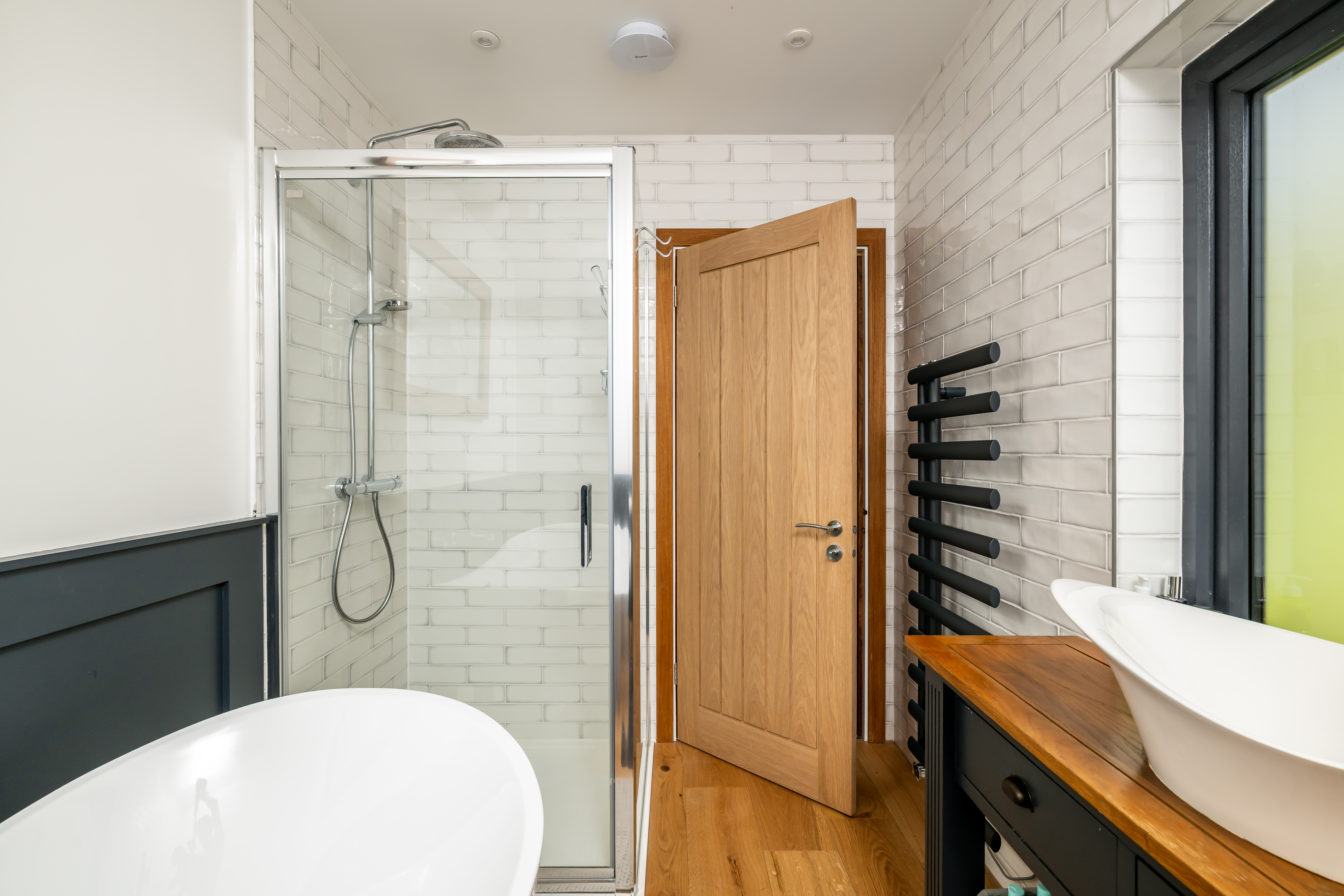 Bedroom one is a generous double, dual aspect, and has the advantage of an en suite. This has a fabulous four-piece suite of a W.C., a sink, a shower with a rainhead, and a freestanding bath with side taps. There’s wood flooring, brick tiling and navy-blue wall panelling. Off the kitchen is bedroom two, another double, joined by a fully tiled wet room with a W.C., a small sink and an oversized rainhead shower.