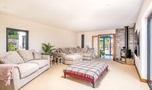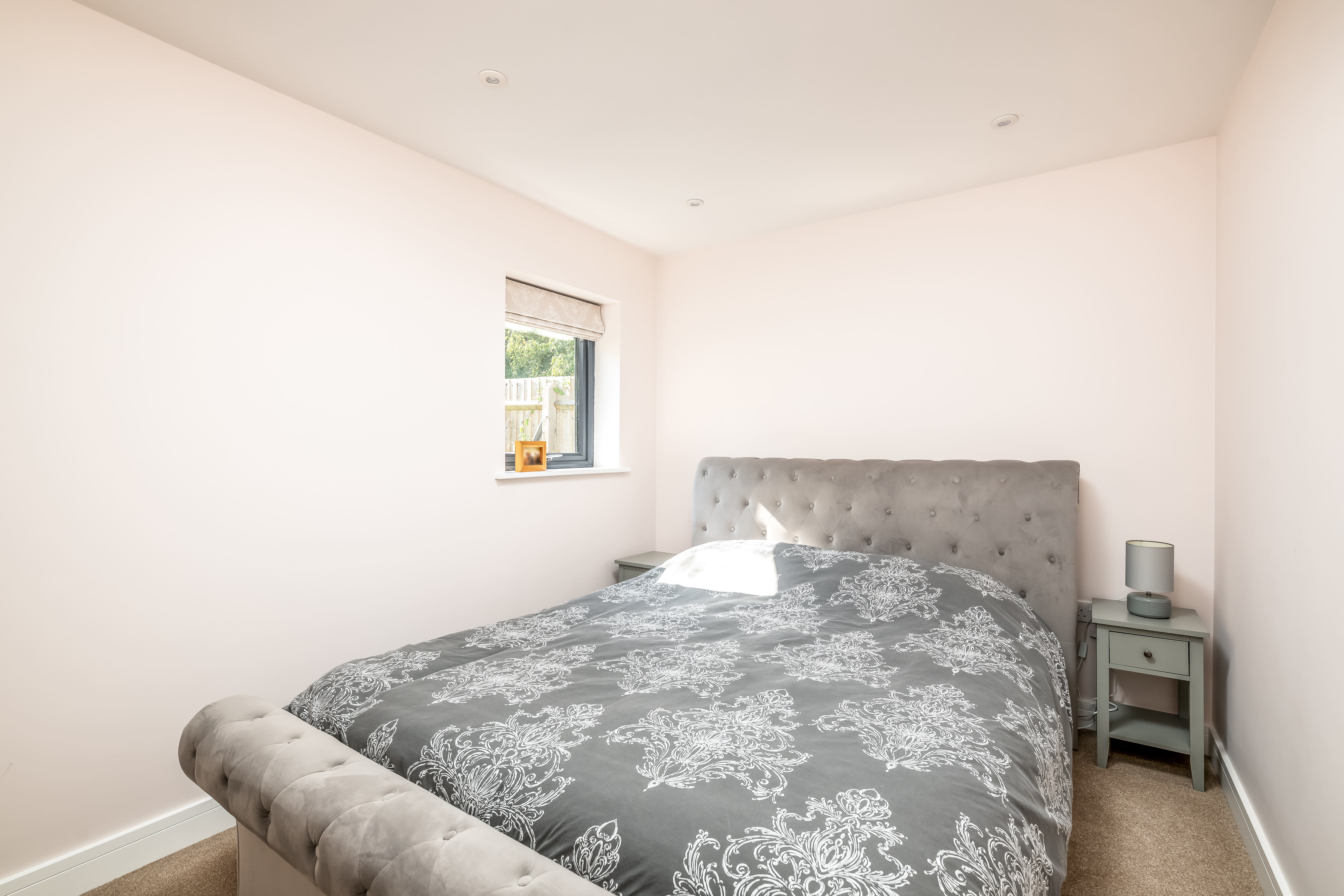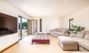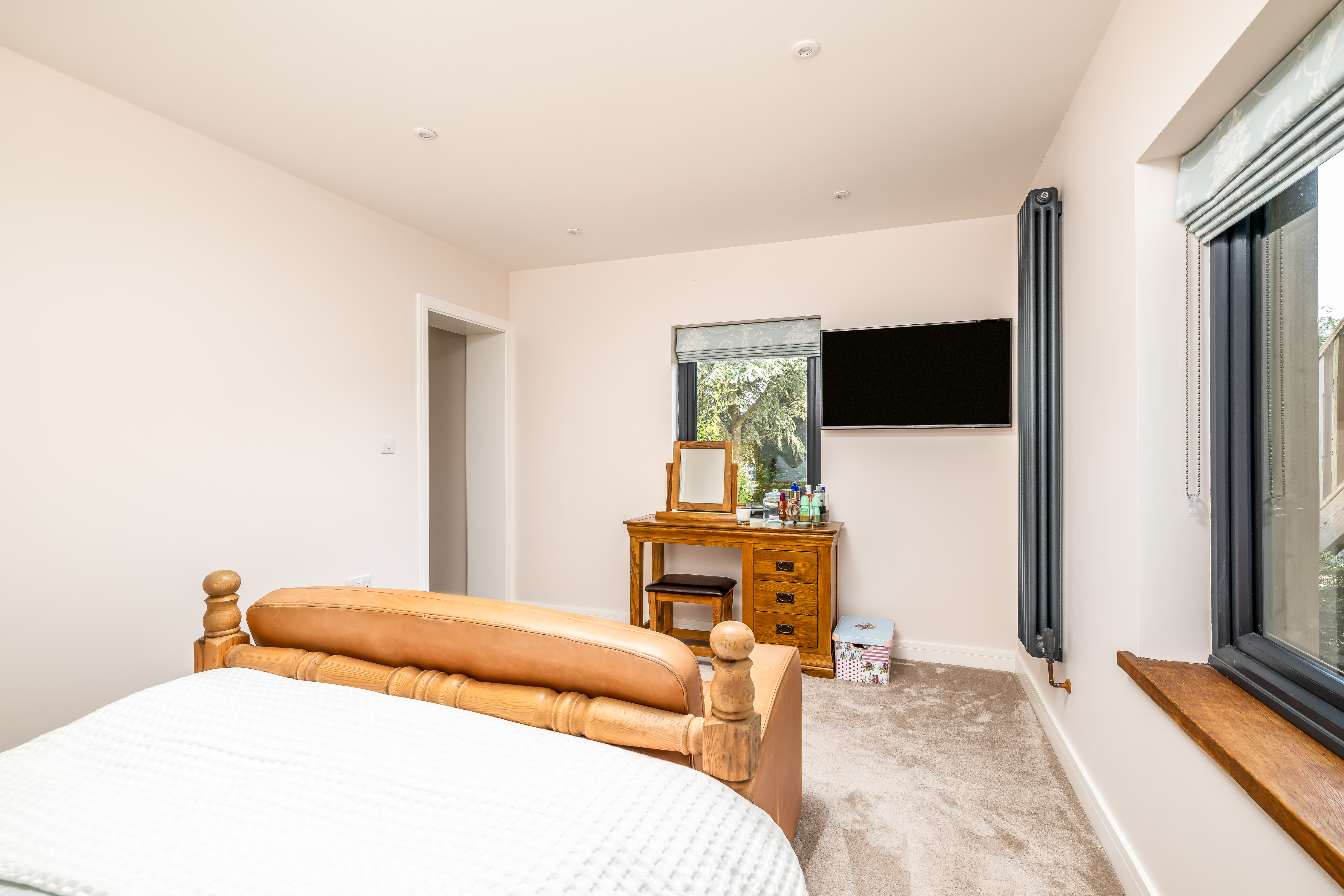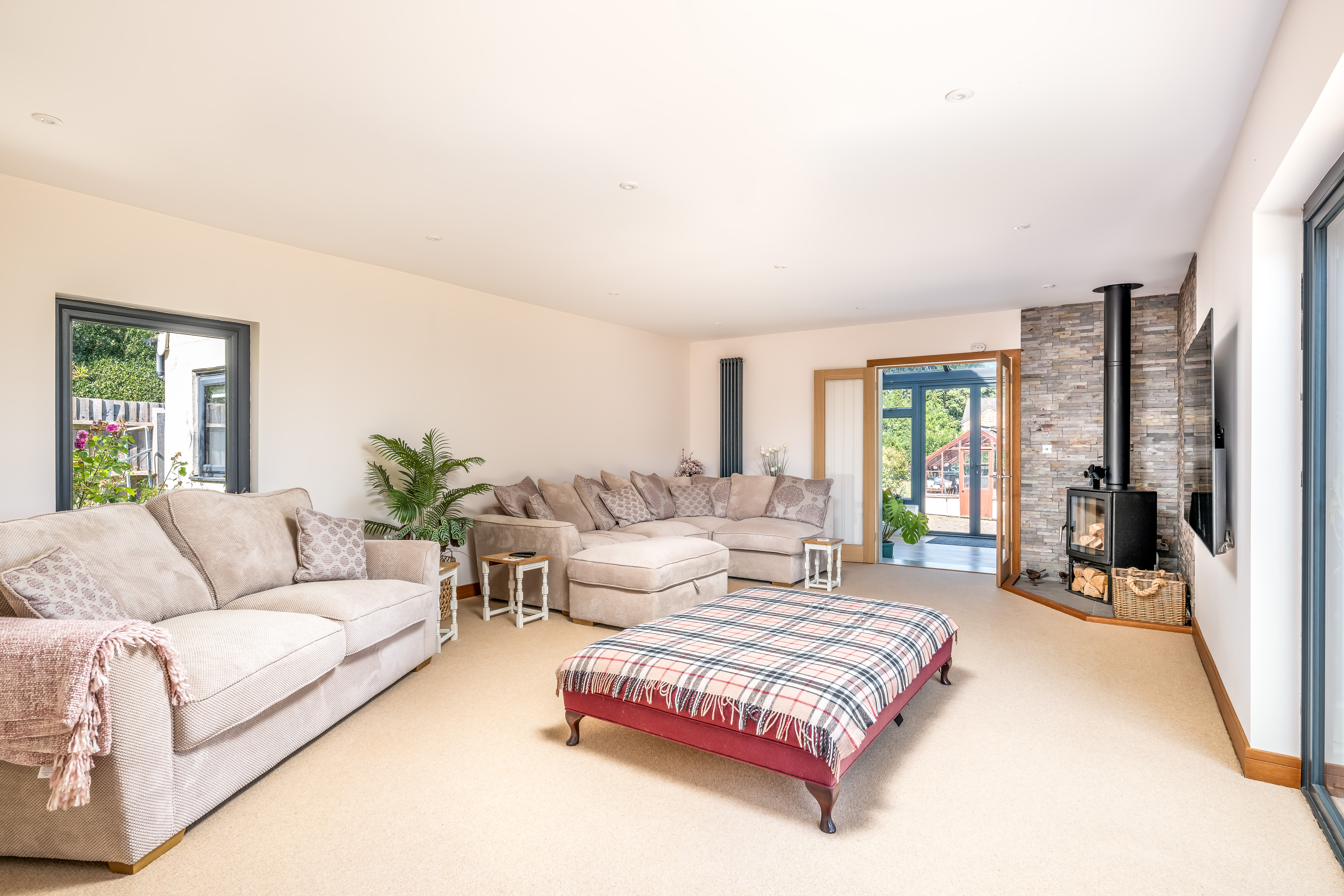 Up a step and through glazed double doors from the dining area is the lounge. This is super-spacious, very light, while still with a cosy feel, perfect for wintry nights on the sofa, as well as summer days with the French doors wide open. The log burner in the corner adds to the cosiness, and there’s carpeting for softness underfoot. Next to the lounge is a flexible room, currently used as a third bedroom, but with the option as a playroom for little ones, an office for homeworkers, or an adjoining dressing room to bedroom one.