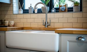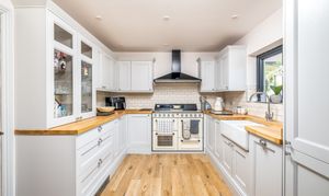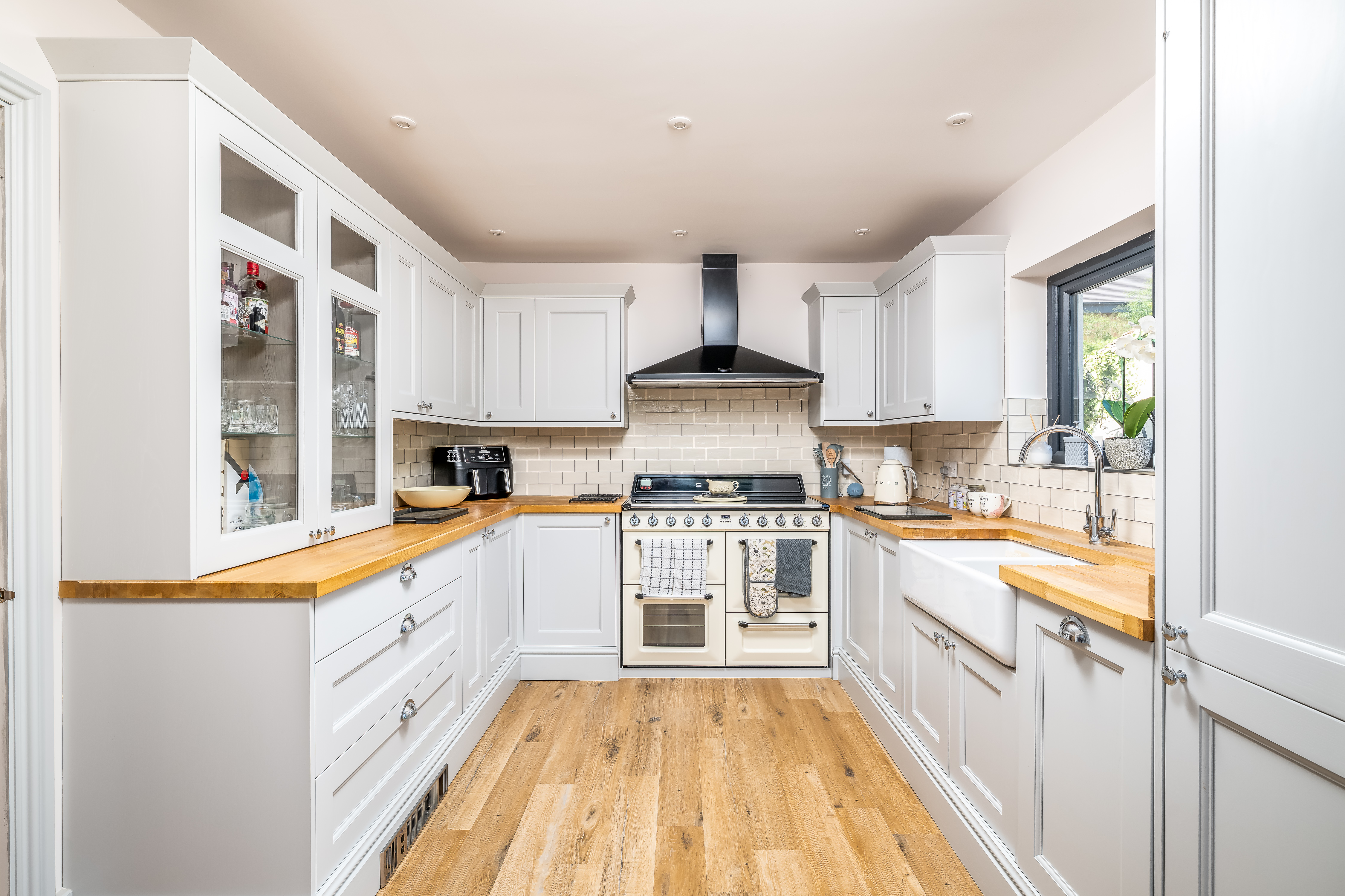 The kitchen area is fitted in classic Shaker cabinetry with wood surfacing and brick-tiled splashbacks. There’s a double ceramic butler sink, an integrated dishwasher and fridge/freezer, plus a gap for a range oven under a wide extractor. Further storage is available to a pantry cupboard, a shelf in the boiler cupboard, and to the external utility.