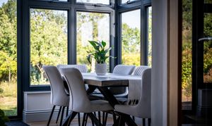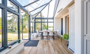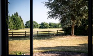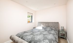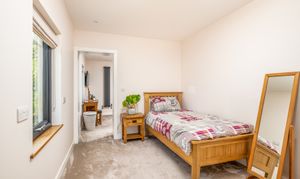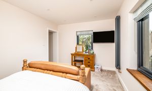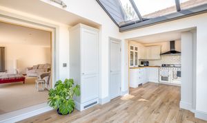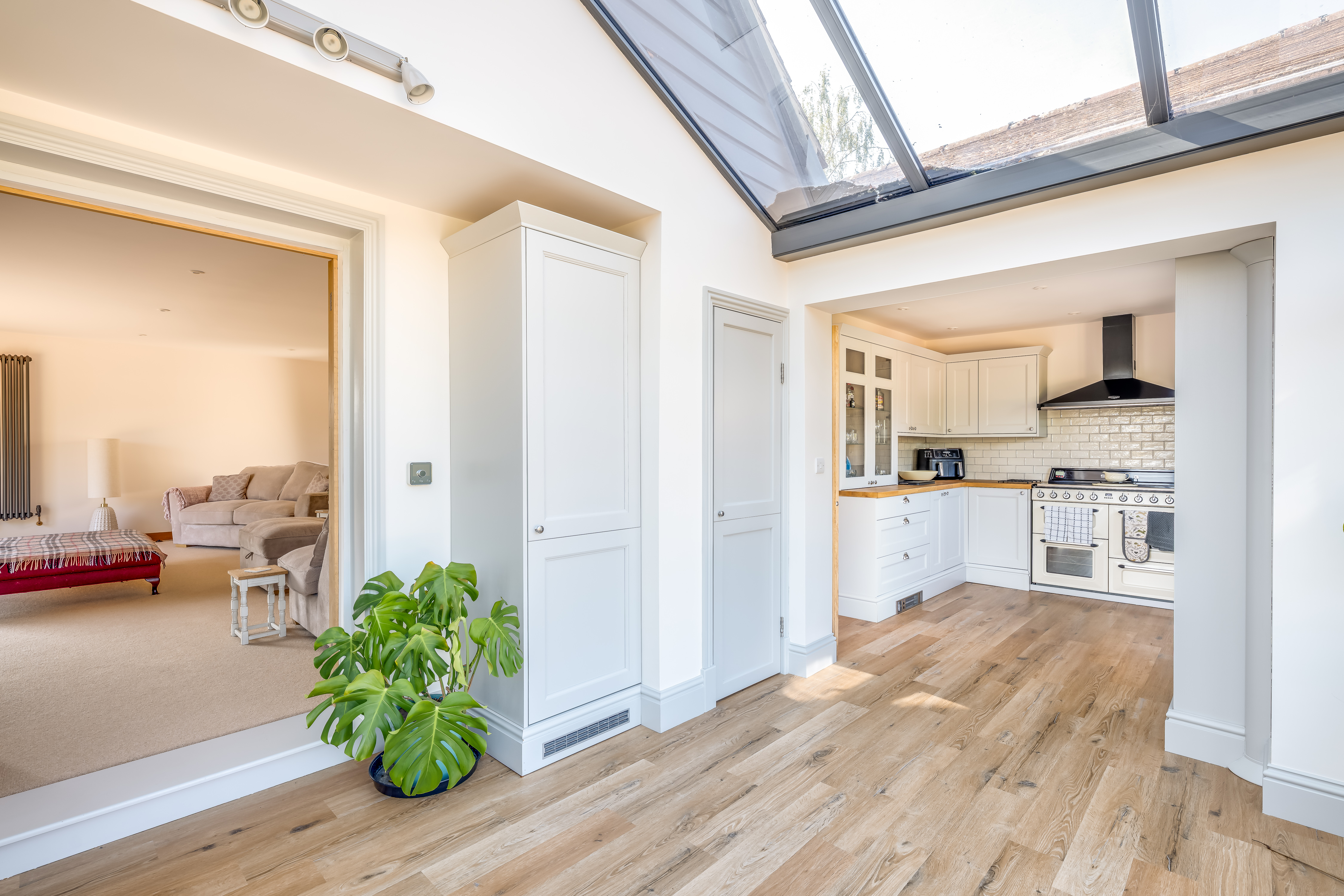 The kitchen/diner is on the eastern side of the home, with French doors onto the garden, and a pitched, glazed roof that floods the space with sunlight. Imagine hosting in here, impressing your guests with outlooks over the land. Wood flooring runs throughout, and there are stone sills around the seating area ideal for placing plants and ornaments.