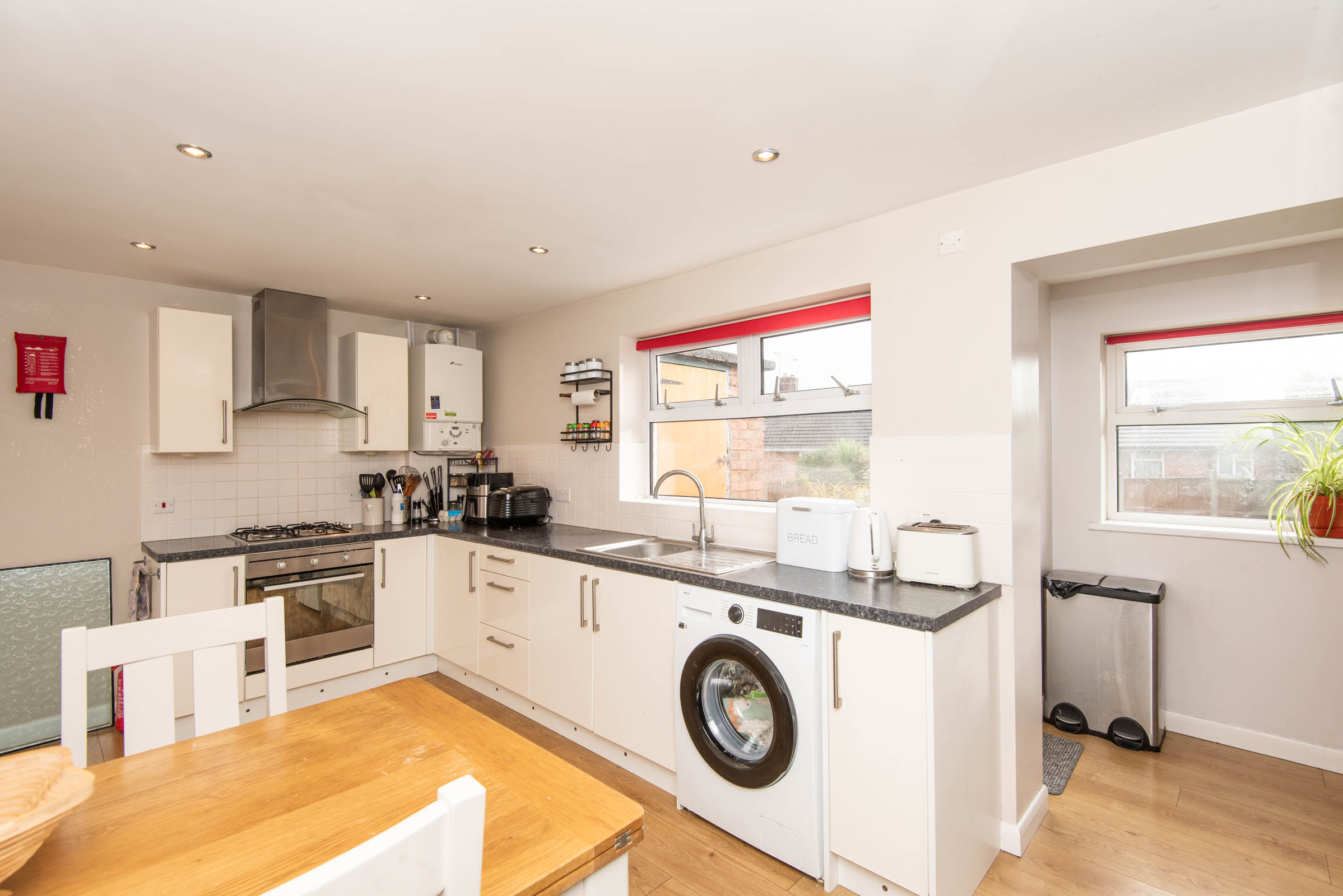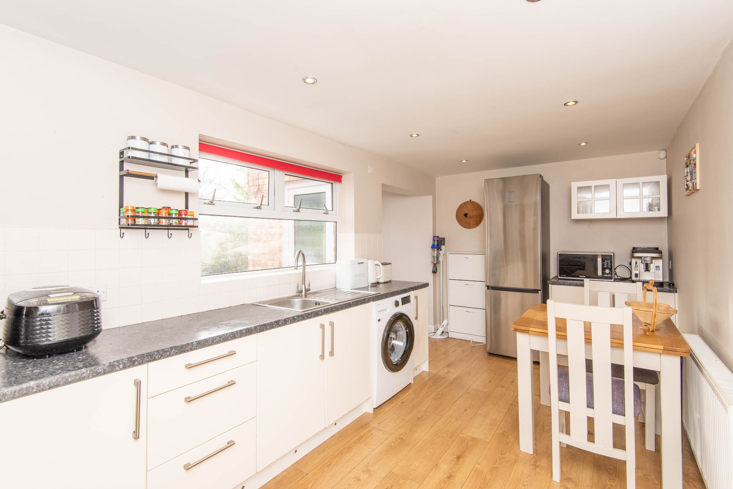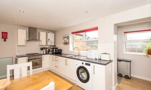 The ground floor features a good-sized lounge with a bay window, providing natural light and a flexible living space. At the rear, a spacious open-plan kitchen and dining area is fitted with modern units and ample worktop space, overlooking the low-maintenance garden, which is perfect for relaxing or entertaining.