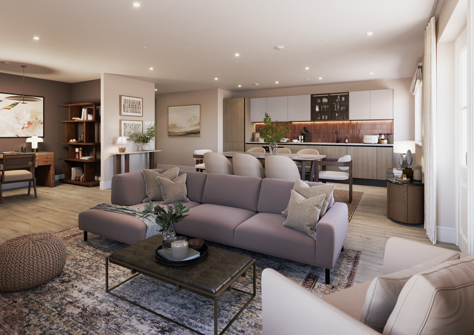 A light-filled and versatile living zone with space for relaxation and entertaining. Full-height windows allow natural light to flood the room, while the wood-effect laminate flooring and soft neutral palette create an elegant, timeless backdrop.