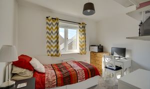 Spacious double bedroom with ample space for large bed and bedside furniture. Window to front aspect enjoying attractive outlook. Full width fitted mirrored wardrobes providing a good amount of hanging and shelving space. LAN and double socket perfect for a TV. Door into ensuite.