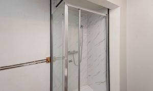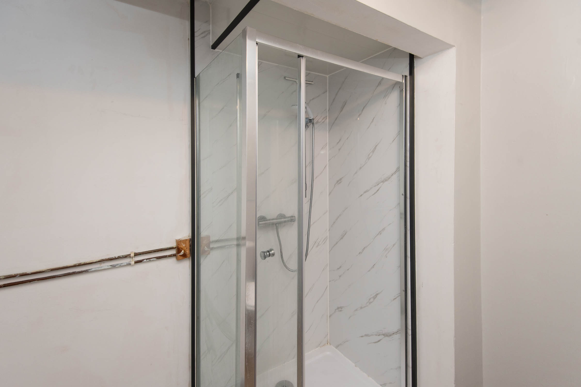 The spacious bedroom in this apartment boasts ample storage space with a convenient storage cupboard, ensuring that your belongings are neatly tucked away. Adjacent to the bedroom is a sleek shower room, adding a touch of practicality to your daily routine.