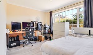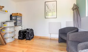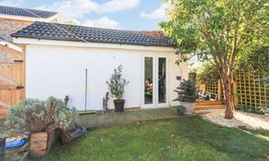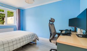 All three bedrooms are well-proportioned and served by a contemporary wet-room style bathroom, complete with sleek fittings and tiled finishes. One of the standout features is the partly converted garage, now functioning as a smart home office—ideal for hybrid working or creative pursuits.